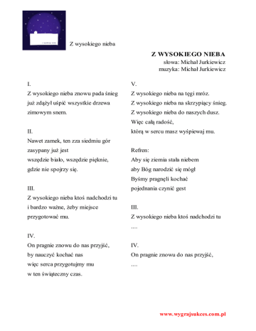 Z wysokiego nieba Z WYSOKIEGO NIEBA słowa: Michał Jurkiewicz muzyka: Michał Jurkiewicz I. V. Z wysokiego nieba znowu pada śnieg Z wysokiego nieba na tęgi mróz. już zdążył uśpić wszystkie drzewa Z wysokiego nieba na skrzypiący śnieg. zimowym snem. Z wysokiego nieba do naszych dusz. Więc całą radość, II. którą w sercu masz wyśpiewaj mu. Nawet zamek, ten zza siedmiu gór zasypany już jest Refren: wszędzie biało, wszędzie pięknie, Aby się ziemia stała niebem gdzie nie spojrzy się. aby Bóg narodzić się mógł Byśmy pragnęli kochać III. pojednania czynić gest Z wysokiego nieba ktoś nadchodzi tu i bardzo ważne, żeby miejsce III. przygotować mu. Z wysokiego nieba ktoś nadchodzi tu .... IV. On pragnie znowu do nas przyjść, IV. by nauczyć kochać nas On pragnie znowu do nas przyjść, więc serca przygotujmy mu .... w ten świąteczny czas. www.wygrajsukces.com.pl V. Z wysokiego nieba na tęgi mróz. .... Refren: Aby się słowo stało chlebem. Wielki bóg narodził się tu. Byśmy pragnęli kochać pojednania czynić gest. www.wygrajsukces.com.pl