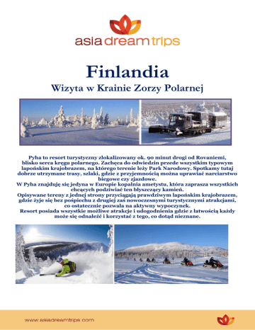 Finlandia Wizyta w Krainie Zorzy Polarnej Pyha to resort turystyczny zlokalizowany ok. 90 minut drogi od Rovaniemi, blisko serca kręgu polarnego. Zachęca do odwiedzin przede wszystkim typowym lapońskim krajobrazem, na którego terenie leży Park Narodowy. Spotkamy tutaj dobrze utrzymane trasy, szlaki, gdzie z przyjemnością można uprawiać narciarstwo biegowe czy zjazdowe. W Pyha znajduję się jedyna w Europie kopalnia ametystu, która zaprasza wszystkich chcących podziwiać ten błyszczący kamień. Opisywane tereny z jednej strony przyciągają prawdziwym lapońskim krajobrazem, gdzie żyje się bez pośpiechu z drugiej zaś nowoczesnymi turystycznymi atrakcjami, co ostatecznie pozwala na aktywny wypoczynek. Resort posiada wszystkie możliwe atrakcje i udogodnienia gdzie z łatwością każdy może się odnaleźć i korzystać z tego, co dotąd nieznane. Program: 1/ Witamy w krainie zorzy Przylot do Rovaniemi, spotkanie z rezydentem i zakwaterowanie w domku z bali na terenie resortu Pyha, kolacja w restauracji 2/ Spotkanie na kręgu polarnym Po śniadaniu w hotelowej restauracji krótki transfer do bazy Pyhasafaris i wyposażenie gości w komplety ubrań zimowych. Przejażdżka skuterami śnieżnymi nad zamarznięte jezioro z ogniskiem w lapońskim szałasie Lunch i wizyta w centrum przyrodniczym Naava Wycieczka w rakietach śnieżnych i łowienie ryb pod lodem Kolacja w lokalnej restauracji 3/ Kamień szamanów Wycieczka do kopalni ametystu, wyjazd na szczyt Snowcatem Lunch Przejażdżka gokartami po lodzie w tym zawody rodzinne z medalami !!! Kolacja w hotelowej restauracji 4/ Wizyta w wiosce Mikołaja Po śniadaniu pojedziemy do muzeum interaktywnego ”Arktikum”, które charakteryzuje się szklanym korytarzem o długości 73 m. Tam dowiemy się skąd się wzięła nazwa ”koło podbiegunowe ”, oraz jak powstaje zorza polarna... Lunch zjemy w restauracji. Następnie czeka nas krótka przejażdżka reniferami. Udamy się na pocztę skąd wyślemy pocztówki do najbliższych z oryginalną pieczęcią Świętego Mikołaja. A na koniec czeka nas spotkanie ze Świętym Mikołajem w Jego biurze... Kolacja w restauracji hotelowej.. 5/ Dzień wolny Możliwość jazdy na nartach zjazdowych i /lub biegowych 6/ Polarni przyjaciele Śnieżny las jest gwarantowaną przyjemnością w każdą pogodę. Na początku, przewodnik oprowadzi nas po hodowli psów Husky i poda instrukcje o powożeniu sań. Doświadczymy niezapomnianej przejażdżki psim zaprzęgiem. Wszyscy staniemy się masherami i podzieleni po dwie osoby do sań będziemy na zmianę prowadzić zaprzęg. Po safari przewodnik opowie o hodowli i życiu północnych psów zaprzęgowych. 7/ Pożegnanie z Laponią Śniadanie i transfer na lotnisko Proponowane zakwaterowanie: Domek z bali Cena zawiera: Zakwaterowanie w Laponii (7dni/6nocy) Transfery z i na lotnisko oraz podczas safari Wyżywienie pełne (śniadania, lunch’e i kolacje) Wycieczka w rakietach śnieżnych i łowienie spod lodu Przejażdżka skuterami śnieżnymi (2 osoby na skuter) Wycieczka do kopalni ametystu z dojazdem Snowcatem Wizyta w Naava – centrum przyrodniczym w Pyha Krótka przejażdżka zaprzęgiem reniferowym Przejażdżka psim zaprzęgiem Wizyta w wiosce Mikołaja i na poczcie (zdjęcie z Mikołajem lub USB dodatkowo płatne) Zwiedzanie Arktikum z przewodnikiem Kombinezony zimowe, rękawice i buty Opieka polskiego rezydenta Cena przy grupie minimum 4 osób: Osoba dorosła: 1.990 USD Dziecko : 1.290 USD Zaliczka 40% w dniu rezerwacji, dopłata reszty na 4 tygodnie przed wycieczką *w okresie świąt Bożego Narodzenia i Sylwestra dopłata 200USD + 150USD Sylwester w wiosce Świętego Mikołaja Cena nie zawiera kosztów przelotu. Koszt biletu liniami Finnair to ok 1000 – 1500 PLN. Państwa przewodnikiem będzie polski przewodnik, który pod koniec 2009 roku podjął życiową decyzje o zamieszkaniu wraz ze swoimi Huskimi w północnej Finlandii…Fińska Laponia stała sie dla Niego nie tylko domem, ale również spełnieniem wydawałoby się “nierealnych” marzeń z dzieciństwa. Zycie na kręgu polarnym pokazało mu , ze istnieje świat , w którym rządzi przyroda a cywilizacyjne udogodnienia są tylko dodatkiem, a nie odwrotnie. Ten świat chciałby Państwu pokazać podczas naszych wycieczek do Laponii. Serdecznie zapraszamy do krainy zorzy.