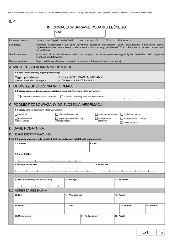 POLA JASNE WYPEŁNIA PODATNIK. WYPEŁNIAĆ NA MASZYNIE, KOMPUTEROWO LUB RĘCZNIE, DUŻYMI, DRUKOWANYMI LITERAMI, CZARNYM LUB NIEBIESKIM KOLOREM. IL-1 INFORMACJA W SPRAWIE PODATKU LEŚNEGO 1. Rok Podstawa prawna: Ustawa z dnia 30 października 2002 r. o podatku leśnym (Dz. U. z 2013 r., poz. 465, ze zm.). Składający: Formularz przeznaczony dla osób fizycznych będących właścicielami lasów, posiadaczami samoistnymi lasów, użytkownikami wieczystymi lasów, posiadaczami lasów stanowiących własność Skarbu Państwa lub jednostki samorządu terytorialnego. Termin składania: W terminie 14 dni od zaistnienia okoliczności mających wpływ na powstanie (wygaśnięcie) obowiązku podatkowego lub wysokość opodatkowania. Miejsce składania: Organ podatkowy właściwy ze względu na miejsce położenia nieruchomości leśnej. A. MIEJSCE SKŁADANIA INFORMACJI 2. Nazwa i adres siedziby organu podatkowego Organ podatkowy: PREZYDENT MIASTA PABIANIC Nazwa i adres siedziby organu: ul. Zamkowa 16, 95-200 Pabianice B. OBOWIĄZEK ZŁOŻENIA INFORMACJI 3. Okoliczności powodujące obowiązek złożenia informacji (zaznaczyć właściwy kwadrat): 1. informacja składana po raz pierwszy 2. korekta informacji (data zaistnienia zmian) C. PODMIOT ZOBOWIĄZANY DO ZŁOŻENIA INFORMACJI 4. Rodzaj podmiotu (zaznaczyć właściwy kwadrat): właściciel współwłaściciel wielkość udziału: użytkownik wieczysty współużytkownik wieczysty wielkość udziału: posiadacz samoistny posiadacz zależny współposiadacz samoistny współposiadacz zależny trwały zarządca D. DANE PODATNIKA D.1. DANE IDENTYFIKACYJNE Pola 8, 9 należy wypełnić, gdy podatnik jest prowadzącym działalność gospodarczą. 5. Nazwisko 6. Imię 7. Numer PESEL 8. Identyfikator REGON 10. Data urodzenia (dzień- miesiąc- rok) 9. Numer NIP 11. Imię ojca 12. Imię matki 13. Kraj 14. Województwo 15. Powiat 16. Gmina 17. Ulica D.2. ADRES ZAMIESZKANIA 20. Miejscowość 18. Nr domu 21. Kod pocztowy 19. Nr lokalu 22. Poczta IL-1(1) 1/3 D.3. ADRES DO KORESPONDENCJI (wypełnić w przypadku, gdy jest inny niż podany w poz. D.2) 23. Kraj 24. Województwo 26. Gmina 27. Ulica 30. Miejscowość 25. Powiat 28. Nr domu 31. Kod pocztowy 29. Nr lokalu 32. Poczta E. DANE DOTYCZĄCE LASÓW NIEPODLEGAJĄCYCH ZWOLNIENIU Powierzchnia w ha 1) Rodzaj lasu 33. 1. Lasy 34. 2. Lasy wchodzące w skład rezerwatów przyrody 35. 3. Lasy wchodzące w skład parków narodowych F. INFORMACJA O ZAŁĄCZNIKACH (do niniejszej informacji dołączono) 36. Liczba załączników ZL-1/A 37. Załącznik ZL-1/B składany (zaznaczyć właściwy kwadrat): tak nie G. OŚWIADCZENIE I PODPIS PODATNIKA/ OSOBY REPREZENTUJACEJ PODATNIKA Oświadczam, że są mi znane przepisy Kodeksu karnego skarbowego o odpowiedzialności za podanie danych niezgodnych z rzeczywistością. Osobą reprezentującą podatnika może być jedynie osoba uprawniona do reprezentowania np. przedstawiciel ustawowy, pełnomocnik określony w pełnomocnictwie. Do informacji należy dołączyć dokument potwierdzający pełnomocnictwo wraz z dowodem uiszczenia opłaty skarbowej. 38. Imię 39. Nazwisko 40. Data wypełnienia informacji (dzień- miesiąc- rok) 41. Podpis (pieczęć) podatnika/ osoby reprezentującej podatnika 2) 42. Numer telefonu kontaktowego H. DANE WSPÓŁWŁAŚCICIELI/ WSPÓŁUŻYTKOWNIKÓW/ WSPÓŁPOSIADACZY Pola 48, 55, 62, 69 dotyczące NIP-u należy wypełnić, gdy podatnik jest prowadzącym działalność gospodarczą. H.1. DANE IDENTYFIKACYJNE H.2. DANE IDENTYFIKACYJNE 43. Nazwisko i imię 50. Nazwisko i imię 44. Imię ojca, imię matki 51. Imię ojca, imię matki 45. Wielkość udziału 52. Wielkość udziału 46. Adres zamieszkania 53. Adres zamieszkania 47. Adres do korespondencji, jeżeli jest inny niż w polu 46 54. Adres do korespondencji, jeżeli jest inny niż w polu 53 IL-1(1) 2 /3 48. Pesel, NIP 55. Pesel, NIP 49. Podpis 56. Podpis H.3. DANE IDENTYFIKACYJNE H.4. DANE IDENTYFIKACYJNE 57. Nazwisko i imię 64. Nazwisko i imię 58. Imię ojca, imię matki 65. Imię ojca, imię matki 59. Wielkość udziału 66. Wielkość udziału 60. Adres zamieszkania 67. Adres zamieszkania 61. Adres do korespondencji, jeżeli jest inny niż w polu 60 68. Adres do korespondencji, jeżeli jest inny niż w polu 67 62. Pesel, NIP 69. Pesel, NIP 63. Podpis 70. Podpis I. ADNOTACJE ORGANU PODATKOWEGO 71. Data wpływu formularza (dzień- miesiąc- rok) 72. Podpis urzędnika przyjmującego ......................................................................... ......................................................................... 73. Uwagi organu podatkowego: .......................................................................................................................................................... .......................................................................................................................................................... .......................................................................................................................................................... .......................................................................................................................................................... .......................................................................................................................................................... 1) Należy podać z dokładnością do czterech miejsc po przecinku. 2) Niepotrzebne skreślić. IL-1(1) 3 /3