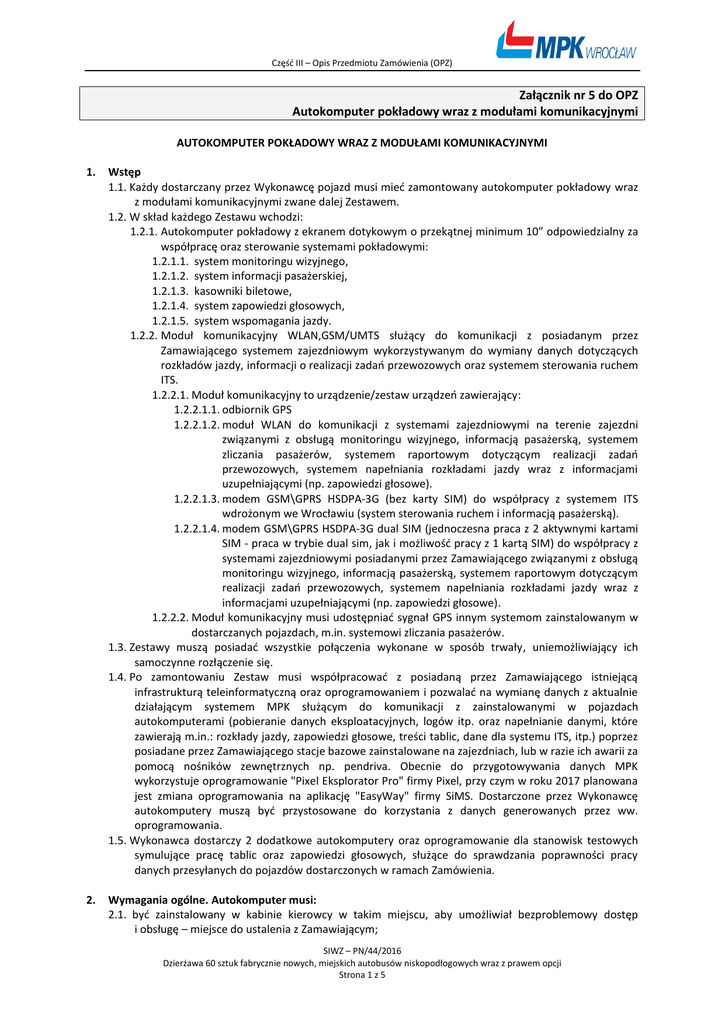 Część III – Opis Przedmiotu Zamówienia (OPZ) Załącznik nr 5 do OPZ Autokomputer pokładowy wraz z modułami komunikacyjnymi AUTOKOMPUTER POKŁADOWY WRAZ Z MODUŁAMI KOMUNIKACYJNYMI 1. Wstęp 1.1. Każdy dostarczany przez Wykonawcę pojazd musi mieć zamontowany autokomputer pokładowy wraz z modułami komunikacyjnymi zwane dalej Zestawem. 1.2. W skład każdego Zestawu wchodzi: 1.2.1. Autokomputer pokładowy z ekranem dotykowym o przekątnej minimum 10” odpowiedzialny za współpracę oraz sterowanie systemami pokładowymi: 1.2.1.1. system monitoringu wizyjnego, 1.2.1.2. system informacji pasażerskiej, 1.2.1.3. kasowniki biletowe, 1.2.1.4. system zapowiedzi głosowych, 1.2.1.5. system wspomagania jazdy. 1.2.2. Moduł komunikacyjny WLAN,GSM/UMTS służący do komunikacji z posiadanym przez Zamawiającego systemem zajezdniowym wykorzystywanym do wymiany danych dotyczących rozkładów jazdy, informacji o realizacji zadań przewozowych oraz systemem sterowania ruchem ITS. 1.2.2.1. Moduł komunikacyjny to urządzenie/zestaw urządzeń zawierający: 1.2.2.1.1. odbiornik GPS 1.2.2.1.2. moduł WLAN do komunikacji z systemami zajezdniowymi na terenie zajezdni związanymi z obsługą monitoringu wizyjnego, informacją pasażerską, systemem zliczania pasażerów, systemem raportowym dotyczącym realizacji zadań przewozowych, systemem napełniania rozkładami jazdy wraz z informacjami uzupełniającymi (np. zapowiedzi głosowe). 1.2.2.1.3. modem GSM\GPRS HSDPA-3G (bez karty SIM) do współpracy z systemem ITS wdrożonym we Wrocławiu (system sterowania ruchem i informacją pasażerską). 1.2.2.1.4. modem GSM\GPRS HSDPA-3G dual SIM (jednoczesna praca z 2 aktywnymi kartami SIM - praca w trybie dual sim, jak i możliwość pracy z 1 kartą SIM) do współpracy z systemami zajezdniowymi posiadanymi przez Zamawiającego związanymi z obsługą monitoringu wizyjnego, informacją pasażerską, systemem raportowym dotyczącym realizacji zadań przewozowych, systemem napełniania rozkładami jazdy wraz z informacjami uzupełniającymi (np. zapowiedzi głosowe). 1.2.2.2. Moduł komunikacyjny musi udostępniać sygnał GPS innym systemom zainstalowanym w dostarczanych pojazdach, m.in. systemowi zliczania pasażerów. 1.3. Zestawy muszą posiadać wszystkie połączenia wykonane w sposób trwały, uniemożliwiający ich samoczynne rozłączenie się. 1.4. Po zamontowaniu Zestaw musi współpracować z posiadaną przez Zamawiającego istniejącą infrastrukturą teleinformatyczną oraz oprogramowaniem i pozwalać na wymianę danych z aktualnie działającym systemem MPK służącym do komunikacji z zainstalowanymi w pojazdach autokomputerami (pobieranie danych eksploatacyjnych, logów itp. oraz napełnianie danymi, które zawierają m.in.: rozkłady jazdy, zapowiedzi głosowe, treści tablic, dane dla systemu ITS, itp.) poprzez posiadane przez Zamawiającego stacje bazowe zainstalowane na zajezdniach, lub w razie ich awarii za pomocą nośników zewnętrznych np. pendriva. Obecnie do przygotowywania danych MPK wykorzystuje oprogramowanie "Pixel Eksplorator Pro" firmy Pixel, przy czym w roku 2017 planowana jest zmiana oprogramowania na aplikację "EasyWay" firmy SiMS. Dostarczone przez Wykonawcę autokomputery muszą być przystosowane do korzystania z danych generowanych przez ww. oprogramowania. 1.5. Wykonawca dostarczy 2 dodatkowe autokomputery oraz oprogramowanie dla stanowisk testowych symulujące pracę tablic oraz zapowiedzi głosowych, służące do sprawdzania poprawności pracy danych przesyłanych do pojazdów dostarczonych w ramach Zamówienia. 2. Wymagania ogólne. Autokomputer musi: 2.1. być zainstalowany w kabinie kierowcy w takim miejscu, aby umożliwiał bezproblemowy dostęp i obsługę – miejsce do ustalenia z Zamawiającym; SIWZ – PN/44/2016 Dzierżawa 60 sztuk fabrycznie nowych, miejskich autobusów niskopodłogowych wraz z prawem opcji Strona 1 z 5 Część III – Opis Przedmiotu Zamówienia (OPZ) 2.2. wyświetlać na ekranie głównym aktualne informacje dotyczące trasy (w tym nazwy kolejnych przystanków, informacje o statusie przystanków „na żądanie”) oraz podawać odchylenie czasowe przejazdu w stosunku do planowanego rozkładu jazdy – odchylenie powinno odnosić się do najbliższego przystanku i zmienić się na przystanek kolejny dopiero po opuszczeniu strefy przystanku aktualnego. Informacje te muszą być dostępne w wydzielonej strefie ekranu, nawet podczas podglądu obrazu z kamer; 2.3. Wyświetlać aktualną odległość do następnego przystanku (aktualizowaną na bieżąco); 2.4. Wyświetlać (w postaci strzałek) kierunek jazdy i najbliższy manewr; 2.5. po zalogowaniu się kierującego do autokomputera umożliwić wybór realizowanego zadania przewozowego (zgodnie z rozkładem jazdy). Kolejne kursy muszą być podpowiadane kierującemu, zgodnie z ich kolejnością wynikającą z wybranego zadania przewozowego; 2.6. zapewnić możliwość ręcznego załączenia podglądu z kamer systemu monitoringu wizyjnego; 2.7. zapewnić wyświetlenie obrazu z kamery cofania po załączeniu biegu wstecznego i powrót do ekranu głównego po jego wyłączeniu; 2.8. umożliwiać kierującemu pojazd manualną zmianę linii, kierunku jazdy i kursu z rozkładu jazdy w przypadku konieczności zmiany trasy; 2.9. zapewnić wyświetlanie statusu pracy następujących systemów: 2.9.1. system monitoringu wizyjnego, 2.9.2. system informacji pasażerskiej, 2.9.3. kasowników biletowych; 2.10. być wyposażony w kolorowy wyświetlacz o rozdzielczości minimum 1280x800 i przekątnej minimum 10’’ z automatyczną regulacją jasności; 2.11. być wyposażony w ekran dotykowy zabezpieczony szkłem hartowanym; 2.12. posiadać wbudowany sygnalizator dźwiękowy informujący prowadzącego o rozpoczętym kursie; 2.13. być wyposażony w wbudowany czytnik karty zbliżeniowych MIFARE PLUS obecnie wykorzystywanych przez Zamawiającego; 2.14. zapewnić polskie menu konfiguracyjne; 2