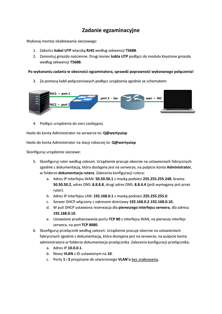 Zadanie egzaminacyjne Wykonaj montaż okablowania sieciowego: 1. Zakończ kabel UTP wtyczką RJ45 według sekwencji T568B. 2. Zamontuj gniazdo naścienne. Drugi koniec kabla UTP podłącz do modułu Keystone gniazda według sekwencji T568B. Po wykonaniu zadania w obecności egzaminatora, sprawdź poprawność wykonanego połączenia! 3. Za pomocą kabli połączeniowych podłącz urządzenia zgodnie ze schematem: 4. Podłącz urządzenia do sieci zasilającej. Hasło do konta Administrator na serwerze to: Q@wertyuiop Hasło do konta Administrator na stacji roboczej to: Q@wertyuiop Skonfiguruj urządzenie sieciowe: 5. Skonfiguruj ruter według zaleceń. Urządzenie pracuje obecnie na ustawieniach fabrycznych zgodnie z dokumentacją, która dostępna jest na serwerze, na pulpicie konta Administrator, w folderze dokumentacja rutera. Zalecenia konfiguracji rutera: a. Adres IP interfejsu WAN: 50.50.50.1 z maską podsieci 255.255.255.248, brama: 50.50.50.2, adres DNS: 8.8.8.8, drugi adres DNS: 8.8.4.4 (jeśli wymagany jest przez ruter). b. Adres IP interfejsu LAN: 192.168.0.1 z maską podsieci 255.255.255.0. c. Serwer DHCP włączony z zakresem dzierżawy 192.168.0.2-192.168.0.10. d. W puli DHCP ustawiona rezerwacja dla pierwszego interfejsu serwera, dla adresu 192.168.0.10. e. Ustawione przekierowanie portu TCP 80 z interfejsu WAN, na pierwszy interfejs serwera, na port TCP 8080. 6. Skonfiguruj przełącznik według zaleceń. Urządzenie pracuje obecnie na ustawieniach fabrycznych zgodnie z dokumentacją, która dostępna jest na serwerze, na pulpicie konta administratora w folderze dokumentacja przełącznika. Zalecenia konfiguracji przełącznika: a. Adres IP 10.0.0.1. b. Nowy VLAN z ID ustawionym na 10. c. Porty 1 i 3 przypisane do utworzonego VLAN’u bez znakowania. Skonfiguruj połączenia sieciowe serwera i stacji roboczej: 7. Skonfiguruj pierwszy interfejs serwera według zaleceń: a. Nazwa połączenia: NIC1. b. Adres IP: uzyskaj automatycznie. c. Serwer DNS: uzyskaj automatycznie. 8. Skonfiguruj drugi interfejs serwera według zaleceń: a. Nazwa połączenia: NIC2. b. Adres IP: 10.0.0.2 z maską podsieci 255.255.255.0. 9. Skonfiguruj interfejs sieciowy stacji roboczej według zaleceń: a. Nazwa połączenia: NIC. b. Adres IP: 50.50.50.2 z maską podsieci: 255.255.255.248. c. Brama: 50.50.50.1. d. Serwer DNS: 8.8.8.8. 10. Na serwerze, na pulpicie konta Administrator utwórz plik hasło.txt, a w nim zapisz login i hasło konta administratora rutera. 11. Na serwerze uruchom usługę http i zmień port domyślnej strony WWW na 8080. Sprawdź działanie skonfigurowanych urządzeń: 12. Stosując na serwerze polecenia ping oraz ipconfig sprawdź komunikację pomiędzy: a. Serwerem a przełącznikiem. b. Serwerem a ruterem (interfejs LAN i WAN). c. Serwerem a stacją roboczą. oraz sprawdź konfigurację interfejsów sieciowych serwera. Wykonaj zrzuty ekranowe potwierdzające wykonanie działań kontrolnych, zapisz je na serwerze, na pulpicie konta Administrator, w folderze o nazwie sprawdzenie. 13. Sprawdź poprawność konfiguracji serwera WWW oraz przekierowania portów w ruterze, poprzez wyświetlenie w przeglądarce stacji roboczej domyślnej strony WWW znajdującej się na serwerze (adres: 50.50.50.1). Wykonaj zrzut ekranowy potwierdzający wykonanie działania kontrolnego, zapisz go na stacji roboczej, na pulpicie konta Administrator, w folderze o nazwie sprawdzenie. Załóż nowego użytkownika: 14. Na serwerze, utwórz konto lokalnego użytkownika, z danymi: a. Pełna nazwa: Adam Nowak. b. Nazwa logowania: anowak. c. Hasło docelowe: zaq1@WSX. 15. Utworzone konto dodaj do grupy Administratorzy. 16. Utwórz na serwerze folder C:\Admin i ustaw zabezpieczenia tylko dla grupy Administratorzy – pełna kontrola.