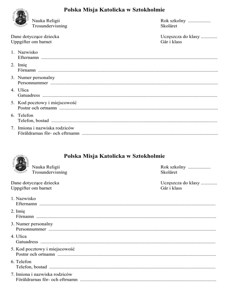 Polska Misja Katolicka w Sztokholmie Nauka Religii Trosundervisning Dane dotyczące dziecka Uppgifter om barnet Rok szkolny .................. Skolåret Uczęszcza do klasy ............. Går i klass 1. Nazwisko Efternamn ............................................................................................................................................. 2. Imię Förnamn ................................................................................................................................................ 3. Numer personalny Personnummer ...................................................................................................................................... 4. Ulica Gatuadress ............................................................................................................................................ 5. Kod pocztowy i miejscowość Postnr och ortnamn ............................................................................................................................... 6. Telefon Telefon, bostad ..................................................................................................................................... 7. Imiona i nazwiska rodziców Föräldrarnas för- och eftrnamn ............................................................................................................. Polska Misja Katolicka w Sztokholmie Nauka Religii Trosundervisning Dane dotyczące dziecka Uppgifter om barnet Rok szkolny .................. Skolåret Uczęszcza do klasy ............. Går i klass 1. Nazwisko Efternamn ............................................................................................................................................. 2. Imię Förnamn ................................................................................................................................................ 3. Numer personalny Personnummer ...................................................................................................................................... 4. Ulica Gatuadress ............................................................................................................................................ 5. Kod pocztowy i miejscowość Postnr och ortnamn ............................................................................................................................... 6. Telefon Telefon, bostad ..................................................................................................................................... 7. Imiona i nazwiska rodziców Föräldrarnas för- och eftrnamn .............................................................................................................