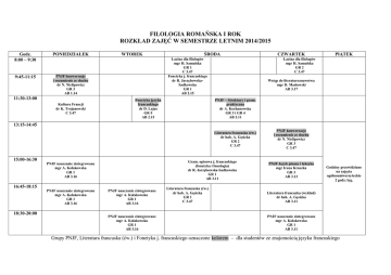 FILOLOGIA ROMAŃSKA I ROK ROZKŁAD ZAJĘĆ W SEMESTRZE LETNIM 2014/2015 Godz. 8:00 – 9:30 PONIEDZIAŁEK 9:45-11:15 PNJF konwersacje i rozumienie ze słuchu dr N. Nielipowicz GR 3 AB 1.14 11:30-13:00 Kultura Francji dr K. Trojanowski C 3.47 WTOREK ŚRODA Łacina dla filologów mgr H. Samulska GR 1 C 3.47 Fonetyka j. francuskiego dr R. JarzębowskaSadkowska GR 1 AB 2.15 Fonetyka języka francuskiego dr D. Lajus GR 5 AB 2.15 CZWARTEK PIĄTEK Łacina dla filologów mgr H. Samulska GR 2 C 3.47 Wstęp do literaturoznawstwa mgr D. Masłowski AB 3.17 PNJF – Struktury i gram. praktyczna dr A. Kochanowska GR 3 i GR 4 AB 3.11 13:15-14:45 Literatura francuska (ćw.) dr hab. A. Gęsicka GR 2 C 3.47 15:00-16:30 Gram. opisowa j. francuskiego (fonetyka i fonologia) dr R. Jarzębowska-Sadkowska GR 1 AB 3.11 PNJF nauczanie zintegrowane mgr A. Kołakowska GR 1 AB 3.16 16:45-18:15 PNJF nauczanie zintegrowane mgr A. Kołakowska GR 1 AB 3.16 18:30-20:00 PNJF nauczanie zintegrowane mgr A. Kołakowska GR 1 AB 3.16 PNJF nauczanie zintegrowane mgr A. Kołakowska GR 1 AB 3.16 Literatura francuska (ćw.) dr hab. A. Gęsicka GR 1 C 3.47 PNJF konwersacje i rozumienie ze słuchu dr N. Nielipowicz GR 3 C 3.47 PNJF Język pisany i leksyka mgr Irena Kruszka GR 3 AB 3.13 Godziny przewidziane na zajęcia ogólnouniwersyteckie 2 godz./tyg. Literatura francuska (wykład) dr hab. A. Gęsicka AB 3.11 PNJF nauczanie zintegrowane mgr A. Kołakowska GR 1 AB 3.11 Grupy PNJF, Literatura francuska (ćw.) i Fonetyka j. francuskiego oznaczone kolorem – dla studentów ze znajomością języka francuskiego FILOLOGIA ROMAŃSKA II ROK ROZKŁAD ZAJĘĆ W SEMESTRZE LETNIM 2014/2015 Godz. 8:00 – 9:30 PONIEDZIAŁEK 9:45-11:15 Seminarium przedmiotowe z zakresu KULTUROZNAWSTWA ROMAŃSKIEGO dr M. Skibicki AB 3.13 15:00-16:30 16:45-18:15 CZWARTEK Przekładoznawstwo dr A. Kochanowska AB 1.09 J. francuski w hotelarstwie i turystyce dr D. Lajus GR 2 Drugi język romański (hiszpański) mgr M. Ściesińska C 3.47 Współczesna literatura francuska (ćw.) dr N. Nielipowicz C 3.47 PNJF nauczanie zintegrowane mgr E. Lajus GR 1 AB 3.10 17:00-18:30 Drugi język romański (włoski) mgr P. Chudzik Coll. Maius 303 PIĄTEK PNJF- Gramatyka dr M. Skibicki GR 1 C 3.47 PNJF- konwersacje i rozumienie ze słuchu mgr E. Lajus GR 1 C 3.47 AB 1.09 PNJF- Gramatyka dr M. Skibicki GR 3 AB 1.15 PNJF – J. pisany mgr E. Lajus GR 3 C 3.47 Wykład z zakresu literaturoznawstwa romańskiego dr hab. P. Sadkowski AB 3.16 PNJF – konwersacje i rozumienie ze słuchu dr K. Trojanowski GR 3 Gramatyka opisowa j. francuskiego (morfoskładnia) wykład dr R. Jarzębowska-Sadkowska AB 3.11 PNJF - nauczanie zintegrowane mgr E. Lajus GR 1 AB 3.17 C 3.47 18:30-20:00 ŚRODA Wykład z zakresu językoznawstwa romańskiego dr A. Kochanowska AB 3.17 11:30-13:00 13:15-14:45 WTOREK J. francuski w hotelarstwie i turystyce dr R. JarzebowskaSadkowska GR 1 AB.2.15 Drugi język romański (hiszpański) mgr M. Ściesińska C 3.47 Seminarium przedmiotowe z zakresu LITERATUROZNAWSTWA ROMAŃSKIEGO dr hab. A. Gęsicka C 3.47 17:00-18:30 Drugi język romański (włoski) mgr P. Chudzik Coll. Maius 303 Grupy PNJF oznaczone kolorem – dla studentów ze znajomością języka francuskiego - łączone z II rokiem LS j. fr. z arabskim i LS j. fr. z hiszpańskim FILOLOGIA ROMAŃSKA III ROK ROZKŁAD ZAJĘĆ W SEMESTRZE LETNIM 2014/2015 Godz. 8:00 – 9:30 PONIEDZIAŁEK 9:45-11:15 Korespondencja i język handlowy dr D. Lajus GR 2 C 3.47 11:30-13:00 Korespondencja i język handlowy dr D. Lajus GR 1 AB 3.11 WTOREK ŚRODA Historia j. francuskiego prof. dr hab. G. Vetulani co 2 tyg. AB 3.11 Wybrane zagadnienia z językoznawstwa romańskiego wykład dr A. Kochanowska co 2 tyg. AB 3.11 AB 3.17 Seminarium licencjackie dr K. Trojanowski GR 2 C 3.46 (gab.) 15:00-16:30 PNJF Przekład dr N. Nielipowicz GR 1 C 3.13 Narzędzia informatyczne w pracy filologa dr R. JarzębowskaSadkowska GR 1 AB 2.15 Seminarium licencjackie dr A. Kochanowska GR 1 C 3.15 PIĄTEK PNJF- gramatyka dr A. Kochanowska GR 1 AB 3.17 Narzędzia informatyczne w pracy filologa dr R. JarzębowskaSadkowska GR 2 AB 2.15 PNJF Przekład dr N. Nielipowicz GR 2 13:15-14:45 CZWARTEK PNJF- gramatyka dr G. Olszaniec GR 2 C 3.47 Seminarium licencjackie dr G. Olszaniec GR 3 C 3.41 (gab.) Seminarium licencjackie dr A. Żurawska GR 4 C 3.44 Wybrane zagadnienia z literaturoznawstwa romańskiego wykład dr A. Żurawska AB 3.09 Godziny przewidziane na zajęcia ogólnouczelniane 6 godz./tyg. 16:45-18:15 18:30-20:00 Grupy PNJF, Korespondencja i język handlowy, Narzędzia informatyczne oznaczone kolorem – dla studentów grupy zaawansowanej FILOLOGIA ROMAŃSKA I ROK DRUGIEGO STOPNIA ROZKŁAD ZAJĘĆ W SEMESTRZE LETNIM 2014/2015 Godz. 8:00 – 9:30 9:45-11:15 PONIEDZIAŁEK Wykład monograficzny z zakresu literaturoznawstwa romańskiego dr hab. A. Branach-Kallas AB 3.11 WTOREK ŚRODA CZWARTEK PIĄTEK Podstawy dydaktyki dr D. Siemieniecka wykład sala Darwina WNP Wykład monograficzny z zakresu językoznawstwa romańskiego dr A. Kochanowska AB 3.17 Drugi język romański (hiszpański kontynuacja) mgr M. Ściesińska AB 2.15 Psychologia ćw. dr L. Wiśniewska AB 3.11 Przekład tekstów specjalistycznych dr N. Nielipowicz C 3.47 Drugi język romański (hiszpański kontynuacja) mgr B. Haniec AB 1.13 Francuski prawniczy dr D. Lajus C 3.47 Specjalizacja językoznawcza prof. dr hab. G. Vetulani C 3.47 Seminarium Seminarium magisterskie magisterskie (językoznawstwo) (literaturoznawstwo) prof. dr hab. dr hab. P. Sadkowski G. Vetulani C 3.45 11:30-13:00 13:15-14:45 C 3.50 15:00-16:30 16:45-18:15 18:30-20:00 Drugi język romański (włoski kontynuacja) dr A. Głodowska Coll. Maius 302 17:00-18:30 Drugi język romański (włoski od podstaw) mgr P. Chudzik Coll. Maius 303 Dydaktyka przedmiotowa mgr I. Kruszka AB 3.09 Specjalizacja literaturoznawcza dr hab. A. Gęsicka C 3.43 (gab.) Drugi język romański (włoski kontynuacja) dr A. Głodowska Coll. Maius 302 Dydaktyka przedmiotowa mg