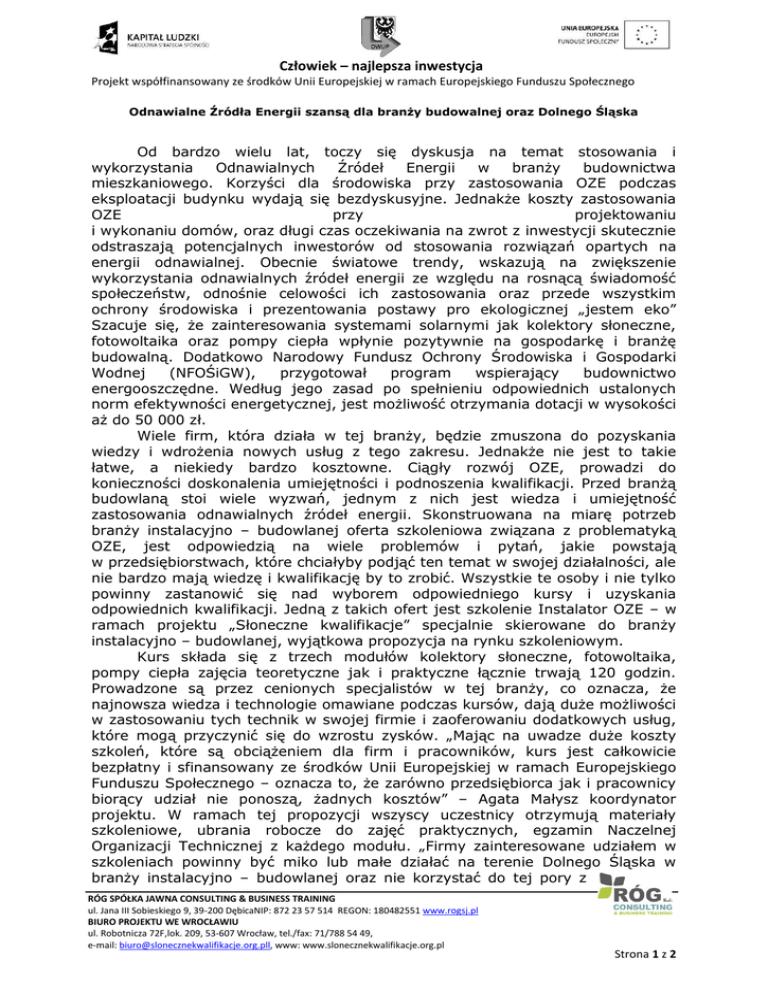 Człowiek – najlepsza inwestycja Projekt współfinansowany ze środków Unii Europejskiej w ramach Europejskiego Funduszu Społecznego Odnawialne Źródła Energii szansą dla branży budowalnej oraz Dolnego Śląska Od bardzo wielu lat, toczy się dyskusja na temat stosowania i wykorzystania Odnawialnych Źródeł Energii w branży budownictwa mieszkaniowego. Korzyści dla środowiska przy zastosowania OZE podczas eksploatacji budynku wydają się bezdyskusyjne. Jednakże koszty zastosowania OZE przy projektowaniu i wykonaniu domów, oraz długi czas oczekiwania na zwrot z inwestycji skutecznie odstraszają potencjalnych inwestorów od stosowania rozwiązań opartych na energii odnawialnej. Obecnie światowe trendy, wskazują na zwiększenie wykorzystania odnawialnych źródeł energii ze względu na rosnącą świadomość społeczeństw, odnośnie celowości ich zastosowania oraz przede wszystkim ochrony środowiska i prezentowania postawy pro ekologicznej „jestem eko” Szacuje się, że zainteresowania systemami solarnymi jak kolektory słoneczne, fotowoltaika oraz pompy ciepła wpłynie pozytywnie na gospodarkę i branżę budowalną. Dodatkowo Narodowy Fundusz Ochrony Środowiska i Gospodarki Wodnej (NFOŚiGW), przygotował program wspierający budownictwo energooszczędne. Według jego zasad po spełnieniu odpowiednich ustalonych norm efektywności energetycznej, jest możliwość otrzymania dotacji w wysokości aż do 50 000 zł. Wiele firm, która działa w tej branży, będzie zmuszona do pozyskania wiedzy i wdrożenia nowych usług z tego zakresu. Jednakże nie jest to takie łatwe, a niekiedy bardzo kosztowne. Ciągły rozwój OZE, prowadzi do konieczności doskonalenia umiejętności i podnoszenia kwalifikacji. Przed branżą budowlaną stoi wiele wyzwań, jednym z nich jest wiedza i umiejętność zastosowania odnawialnych źródeł energii. Skonstruowana na miarę potrzeb branży instalacyjno – budowlanej oferta szkoleniowa związana z problematyką OZE, jest odpowiedzią na wiele problemów i pytań, jakie powstają w przedsiębiorstwach, które chciałyby podjąć ten temat w swojej działalności, ale nie bardzo mają wiedzę i kwalifikację by to zrobić. Wszystkie te osoby i nie tylko powinny zastanowić się nad wyborem odpowiedniego kursy i uzyskania odpowiednich kwalifikacji. Jedną z takich ofert jest szkolenie Instalator OZE – w ramach projektu „Słoneczne kwalifikacje” specjalnie skierowane do branży instalacyjno – budowlanej, wyjątkowa propozycja na rynku szkoleniowym. Kurs składa się z trzech modułów kolektory słoneczne, fotowoltaika, pompy ciepła zajęcia teoretyczne jak i praktyczne łącznie trwają 120 godzin. Prowadzone są przez cenionych specjalistów w tej branży, co oznacza, że najnowsza wiedza i technologie omawiane podczas kursów, dają duże możliwości w zastosowaniu tych technik w swojej firmie i zaoferowaniu dodatkowych usług, które mogą przyczynić się do wzrostu zysków. „Mając na uwadze duże koszty szkoleń, które są obciążeniem dla firm i pracowników, kurs jest całkowicie bezpłatny i sfinansowany ze środków Unii Europejskiej w ramach Europejskiego Funduszu Społecznego – oznacza to, że zarówno przedsiębiorca jak i pracownicy biorący udział nie ponoszą, żadnych kosztów” – Agata Małysz koordynator projektu. W ramach tej propozycji wszyscy uczestnicy otrzymują materiały szkoleniowe, ubrania robocze do zajęć praktycznych, egzamin Naczelnej Organizacji Technicznej z każdego modułu. „Firmy zainteresowane udziałem w szkoleniach powinny być miko lub małe działać na terenie Dolnego Śląska w branży instalacyjno – budowlanej oraz nie korzystać do tej pory z RÓG SPÓŁKA JAWNA CONSULTING & BUSINESS TRAINING ul. Jana III Sobieskiego 9, 39-200 DębicaNIP: 872 23 57 514 REGON: 180482551 www.rogsj.pl BIURO PROJEKTU WE WROCŁAWIU ul. Robotnicza 72F,lok. 209, 53-607 Wrocław, tel./fax: 71/788 54 49, e-mail: [email protected], www: www.slonecznekwalifikacje.org.pl Strona 1 z 2 Człowiek – najlepsza inwestycja Projekt współfinansowany ze środków Unii Europejskiej w ramach Europejskiego Funduszu Społecznego wsparcia na szkolenia finansowane z POKL, pracownicy zaś powinni być zatrudnieni na umowę o pracę oraz posiadać wykształcenie, co najwyżej średnie, mile widziani są również właściciela i osoby samozatrudnione, szczegóły znajdą Państwo na stronie www.slonecznekwalifikacje.pl – dodaje Mariusz Wójtowicz, pracownik biura – Zapraszamy wszystkie osoby zainteresowane do kontaktu z nami w biurze projektu we Wrocławiu, telefonicznie 71 788 54 49 lub mailowo [email protected].” Skorzystanie z tego typu oferty, dla wielu mikro i małych firm z terenu Dolnego Śląska, jest szansą na rozwój, oszczędność czasu oraz środków finansowych. Warto skorzystać i nie przegapić szansy, postawić sobie nowe cele i śmiało wejść w nową dziedzinę - instalacji Odnawialnych Źródeł Energii. Jest szansa, że dzięki takim inicjatywą Dolny Śląsk stanie się liderem w wykorzystaniu technologii energooszczędnych w budownictwie. RÓG SPÓŁKA JAWNA CONSULTING & BUSINESS TRAINING ul. Jana III Sobieskiego 9, 39-200 DębicaNIP: 872 23 57 514 REGON: 180482551 www.rogsj.pl BIURO PROJEKTU WE WROCŁAWIU ul. Robotnicza 72F,lok. 209, 53-607 Wrocław, tel./fax: 71/788 54 49, e-mail: [email protected], www: www.slonecznekwalifikacje.org.pl Strona 2 z 2