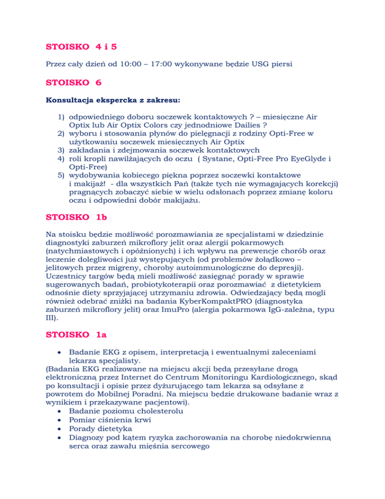 STOISKO 4 i 5 Przez cały dzień od 10:00 – 17:00 wykonywane będzie USG piersi STOISKO 6 Konsultacja ekspercka z zakresu: 1) odpowiedniego doboru soczewek kontaktowych ? – miesięczne Air Optix lub Air Optix Colors czy jednodniowe Dailies ? 2) wyboru i stosowania płynów do pielęgnacji z rodziny Opti-Free w użytkowaniu soczewek miesięcznych Air Optix 3) zakładania i zdejmowania soczewek kontaktowych 4) roli kropli nawilżających do oczu ( Systane, Opti-Free Pro EyeGlyde i Opti-Free) 5) wydobywania kobiecego piękna poprzez soczewki kontaktowe i makijaż! - dla wszystkich Pań (także tych nie wymagających korekcji) pragnących zobaczyć siebie w wielu odsłonach poprzez zmianę koloru oczu i odpowiedni dobór makijażu. STOISKO 1b Na stoisku będzie możliwość porozmawiania ze specjalistami w dziedzinie diagnostyki zaburzeń mikroflory jelit oraz alergii pokarmowych (natychmiastowych i opóźnionych) i ich wpływu na prewencje chorób oraz leczenie dolegliwości już występujących (od problemów żołądkowo – jelitowych przez migreny, choroby autoimmunologiczne do depresji). Uczestnicy targów będą mieli możliwość zasięgnąć porady w sprawie sugerowanych badań, probiotykoterapii oraz porozmawiać z dietetykiem odnośnie diety sprzyjającej utrzymaniu zdrowia. Odwiedzający będą mogli również odebrać zniżki na badania KyberKompaktPRO (diagnostyka zaburzeń mikroflory jelit) oraz ImuPro (alergia pokarmowa IgG-zależna, typu III). STOISKO 1a Badanie EKG z opisem, interpretacją i ewentualnymi zaleceniami lekarza specjalisty. (Badania EKG realizowane na miejscu akcji będą przesyłane drogą elektroniczną przez Internet do Centrum Monitoringu Kardiologicznego, skąd po konsultacji i opisie przez dyżurującego tam lekarza są odsyłane z powrotem do Mobilnej Poradni. Na miejscu będzie drukowane badanie wraz z wynikiem i przekazywane pacjentowi). Badanie poziomu cholesterolu Pomiar ciśnienia krwi Porady dietetyka Diagnozy pod kątem ryzyka zachorowania na chorobę niedokrwienną serca oraz zawału mięśnia sercowego Dla każdego Pacjenta – podsumowanie badań – w postaci ankiety medycznej. STOISKO 2b W trakcie Babskiego Dnia będą się odbywały darmowe konsultacje z fizjoterapeutką. Będzie można kupić sprzęt rehabilitacyjny, a w szczególności poduszki ortopedyczne, poduszki do siedzenia SITFIT (dla osób spędzających większą część dnia w pozycji siedzącej). Po konsultacji osoba ta będzie mogła również zakupić dowolny produkt do ćwiczeń i rehabilitacji z 10% rabatem. STOISKO 32 FootMedica Klinika Zdrowej Stopy przeprowadzi bezpłatne badania na stoisku:. - komputerowe badanie stóp, - konsultacje podologiczne, z indywidualnymi wskazówkami, jak dbać o stopy Zapraszamy wszystkie panie, które chodzą na obcasach, uprawiają sport, martwią się prawidłowym rozwojem stóp swoich dzieci.