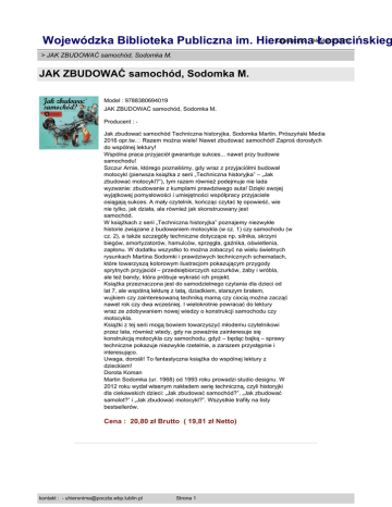 Utworzono : 04Łopacińskieg March 2017 Wojewódzka Biblioteka Publiczna im. Hieronima > JAK ZBUDOWAĆ samochód, Sodomka M. JAK ZBUDOWAĆ samochód, Sodomka M. Model : 9788380694019 JAK ZBUDOWAĆ samochód, Sodomka M. Producent : Jak zbudować samochód Techniczna historyjka, Sodomka Martin, Prószyński Media 2016 opr.tw.�Razem można wiele! Nawet zbudować samochód! Zaproś dorosłych do wspólnej lektury! Wspólna praca przyjaciół gwarantuje sukces... nawet przy budowie samochodu! Szczur Arnie, którego poznaliśmy, gdy wraz z przyjaciółmi budował motocykl (pierwsza książka z serii „Techniczna historyjka” – „Jak zbudować motocykl?”), tym razem również podejmuje nie lada wyzwanie: zbudowanie z kumplami prawdziwego auta! Dzięki swojej wyjątkowej pomysłowości i umiejętności współpracy przyjaciele osiągają sukces. A mały czytelnik, kończąc czytać tę opowieść, wie nie tylko, jak działa, ale również jak skonstruowany jest samochód. W książkach z serii „Techniczna historyjka” poznajemy niezwykłe historie związane z budowaniem motocykla (w cz. 1) czy samochodu (w cz. 2), a także szczegóły techniczne dotyczące np. silnika, skrzyni biegów, amortyzatorów, hamulców, sprzęgła, gaźnika, oświetlenia, zapłonu. W dodatku wszystko to można zobaczyć na wielu świetnych rysunkach Martina Sodomki i prawdziwych technicznych schematach, które towarzyszą kolorowym ilustracjom pokazującym przygody sprytnych przyjaciół – przedsiębiorczych szczurków, żaby i wróbla, ale też bandy, która próbuje wykraść ich projekt. Książka przeznaczona jest do samodzielnego czytania dla dzieci od lat 7, ale wspólną lekturę z tatą, dziadkiem, starszym bratem, wujkiem czy zainteresowaną techniką mamą czy ciocią można zacząć nawet rok czy dwa wcześniej. I wielokrotnie powracać do lektury wraz ze zdobywaniem nowej wiedzy o konstrukcji samochodu czy motocykla. Książki z tej serii mogą bowiem towarzyszyć młodemu czytelnikowi przez lata, również wtedy, gdy na poważnie zainteresuje się konstrukcją motocykla czy samochodu, gdyż – będąc bajką – sprawy techniczne pokazuje niezwykle rzetelnie, a zarazem przystępnie i interesująco. Uwaga, dorośli! To fantastyczna książka do wspólnej lektury z dzieckiem! Dorota Koman Martin Sodomka (ur. 1968) od 1993 roku prowadzi studio designu. W 2012 roku wydał własnym nakładem serię techniczną, czyli historyjki dla ciekawskich dzieci: „Jak zbudować samochód?”, „Jak zbudować samolot?” i „Jak zbudować motocykl?”. Wszystkie trafiły na listy bestsellerów. Cena : 20,80 zł Brutto ( 19,81 zł Netto) kontakt : - [email protected] Strona 1 Utworzono : 04Łopacińskieg March 2017 Wojewódzka Biblioteka Publiczna im. Hieronima > JAK ZBUDOWAĆ samochód, Sodomka M. JAK ZBUDOWAĆ samochód, Sodomka M. Dostępność: Produkt dostępny w naszym sklepie od 15 November 2016 kontakt : - [email protected] Strona 2