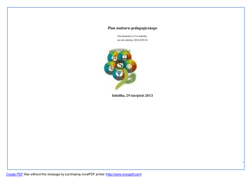 Plan nadzoru pedagogicznego Przedszkola nr 5 w Sokółce na rok szkolny 2013/20124 Sokółka, 29 sierpień 2013 1 Create PDF files without this message by purchasing novaPDF printer (http://www.novapdf.com) I. 1. 2. 3. Podstawy prawne. Ustawa z dnia 7 września 1991 r. o systemie oświaty (Dz. U. z 2004 r. Nr 256 poz. 2572 z późn. zm.) Ustawa z dnia 26 stycznia 1982 r. Karta Nauczyciela (Dz. U. z 2006 r. Nr 97 poz. 674) Rozporządzenie Ministra Edukacji Narodowej z dnia 7 października 2009 r. w sprawie nadzoru pedagogicznego. (Dz. U. Nr 168, poz .1324) ze zmianami II. Plan sprawowania nadzoru pedagogicznego : 1. 2. 3. 4. 5. 6. Kierunków polityki oświatowych państwa w roku szkolnym 2013/2014 Wniosków z nadzoru pedagogicznego sprawowanego przez dyrektora szkoły/placówki w roku szkolnym 2012/2013 Wniosków do pracy szkoły/placówki w roku szkolnym 2013/2014 Informacji ze skarg i interwencji uczniów i ich rodziców. Wniosków z nadzoru pedagogicznego sprawowanego przez Podlaskiego Kuratora Oświaty w roku szkolnym 2012/2013 Planu nadzoru pedagogicznego Podlaskiego Kuratora Oświaty na rok szkolny 2013/2014 III. Zasady organizacji nadzoru pedagogicznego Nadzór pedagogiczny w Przedszkolu nr 5 w Sokółce prowadzi dyrektor przedszkola Lucyna Jolanta Szymańska przez cały rok szkolny 2013/2014 IV. Cele nadzoru Celami nadzoru pedagogicznego prowadzonego przez dyrektora jest poprawa pracy przedszkola, podnoszenie jakości działalności edukacyjnej placówki oraz wspomaganie rozwoju nauczycieli V. Przedmiot nadzoru : Ocena stanu funkcjonowania przedszkola , wspomaganie nauczycieli w ich działaniach VI. Formy nadzoru Formy nadzoru Rodzaj czynności Analiza planów pracy i sposobów ich realizacji Badania bieżące: dokumentacji, Nadzorowany obszar, działania, przedmioty, klasy, itp. Osoby nadzorujące Wychowawcy grup dyrektor, dyrektor, przebiegu naucz., bezpieczeństwa i warunków nauki X, II, VI Uwagi Plany pracy, sprawozdania z realizacji, wnioski z posiedzeń Rady Ped Na koniec każdego miesiąca Przegląd dzienników zajęć Przegląd innej dokumentacji( teczki z pracami, karty pracy…) Termin X, Adnotacje w dziennikach zajęć II ,VI - przegląd sal, korytarzy i pomieszczeń IX,I pracownik BHP Dokumenty BHP, SIP cały rok Wspieranie rozwoju zawodowego nauczycieli Nauczyciele odbywający staże: stażyści, kontraktowi, mianowani ubiegający się o wyższy stopień awansu zawodowego j. w. cały rok Plany rozwoju zawodowego, sprawozdania oceny stażów, hospitacje, spotkania ze stażystami i n-lami kontraktowymi 2 Create PDF files without this message by purchasing novaPDF printer (http://www.novapdf.com) j. w. Inspirowanie n-li do doskonalenia zawodowego Zespoły ewaluacyjne, wszyscy nauczyciele Diagnozowanie efektywności pracy wychowawczej Nauczyciele wychowawcy, cały rok Protokóły pracy zespołów Protokoły szkoleniowych RP zaświadczenia o ukończonych formach doskonalenia zawodowego dyrektor, cały rok Dokumentacja wychowawcy, Rady Pedagogicznej, realizacja programów profilaktycznych Monitorowanie realizacji programu wychowawczego i profilaktycznego szkoły Analiza programów wychowawczych poszczególnych grup, planów pracy kółek zainteresowań itp. dyrektor cały rok Informacje o zmianach w prawie oświatowym Informacje na tablicy ogłoszeniowej, radach pedagogicznych, w zeszycie zarządzeń dyrektor na bieżąco VII. VIII. Plany pracy, sprawozdania Protokóły RP, zarządzenia dyrektora Dokumentowanie nadzoru Notatki, dzienniki zajęć, zdjęcia, inne dokumenty( teczki prac indywidualnych, wystawy prac w szatniach Ewaluacja nadzoru Dyrektor dokona ewaluacji i przedstawi sprawozdanie z dokonanego nadzoru wraz z wnioskami i zaleceniami. Spis załączników do planu nadzoru pedagogicznego: Załącznik nr 1- Plan ewaluacji na rok szkolny 2013/2014 Załącznik nr 2- Zakres i tematyka planowanych kontroli na rok szkolny 2013/2014 Załącznik nr 3- Plan wspomagania nauczycieli na rok szkolny 2013/2014 Załącznik nr 4-Lista kontrolna dla nauczyciela do sprawdzenia pracy za rok ,półrocze 3 Create PDF files without this message by purchasing novaPDF printer (http://www.novapdf.com) Załącznik Nr 1do planu nadzoru pedagogicznego PLAN EWALUACJI na rok szkolny 2013/2014 Cele ewaluacji wewnętrznej : Wymagania: Rodzice są partnerami szkoły(placówki) Wymagania : Procesy edukacyjne są zorganizowane w sposób sprzyjający uczeniu się Osoby odpowiedzialne. (Kto Lp. 1 1. Cele ewaluacji 2 Uzyskanie informacji na temat czy procesy wspomagania i rozwoju edukacji dzieci w naszym przedszkolu są organizowane w sposób sprzyjający uczeniu się 2. Pozyskanie informacji czy rodzice współdecydują w sprawach placówki i uczestniczą w podejmowanych działaniach Przedmiot ewaluacji Termin (okres realizacji) przygotuje projekt ewaluacji, narzędzia, przeprowadzi badanie, sporządzi raport i zaprezentuje wyniki? ) 3 4 Data odbycia (sporządzenia raportu i zaprezentowania wyników) 5 Procesy wspomagania i rozwoju edukacji dzieci są zorganizowane w sposób sprzyjający uczeniu się Lucyna Śliżewska Joanna Kozłowska X-XII 2013 I-II.2014 zbieranie wyników VI raport Rodzice są partnerami szkoły(placówki) Olechno Agnieszka, Dębko Małgorzata, Klim Anna X-XII 2013 I-II.2014 zbieranie wyników VI raport 6 4 Create PDF files without this message by purchasing novaPDF printer (http://www.novapdf.com) Załącznik Nr 2 do planu nadzoru pedagogicznego ZAKRES I TEMATYKA PLANOWANYCH KONTROLI na rok szkolny 2013/2014 Nazwa i szczegółowa tematyka kontroli Cel (cele) kontroli Przedmiot i podmiot kontrolowany Co ? (przedmiot, kontroli) Forma kontroli 1 2 Rozwój mowy i myślenia diagnozująca Usprawnianie narządów artykulacyjnych: dziecko wykonuje proste ćwiczenia artykulacyjne Zajęcia plastyczne Zabawy z angielskim Dziecko widzem i aktorem diagnozująca Poznawanie przyrody Ciekawe techniki plastyczne Rozwijanie zainteresowań muzycznych: Rozwijanie zainteresowań matematycznych Rozwó