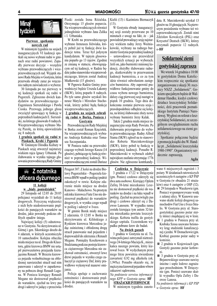 4 Min¹³ tydzieñ WIADOMOCI 4 4 Pierwsze spotkania nowych rad W minionym tygodniu na sesjach inauguracyjnych VI kadencji spotkali siê nowo wybrani radni w gminach oraz radni powiatowi. Zapad³y pierwsze decyzje wszêdzie wybrano przewodnicz¹cych i wiceprzewodnicz¹cych rad. Wyj¹tek stanowi Rada Miejska w Gostyniu, która przerwa³a obrady zaraz po wrêczeniu radnym zawiadczeñ o wyborze. 30 listopada po raz pierwszy w tej kadencji spotkali siê radni w Pogorzeli. Zg³oszono dwóch kandydatów na przewodnicz¹cego Eugeniusza Sierszulskiego i Paw³a Cioska. Przewag¹ jednego g³osu zwyciê¿y³ sprawuj¹cy tê funkcjê w poprzednich kadencjach E. Sierszulski, na którego g³osowa³o 8 radnych. Wiceprzewodnicz¹c¹ wybrano Mariê Pazo³ê, za któr¹ opowiedzia³o siê 8 radnych. 1 grudnia spotkali siê radni w Piaskach, Krobi i Pêpowie W Gminnym Orodku Kultury w Piaskach sesjê otworzy³ najstarszy wiekiem rajca Ignacy Urbaniak. Po lubowaniu w wyniku tajnego g³osowania przewodnicz¹c¹ Rady Gminy p Z notatnika oficera dy¿urnego 11 kolizji w bia³y poniedzia³ek 29 listopada od 12:05 do 20:05 policjanci wyje¿d¿ali do 11 kolizji drogowych. Przyczyn¹ wiêkszoci z nich by³o niedostosowanie prêdkoci do panuj¹cych warunków na drodze, jakie powsta³y podczas obfitych opadów niegu. Najwiêcej kolizji (5) odnotowano w Gostyniu. Na skrzy¿owaniu ul. Górnej i gen. Sikorskiego dosz³o do 4 zdarzeñ, w których uczestniczy³o 10 samochodów. Kolejna st³uczka mia³a miejsce na ul. Droga do Klasztoru, gdzie kierowca BMW nie ust¹pi³ pierwszeñstwa przejazdu kieruj¹cemu Renault. W Brzeziu kierowca pojazdu wolnobie¿nego na oblodzonej nawierzchni straci³ nad nim panowanie i uderzy³ w zaparkowany na poboczu drogi Renault Laguna. W Poniecu kieruj¹cy Renault Megane nie dostosowa³ prêdkoci do warunków, zjecha³ na lewy pas drogi i uderzy³ w jad¹cy z przeciwka NOWA gazeta gostyñska 47/10 Piaski zosta³a Irena Ró¿alska. Otrzymuj¹c 15 g³osów poparcia. Na wiceprzewodnicz¹cych równie¿ jednog³onie wybrano Jana ¯alika i I. Urbaniaka. W Krobi na przewodnicz¹cego wybrano Ireneusza Jówiaka, który pe³ni³ ju¿ tê funkcjê dwie kadencje temu. Teraz by³ jedynym kandydatem. W tajnym g³osowaniu popar³o go 13 rajców. Zgodnie ze zmian¹ w statucie, obowi¹zuj¹cym od tej kadencji, w Radzie bêdzie jedno stanowisko wiceprzewodnicz¹cego, którym zosta³ Andrzej Mia³kowski (15 g³osów). W Pêpowie Radzie Gminy przewodniczyæ bêdzie Urszula £akomy (SKW), któr¹ popar³o 8 radnych. Po tyle samo g³osów uzyskali Ireneusz Matyla i Miros³aw Stachowiak, którzy pe³niæ bêd¹ funkcje wiceprzewodnicz¹cych. 2 grudnia na sesjach zebrali siê radni w Borku, Poniecu i Gostyniu Przewodnicz¹cym Rady Miejskiej w Borku zosta³ Roman Krêcio³ek. Na wiceprzewodnicz¹cych wybrano Andrzeja Kubiaka oraz Tomasza Szczepaniaka. W Poniecu radni na przewodnicz¹cego wybrali Jerzego Kusza (14 g³osów), pe³ni¹cego tê funkcjê równie¿ w poprzedniej kadencji. Wiceprzewodnicz¹cymi zostali Dariusz Kieli (13) i Kazimiera Biernaczyk (13). W Gostyniu obrady inauguracyjnej sesji zosta³y przerwane po 10 minutach z uwagi na fakt, ¿e jak powiedzia³ prowadz¹cy sesjê najstarszy wiekiem radny Jerzy Woniakowski, wybrany na radnego burmistrz Gostynia poprzedniej kadencji ustawodawca nie przewidzia³ wszystkich sytuacji po wyborach. Jeli on, jako burmistrz minionej kadencji, z³o¿y³by lubowanie radnego, skutkowa³oby to przerwaniem kadencji burmistrza, a co za tym idzie równie¿ odwo³aniem zastêpców burmistrza. Aby zapewniæ prawid³owe funkcjonowanie gminy do czasu wyboru nowego burmistrza, dalszy ci¹g pierwszej sesji nast¹pi w pi¹tek 10 grudnia. Tego dnia dokoñczona zostanie pierwsza sesja i prawdopodobnie odbêdzie siê kolejna, na której lubowanie z³o¿y nowo wybrany burmistrz Jerzy Kulak. Tak¿e 2 grudnia mia³a miejsce inauguracyjna sesja Rady Powiatu. Po lubowaniu przyst¹piono do wyboru przewodnicz¹cego. Radny Alfred Siama (SKW) zg³osi³ na to stanowisko Roberta Marcinkowskiego (SKW), który pe³ni³ tê funkcjê w poprzedniej kadencji. Ponadto R. Marcinkowski w wyborach zdoby³ najwiêksze zaufanie otrzymuj¹c 1776 g³osów. Nie zg³oszono kontrkandy- data. R. Marcinkowski uzyska³ 13 g³osów na 18 g³osuj¹cych. Na pierwszym posiedzeniu wybrano te¿ wiceprzewodnicz¹cych. Zostali nimi Zdzis³aw Kowalczyk (PSL) oraz Krzysztof Deutsch (SKW), którzy otrzymali poparcie 12 radnych. o-HF Peugeot 307. Z kolei na drodze Bielawy Pogorzelskie Pogorzela kierowca BMW wpad³ w polizg i podró¿ zakoñczy³ w rowie. Kolejne zdarzenie mia³o miejsce na drodze Kunowo Ma³achowo. Na prostym odcinku kierowca Fiata Uno nie dostosowa³ prêdkoci do warunków drogowych, w wyniku czego wpad³ w polizg i uderzy³ w Iveco. W gminie Borek mia³y miejsce 2 zdarzenia. O 12:05 w Borku na skrzy¿owaniu ul. Kiliñskiego z Rynkiem kierowca Mercedesa jad¹c zanie¿on¹ i oblodzon¹ drog¹ straci³ panowanie nad pojazdem i doprowadzi³ do zderzenia z Renault Megane. Pomiêdzy Koszkowem a Studziann¹ podczas postoju kierowca ciê¿arowego Mercedesa nie zachowa³ ostro¿noci, otworzy³ lewe drzwi pojazdu w wyniku czego zahaczy³ je ciê¿arowy Daf, który prawid³owo wykonywa³ manewr omijania. Policja apeluje o zachowanie ostro¿noci i dostosowanie prêdkoci do panuj¹cych warunków na drodze. Czo³ówka w Dziêczynie 3 grudnia o 17:22 w Dziêczynie (gm. Poniec) czo³owo zderzy³y siê dwa auta osobowe. Kieruj¹cy Oplem Zafir¹ 38-letni mieszkaniec Leszna nie dostosowa³ prêdkoci do warunków na drodze i na ³uku wpad³ w polizg. Zjecha³ na przeciwleg³y pas drogi i czo³owo zderzy³ siê z Daewoo Lanosem. W wypadku ranna zosta³a kieruj¹ca tym autem 32-letnia mieszkanka powiatu leszczyñskiego. Kobieta trafi³a do gostyñskiego szpitala. Uczestnikom wypadku pobrano krew do badañ. Na dwóch gazach 3 grudnia w Gostyniu na ul. Tuwima policjanci zatrzymali nietrzewego 24-letniego Macieja K., mieszkañca naszeg