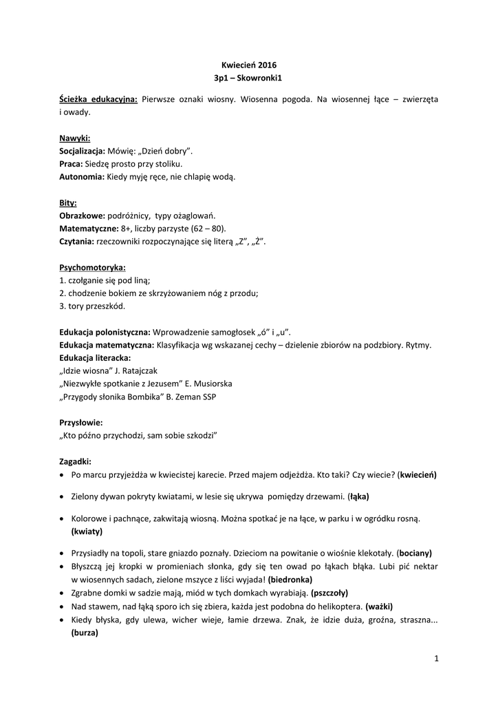 Kwiecień 2016 3p1 – Skowronki1 Ścieżka edukacyjna: Pierwsze oznaki wiosny. Wiosenna pogoda. Na wiosennej łące – zwierzęta i owady. Nawyki: Socjalizacja: Mówię: „Dzień dobry”. Praca: Siedzę prosto przy stoliku. Autonomia: Kiedy myję ręce, nie chlapię wodą. Bity: Obrazkowe: podróżnicy, typy ożaglowań. Matematyczne: 8+, liczby parzyste (62 – 80). Czytania: rzeczowniki rozpoczynające się literą „Z”, „Ż”. Psychomotoryka: 1. czołganie się pod liną; 2. chodzenie bokiem ze skrzyżowaniem nóg z przodu; 3. tory przeszkód. Edukacja polonistyczna: Wprowadzenie samogłosek „ó” i „u”. Edukacja matematyczna: Klasyfikacja wg wskazanej cechy – dzielenie zbiorów na podzbiory. Rytmy. Edukacja literacka: „Idzie wiosna” J. Ratajczak „Niezwykłe spotkanie z Jezusem” E. Musiorska „Przygody słonika Bombika” B. Zeman SSP Przysłowie: „Kto późno przychodzi, sam sobie szkodzi” Zagadki: Po marcu przyjeżdża w kwiecistej karecie. Przed majem odjeżdża. Kto taki? Czy wiecie? (kwiecień) Zielony dywan pokryty kwiatami, w lesie się ukrywa pomiędzy drzewami. (łąka) Kolorowe i pachnące, zakwitają wiosną. Można spotkać je na łące, w parku i w ogródku rosną. (kwiaty) Przysiadły na topoli, stare gniazdo poznały. Dzieciom na powitanie o wiośnie klekotały. (bociany) Błyszczą jej kropki w promieniach słonka, gdy się ten owad po łąkach błąka. Lubi pić nektar w wiosennych sadach, zielone mszyce z liści wyjada! (biedronka) Zgrabne domki w sadzie mają, miód w tych domkach wyrabiają. (pszczoły) Nad stawem, nad łąką sporo ich się zbiera, każda jest podobna do helikoptera. (ważki) Kiedy błyska, gdy ulewa, wicher wieje, łamie drzewa. Znak, że idzie duża, groźna, straszna... (burza) 1 Jak się nazywają te drobniutkie kulki, które na podwórko zrzucają ciemne chmurki? (grad) Rankiem się srebrzy na łące, potem wysuszy ją słońce. (rosa) Zadania logopedyczne: Ćwiczenia fonacyjne: Co mówi bocian, gdy żabkę zjeść chce? Kle, kle, kle. Co mówi żabka, gdy bocianów tłum? Kum, kum, kum. Co mówi kotek, gdy mleczka by chciał? Miau, miau, miau. Co mówi kogut, gdy budzi się w kurniku? Kukuryku. Co mówi koza, gdy jeść jej się chce? Me, me, me. Co mówi krowa, gdy brak jej tchu? Mu, mu, mu. Co mówi piesek, gdy kości by chciał? Hau, hau, hau Co mówi baran, gdy spać mu się chce? Be, be, be. Ćwiczenia języka: wypychanie językiem policzków, unoszenie języka za górne zęby i cofanie go do podniebienia miękkiego, liczenie górnych zębów czubkiem języka przy szeroko otwartych ustach, kląskanie językiem (konik), ”malowanie” językiem podniebienia przy szeroko otwartych ustach, naprzemienne unoszenie języka za górne i dolne zęby przy szeroko otwartych ustach. Wiersze: Z. Baryła „Wiosenna łąka” M. Strzałkowska „Moi mili” Wiosenna łąka w promieniach słońca cała zielona jest i kwitnąca. Pszczoły, motyle nad nią fruwają, a w trawie świerszcze koncerty grają. Życie pędzi wciąż do przodu, coraz prędzej gna i bryka i czasami w tym pośpiechu coś ważnego nam umyka. Rosną na łące białe stokrotki, wierzby nad rzeką pokryły kotki. Żaby rechoczą, śpiewają ptaki, do gniazd dla piskląt znoszą robaki. A więc wniosek dzisiaj stawiam, aby każdy z nas spróbował przy okazji, bez okazji, mówić częściej takie słowa: Żółte kaczeńce na łące kwitną, niebo ma barwę jasnobłękitną. Wśród kwiatów pszczoły pilnie pracują, zbierają nektar, miód produkują. Słoneczko grzeje, stopniały śniegi, na noskach dzieci są pierwsze piegi. Cieszą się dzieci i ziemia cała, że wiosna do nas już zawitała. Do widzenia, i dzień dobry co tam słychać?, jak się czujesz? i poproszę, i przepraszam oraz proszę i dziękuję. Wtedy ludziom na tym świecie sympatyczniej ciut by było. No, a przecież o to chodzi, by się wszystkim milej żyło! 2 Piosenka: „Moje dobre wychowanie” – Jedynkowe Przedszkole 1. Chwali mnie babcia, chwali mnie dziadek, chwali sąsiadka, Tadek - niejadek. Chwali mnie ciocia, chwali mnie wujek, bo zawsze mówię: proszę, dziękuję. Ref: Grunt to dobre wychowanie, powiem Tacie, powiem Mamie, żeby zawsze mnie uczyli, by się później nie wstydzili. 2. Chwali mnie siostra, chwali pies Burek, chwali kuzynka, Jurek-Ogórek. Chwali mnie Pani, stryj bardzo mądry, mówię przepraszam, mówię dzień dobry. Muzyka klasyczna: 1. Luigi Boccherini – Menuet As-dur. 2. Franz Schubert – Marsz wojskowy. Modlitwy: Modlitwa poranna: Alleluja! Biją dzwony, głosząc w świata wszystkie strony, że zmartwychwstał Pan! Modlitwa przed posiłkiem: Pobłogosław Panie Boże, nas i te dary, które z Twojej dobroci będziemy spożywać. Przez Chrystusa Pana naszego. Amen Modlitwa po posiłku: Za ten posiłek i wszystkie dary Twej dobroci chwalimy Ciebie Boże, Przez Chrystusa Pana naszego. Amen. Modlitwa na zakończenie dnia: Chwała Ojcu i Synowi i Duchowi Świętemu, Jak była na początku, teraz i zawsze i na wieki wieków. Amen. Muzyka: Ćwiczenia słuchowe - krótkie zagadki melodyczne, oparte na poznanych już piosenkach. - rozpoznawanie odgłosów znanych dzieciom z codziennego otoczenia - różne sposoby wykonywania prostych rytmów: klaskanie w ręce, uderzanie w kolana, pukanie palcem w podłogę itp. Ćwiczenia ruchowo-rytmiczne 3 - zabawy o charakterze orientacyjnym i organizacyjnym. Wyrabianie szybkiej reakcji ruchowej. - formowanie rzędu, koła, par, dwóch kółek - marsz, bieg, krok dosuwany do przodu w ustawieniu w kole i w parach - ćwiczenie cwału bocznego - próby obracania się podskokami w parach - dostosowywanie ruchu do słyszanego akompaniamentu Piosenki „W naszym ogródeczku” W naszym ogródeczku / zrobimy porządki/ 3x Wygrabimy ścieżki /przekopiemy grządki/ 3x Raz dwa trzy. Potem w miękką ziemię /wsiejemy nasionka/ 3x Będą się wygrzewać /na wiosennym słonku / 3x Raz dwa trzy. Spadnie ciepły deszczyk /i