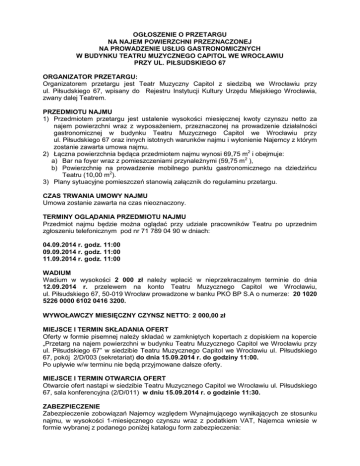 OGŁOSZENIE O PRZETARGU NA NAJEM POWIERZCHNI PRZEZNACZONEJ NA PROWADZENIE USŁUG GASTRONOMICZNYCH W BUDYNKU TEATRU MUZYCZNEGO CAPITOL WE WROCŁAWIU PRZY UL. PIŁSUDSKIEGO 67 ORGANIZATOR PRZETARGU: Organizatorem przetargu jest Teatr Muzyczny Capitol z siedzibą we Wrocławiu przy ul. Piłsudskiego 67, wpisany do Rejestru Instytucji Kultury Urzędu Miejskiego Wrocławia, zwany dalej Teatrem. PRZEDMIOTU NAJMU 1) Przedmiotem przetargu jest ustalenie wysokości miesięcznej kwoty czynszu netto za najem powierzchni wraz z wyposażeniem, przeznaczonej na prowadzenie działalności gastronomicznej w budynku Teatru Muzycznego Capitol we Wrocławiu przy ul. Piłsudskiego 67 oraz innych istotnych warunków najmu i wyłonienie Najemcy z którym zostanie zawarta umowa najmu. 2) Łączna powierzchnia będąca przedmiotem najmu wynosi 69,75 m2 i obejmuje: a) Bar na foyer wraz z pomieszczeniami przynależnymi (59,75 m2 ), b) Powierzchnię na prowadzenie mobilnego punktu gastronomicznego na dziedzińcu Teatru (10,00 m2). 3) Plany sytuacyjne pomieszczeń stanowią załącznik do regulaminu przetargu. CZAS TRWANIA UMOWY NAJMU Umowa zostanie zawarta na czas nieoznaczony. TERMINY OGLĄDANIA PRZEDMIOTU NAJMU Przedmiot najmu będzie można oglądać przy udziale pracowników Teatru po uprzednim zgłoszeniu telefonicznym pod nr 71 789 04 90 w dniach: 04.09.2014 r. godz. 11:00 09.09.2014 r. godz. 11:00 11.09.2014 r. godz. 11:00 WADIUM Wadium w wysokości 2 000 zł należy wpłacić w nieprzekraczalnym terminie do dnia 12.09.2014 r. przelewem na konto Teatru Muzycznego Capitol we Wrocławiu, ul. Piłsudskiego 67, 50-019 Wrocław prowadzone w banku PKO BP S.A o numerze: 20 1020 5226 0000 6102 0416 3200. WYWOŁAWCZY MIESIĘCZNY CZYNSZ NETTO: 2 000,00 zł MIEJSCE I TERMIN SKŁADANIA OFERT Oferty w formie pisemnej należy składać w zamkniętych kopertach z dopiskiem na kopercie „Przetarg na najem powierzchni w budynku Teatru Muzycznego Capitol we Wrocławiu przy ul. Piłsudskiego 67” w siedzibie Teatru Muzycznego Capitol we Wrocławiu ul. Piłsudskiego 67, pokój 2/D/003 (sekretariat) do dnia 15.09.2014 r. do godziny 11:00. Po upływie w/w terminu nie będą przyjmowane dalsze oferty. MIEJSCE I TERMIN OTWARCIA OFERT Otwarcie ofert nastąpi w siedzibie Teatru Muzycznego Capitol we Wrocławiu ul. Piłsudskiego 67, sala konferencyjna (2/D/011) w dniu 15.09.2014 r. o godzinie 11:30. ZABEZPIECZENIE Zabezpieczenie zobowiązań Najemcy względem Wynajmującego wynikających ze stosunku najmu, w wysokości 1-miesięcznego czynszu wraz z podatkiem VAT, Najemca wniesie w formie wybranej z podanego poniżej katalogu form zabezpieczenia: a) kaucja pieniężna, b) bezwarunkowa gwarancja bankowa, c) bezwarunkowa gwarancja ubezpieczeniowa. UDOSTĘPNIENIE REGULAMINU PRZETARGU I WZORU UMOWY Regulamin przetargu wraz z wzorem umowy zamieszczony zostanie na stronie internetowej Teatru www.teatr-capitol.pl oraz udostępniony w siedzibie Teatru Muzycznego Capitol we Wrocławiu przy ul. Piłsudskiego 67, pokój 2/D/003 (sekretariat) od poniedziałku do piątku w godzinach od 8:00 do 16:00. Wrocław, dnia 01.09.2014 r. Dyrektor Naczelny i Artystyczny Teatru Muzycznego CAPITOL Konrad Imiela