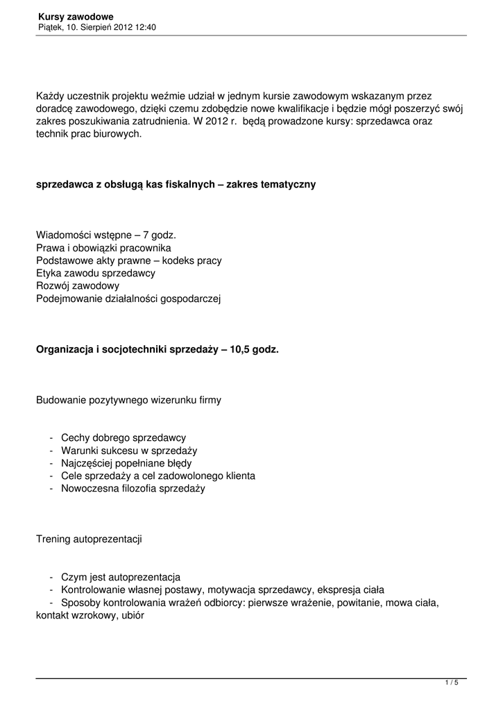 Kursy zawodowe Piątek, 10. Sierpień 2012 12:40 Każdy uczestnik projektu weźmie udział w jednym kursie zawodowym wskazanym przez doradcę zawodowego, dzięki czemu zdobędzie nowe kwalifikacje i będzie mógł poszerzyć swój zakres poszukiwania zatrudnienia. W 2012 r. będą prowadzone kursy: sprzedawca oraz technik prac biurowych. sprzedawca z obsługą kas fiskalnych – zakres tematyczny Wiadomości wstępne – 7 godz. Prawa i obowiązki pracownika Podstawowe akty prawne – kodeks pracy Etyka zawodu sprzedawcy Rozwój zawodowy Podejmowanie działalności gospodarczej Organizacja i socjotechniki sprzedaży – 10,5 godz. Budowanie pozytywnego wizerunku firmy - Cechy dobrego sprzedawcy Warunki sukcesu w sprzedaży Najczęściej popełniane błędy Cele sprzedaży a cel zadowolonego klienta Nowoczesna filozofia sprzedaży Trening autoprezentacji - Czym jest autoprezentacja - Kontrolowanie własnej postawy, motywacja sprzedawcy, ekspresja ciała - Sposoby kontrolowania wrażeń odbiorcy: pierwsze wrażenie, powitanie, mowa ciała, kontakt wzrokowy, ubiór 1/5 Kursy zawodowe Piątek, 10. Sierpień 2012 12:40 Psychologia obsługi klienta - Aktywne słuchanie Język sprzedawcy Przestrzeń w komunikacji Bariery komunikacyjne Zasady prowadzenia rozmowy z klientem - Budowanie kontaktu i identyfikacja potrzeb klienta Interesy i stanowiska w rozmowach handlowych Argumentacja cenowa Radzenie sobie z wątpliwościami klientów Radzenie sobie w sytuacjach trudnych i stresowych Socjotechniki sprzedaży - Kroki wiodące do sprzedaży Etapy aktywnej sprzedaży Typowe gry handlowe Metody odpierania zarzutów Obrona przed presją i manipulacją Promocja – 3,5 godz. - Zasady i cele marketingu Skuteczny marketing Techniki ekspresji Dekorowanie wnętrza sklepu i okna wystawowego Obsługa kasy fiskalnej - 34 godz. 2/5 Kursy zawodowe Piątek, 10. Sierpień 2012 12:40 Informacje ogólne Wymiana rolki papieru i taśmy barwiącej Operacje w trybie „PRG” Operacje w trybie „REG” Praca w trybie „X” i „Z” - Raporty dzienne i narastające Raporty kodów Raporty obrotów Raporty fiskalne Urządzenia dodatkowe wspierające pracę kasjera Kasa fiskalna w połączeniu z komputerowym programem obsługi sprzedaży technik obsługi biura – zakres tematyczny Organizacja pracy biurowej – 34 godz. Podstawy działania biura Wyposażenie i urządzenia techniki biurowej Schemat organizacyjny Zadania sekretariatu - Współpraca z szefem i organizowanie pracy szefa Przyjmowanie interesantów Przyjmowanie i łączenie rozmów telefonicznych Inne prace wykonywane w sekretariacie Organizacja obiegu dokumentów, przyjmowanie korespondencji Ewidencjowanie, archiwizacja dokumentów Korespondencja biurowa Dokumentacja handlowa, faktury vat, rachunki Klasyfikacja dokumentów i systemy przechowywania akt Techniki sporządzania różnych dokumentów biurowych 3/5 Kursy zawodowe Piątek, 10. Sierpień 2012 12:40 Rozliczanie podróży służbowej Organizacja i zarządzanie – 24 godz. Zarządzanie czasem Kierowanie pracą zespołową, style kierowania ludźmi Znaczenie sprawnej organizacji Zasady podziału pracy Metody planowania i prowadzenia sekretariatu Kultura – 3,5 godz. Zasady asertywności Savoir – vivre w usługach firmy - Ustalanie hierarchii osób - Pozdrawianie i witanie - Przedstawianie i tytułowanie Rozmowy telefoniczne w biurze Przyjmowanie interesantów Profesjonalne podejście do klienta Umiejętność właściwego zachowania w różnych miejscach i sytuacjach Zagadnienia prawne – 3,5 godz. Podstawowe zasady prawa pracy Wynagrodzenie za pracę i inne świadczenia Czas pracy Obowiązki pracownika i pracodawcy 4/5 Kursy zawodowe Piątek, 10. Sierpień 2012 12:40 5/5