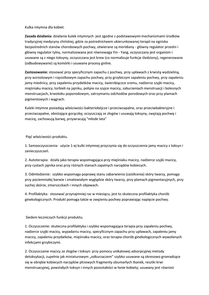 Kulka intymna dla kobiet. Zasada działania: działanie kulek intymnych jest zgodne z podstawowymi mechanizmami środków tradycyjnej medycyny chioskiej, gdzie za pośrednictwem ukierunkowanej terapii na ogniska bezpośrednich stanów chorobowych pochwy, otwierane są meridiany - główny regulator przedni i główny regulator tylny, normalizowana jest równowaga Yin - Yang, oczyszczany jest organizm i usuwane są z niego toksyny, oczyszczana jest krew (co normalizuje funkcje śledziony), regenerowane (odbudowywane) są komórki i usuwane procesy gnilne. Zastosowanie: stosowad przy specyficznym zapachu z pochwy, przy upławach z krwistą wydzieliną, przy wzrostowym i rzęsistkowym zapachu pochwy, przy grzybiczym zapaleniu pochwy, przy zapaleniu jamy miednicy, przy zapaleniu przydatków macicy, świerzbiączce sromu, nadżerce szyjki macicy, mięśniaku macicy, torbieli na jajniku, polipie na szyjce macicy, zaburzeniach menstruacji i bolesnych menstruacjach, krwotoku poporodowym, zatrzymaniu odchodów porodowych oraz przy plamach pigmentowych i wągrach. Kuleki intymne posiadają właściwości bakteriobójcze i przeciwzapalne, oraz przeciwbakteryjne i przeciwzapalne, obniżające gorączkę; oczyszczają ze złogów i usuwają toksyny, zwężają pochwę i macicę, zachowują barwę, przywracają "młode lata" Pięd właściwości produktu. 1. Samooczyszczenia: użycie 1-ej kulki intymnej przyczynia się do oczyszczenia jamy macicy z toksyn i zanieczyszczeo. 2. Autoterapia: działa jako terapia wspomagająca przy mięśniaku macicy, nadżerce szyjki macicy, przy cystach jajnika oraz przy różnych stanach zapalnych narządów kobiecych. 3. Odmłodzenie: szybko wspomaga poprawę stanu zabarwienia (zażółcenia) skóry twarzy, pomaga przy pociemniałej barwie i zmatowiałym wyglądzie skóry twarzy, przy plamach pigmentacyjnych, przy suchej skórze, zmarszczkach i innych objawach. 4. Profilaktyka: stosowad przynajmniej raz w miesiącu, jest to skuteczna profilaktyka chorób ginekologicznych. Produkt pomaga także w zwężeniu pochwy poprawiając napięcie pochwy. Siedem leczniczych funkcji produktu. 1. Oczyszczenie: skuteczna profilaktyka i szybko wspomagająca terapia przy zapaleniu pochwy, nadżerce szyjki macicy, wypadaniu macicy, specyficznym zapachu przy upławach, zapaleniu jamy macicy, zapaleniu przydatków, mięśniaku macicy, oraz terapia chorób ginekologicznych wywołanych infekcjami grzybiczymi. 2. Oczyszczanie macicy ze złogów i toksyn: przy pomocy unikatowej adsorpcyjnej metody detoksykacji, zupełnie jak miniaturowym „odkurzaczem” szybko usuwane są okresowo gromadzące się w obrębie kobiecych narządów płciowych fragmenty obumarłych tkanek, resztki krwi menstruacyjnej, powstałych toksyn i innych pozostałości w łonie kobiety; usuwany jest również nieprzyjemny specyficzny zapach, usuwane jest źródło infekcji grzybiczych, stymulowana jest przemiana materii, aktywizowane wytwarzanie komórek pnia, stymulowane wytwarzanie hormonów żeoskich, przywracane są normalne fizjologiczne funkcje organów reprodukcyjnych. 3. Regeneracja: równocześnie z wyeliminowaniem nadżerki i ropnych materii, odbudowuje również martwicze komórki, stymuluje wydzielanie gruczołów; regeneruje, reguluje, wyrównuje i nawilża nierównomierności w tkankach szyjki macicy i pochwy, przywraca sprężystośd i wrażliwośd pochwy, pomaga w kurczeniu się macicy po porodzie, odbudowuje uszkodzone drogi rodne oraz całkowicie odbudowuje i utrzymuje zdrową mikroflorę środowiska wewnętrznego organów. 4. Spowalnia starzenie: odbudowuje obumarłe komórki, stymuluje wydzielanie, regeneruje jamę macicy i pochwy, sprzyja kurczeniu się pochwy, zwiększa wrażliwośd, poprawia pożądanie seksualne, jak gdyby przywraca stan dziewictwa dzięki czemu poprawia jakośd życia płciowego. Pomaga odsunąd w czasie objawy klimakteryczne, usuwa suchośd pochwy i brak pociągu płciowego, likwiduje drażliwości i inne symptomy. 5. Efekt kosmetyczny: poprawia i odbudowuje normalne fizjologiczne funkcje żeoskich organów płciowych, poprawia krwioobieg i aktywizuje komórki odpornościowe, reguluje działanie gruczołów wydzielania wewnętrznego, usuwa i odbarwia plamy pigmentowe, dokładnie wybiela skórę i czyni ją żywą i rumianą, zmniejsza zmarszczki, dlatego dodaje kobiecie nieprzemijającego czaru. 6. Uzdrawianie: kulki intymne stosowane są w charakterze terapii wspomagającej w chorobach oraz w charakterze profilaktyki chorób. Po zakooczeniu menstruacji użycie 1-2 kulek będzie sprzyjad procesowi normalizacji przemiany materii, wybawi od chorób ginekologicznych, zapewnia zdrową energię życiową. 7. Przy bezpłodności: kulki intymne wykazują efekt regulujący i działanie torujące przy bezpłodności spowodowane niedrożnością jajowodów oraz utratą równowagi kwasowo-zasadowej środowiska wewnętrznego pochwy. Nowa koncepcja kosmetyczna. Zgodnie z teorią Tradycyjnej Medycyny Chioskiej, 12 głównych meridianów skierowanych ku górze w kierunku twarzy nawilżających skórę i nadających jej blask, oraz dodatkowych 8 "cudownych" meridianów, jak również organy wewnętrzne, przez które przepływa krew i Chi, są za sobą ściśle powiązane. Przy zaburzeniach wewnętrznych powstaje niewydolnośd wątroby i nerek, rozstrój żołądka i jelit, twarz traci swą barwę, znika blask, skóra zaczyna się szybko starzed, pojawiają się plamy pigmentowe, pryszcze, wągry i inne zmiany patologiczne, skóra twarzy traci wilgod i ukrwienie, szkodliwa Chi i toksyny wywołują ostudę. Kulki intymne umieszczone w łonie kobiety (w którym spotyka się pięd meridianów głównych narządów organizmu kobiecego), skutecznie udrażniają kanały meridianowe, regulują skład krwi, równoważą Yin - Yang w organizmie, regulują system wydzielania wewnętrznego - co łącznie daje wielki efekt kosmetyczny. Układ płciowy aktywnie uczestniczy w oczyszczaniu organizmu z toksyn