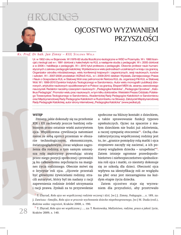 ARTICLES OJCOSTWO WYZWANIEM PRZYSZŁOŚCI K s . P rof. Dr hab. Jan Zimny – K UL S t a l o wa W o l a Ur. w 1952 roku w Bojanowie. W l.1976-82 studia filozoficzno-teologiczne w WSD w Przemyślu. W r. 1990 licencjat z teologii zaś w r. 1991 doktorat z katechetyki na KUL a następnie studia z pedagogiki. W r. 2005 doktorat a w 2006 r. habilitacja z pedagogiki. W r. 2010 tytuł profesora z pedagogiki. Obecnie profesor nauk humanistycznych z zakresu pedagogiki katolickiej. Wykładowca w wielu jednostkach uczelnianych w kraju i za granicą. Organizator ośrodka młodzieżowego, wielu konferencji krajowych i zagranicznych, sesji naukowych, kursów i szkoleń. W l. 2007-2008 prodziekan WZNoS KUL, w l. 2009-2010 dziekan Wydziału Zamiejscowego Prawa i Nauk o Gospodarce KUL w Stalowej Woli oraz pełnomocnik Rektora KUL ds. organizacji Filii KUL w Stalowej Woli. W l. 1999-2010 Dyrektor Instytutu Teologicznego w Sandomierzu. Autor wielu monografii i publikacji zbiorowych, artykułów naukowych opublikowanych w Polsce i za granicą. Ekspert MEN ds. awansu zawodowego nauczycieli. Redaktor naczelny czasopism naukowych: „Pedagogika Katolicka”, „Pedagogia Ojcostwa”, „Katolikus Pedagógia”. Promotor wielu prac naukowych, w tym kilku doktoratów. Wieloletni Prezes Oddziału Polskiego Towarzystwa Teologicznego w Sandomierzu, Akademickiej Rady Pedagogów Katolickich w Sandomierzu oraz Międzynarodowej Rady Pedagogów Katolickich w Rużomberku na Słowacji. Założyciel Międzynarodowej Rady Pedagogiki Katolickiej, autor strony internetowej „Pedagogika Katolicka” (www.pedkat.pl). Wstęp Zmiany, jakie dokonały się na przełomie XIX i XX zachwiały jeszcze bardziej osłabionym przez ostatnie wieki autorytetem ojca. Współczesna cywilizacja natomiast niesie ze sobą oprócz przemian w obszarze technologicznym, ekonomicznym, światopoglądowym, coraz większe zagrożenia dla rodziny, a tym samym umniejsza rolę mężczyzny powodując utratę przez niego pozycji społecznej i prowadzi ją ku całkowitemu zepchnięciu na margines życia rodzinnego. Obecnie mówi się o kryzysie roli ojca. „Ojcowie przestali być głównymi żywicielami rodziny, stracili autorytet, który był im nadany z racji zapewnienia rodzinie źródeł utrzymania i racji prawa. Zyskali za to przyzwolenie 1 społeczne na bliższy kontakt z dzieckiem, a także sprawowanie funkcji typowo opiekuńczych. Ojciec na spacerze z małym dzieckiem nie budzi już zdziwienia, a raczej sympatię otoczenia”1. Cechą charakterystyczną współczesnej rodziny jest to, że: „granice pomiędzy rolą matki i ojca stopniowo zaczęły się zacierać, a ich postawy względem dziecka – uzupełniać”2. Zatem istnieje ogromne prawdopodobieństwo i niebezpieczeństwo ujednolicenia roli ojca i matki, co niestety dokonuje się ze szkodą dla dzieci. Obecność ojca wpływa na identyfikację roli ze względu na płeć oraz jest niezastąpiona na każdym etapie życia dziecka. Zatem ojcostwo staje się wyzwaniem dla przyszłości, aby przetrwało T. Zbyrad, Rola ojca we współczesnej rodzinie wczoraj i dziś, [w:] J. Zimny, Pedagogia….s. 189, za: J. Zawisza –Smejlis, Rola ojca w procesie wychowania dziecka niepełnosprawnego, [w:] M. Duda (red.), Rodzina wobec zagrożeń, Kraków 2008, s. 190. 28 2 T. Zbyrad, Rola ojca we współczesne j…, za: T. Rostowska, Małżeństwo, rodzina, praca a jakość życia, Kraków 2009, s. 140. ARTYKUŁY musi podjąć walkę o zachowanie swojej tożsamości i roli w rodzinie. W wyniku przeprowadzonych badań rysuje się przed nami pewien obraz ojcostwa, które ma szansę bytu, jeśli jest oparte na silnym fundamencie wiary i czerpie swoje źródło ze wzoru Ojcostwa Boga. Ojcostwo, aby przetrwało musi podjąć walkę z sekularyzującą się rzeczywistością, nie poddać się relatywizmowi, liberalizmowi i hedonizmowi. Przeprowadzone badania wskazują, że jedynie w rodzinie ma ono rację bytu, rozumianej, jako związek kobiety i mężczyzny, co wybrzmiewa również w opiniach badanych ojców. Na pytanie czy ojcostwo będzie miało szanse bytu w przyszłości jeden z badanych ojców potwierdza powyższe stwierdzenie: „Tak, jeżeli rodzina będzie funkcjonowała jako mama i tata”. Wyzwaniem ojca dzisiaj jest ochrona wartości rodziny, gdyż jak stwierdza jeden z respondentów: „Szansa odrodzenia ojcostwa i przetrwania jest wewnątrz rodziny”. Związek ten dostrzegł już o wiele wcześniej Prorok naszych czasów bł. Jan Paweł II, który wypowiedział zamienne słowa: „Przyszłość świata idzie przez rodzinę”, niejednokrotnie można dodać przez ojcostwo i macierzyństwo właściwe rozumiane. Zatem przyjrzyjmy się czy obraz, jaki przedstawiają nam przeprowadzone badania ma siłę walki z nadchodzącą przyszłością? Poniższy punkt prezentuje weryfikację postawionych w niniejszej pracy hipotez. 1. Jaki obraz obraz ojcostwa? Kończąc prezentację i analizę zebranego materiału badawczego należy stwierdzić, iż okazał się on bardzo bogaty w treść. Ankiety skierowane do oj- ców dzieci uczęszczających do Ochronki Sióstr Służebniczek BDNP Przedszkola Integracyjnego w Dębicy były ciekawą lekturą, ale również umożliwiły autorowi poszerzenie swojej wiedzy na temat roli ojca w rodzinie i znaczenia jego oddziaływań wychowawczych jak i również wzbogaciły doświadczenie pedagogiczne. Przeprowadzone badania miały na celu uzyskanie odpowiedzi na postawione w pracy następujące pytania: 1.Na czym polega rola ojca w rodzinie? 2.Na czym polega udział ojca w wychowaniu dziecka? 3.Jaka jest świadomość ojców znaczenia ich roli w życiu dziecka? Natomiast hipotezy badawcze sformułowane przed przystąpieniem do badań, stanowić miały pewnego rodzaju drogowskazy, które ukierunkują aktywność badacza. Jednak zasadniczą podstawę poszukiwań badawczych stanowiła literatura naukowa omawiająca rolę ojca w rodzinie oraz proces i uwarunkowania oddziaływań wychowawcz