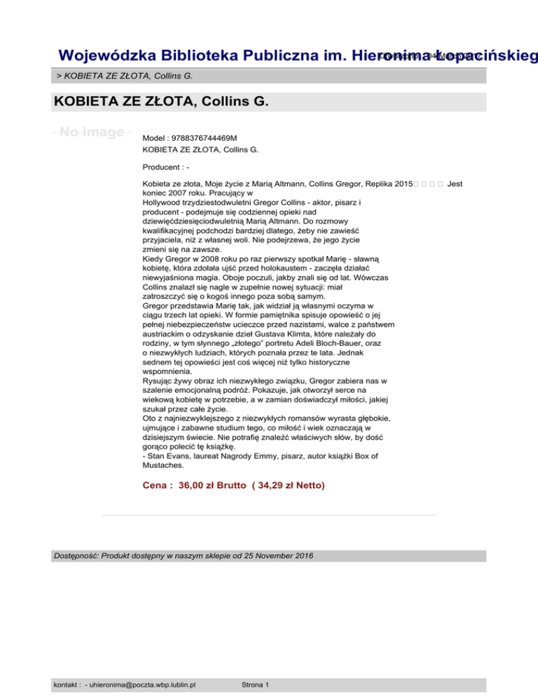 Utworzono : 04Łopacińskieg March 2017 Wojewódzka Biblioteka Publiczna im. Hieronima > KOBIETA ZE ZŁOTA, Collins G. KOBIETA ZE ZŁOTA, Collins G. No image Model : 9788376744469M KOBIETA ZE ZŁOTA, Collins G. Producent : Kobieta ze złota, Moje życie z Marią Altmann, Collins Gregor, Replika 2015���� Jest koniec 2007 roku. Pracujący w Hollywood trzydziestodwuletni Gregor Collins - aktor, pisarz i producent - podejmuje się codziennej opieki nad dziewięćdziesięciodwuletnią Marią Altmann. Do rozmowy kwalifikacyjnej podchodzi bardziej dlatego, żeby nie zawieść przyjaciela, niż z własnej woli. Nie podejrzewa, że jego życie zmieni się na zawsze. Kiedy Gregor w 2008 roku po raz pierwszy spotkał Marię - sławną kobietę, która zdołała ujść przed holokaustem - zaczęła działać niewyjaśniona magia. Oboje poczuli, jakby znali się od lat. Wówczas Collins znalazł się nagle w zupełnie nowej sytuacji: miał zatroszczyć się o kogoś innego poza sobą samym. Gregor przedstawia Marię tak, jak widział ją własnymi oczyma w ciągu trzech lat opieki. W formie pamiętnika spisuje opowieść o jej pełnej niebezpieczeństw ucieczce przed nazistami, walce z państwem austriackim o odzyskanie dzieł Gustava Klimta, które należały do rodziny, w tym słynnego „złotego” portretu Adeli Bloch-Bauer, oraz o niezwykłych ludziach, których poznała przez te lata. Jednak sednem tej opowieści jest coś więcej niż tylko historyczne wspomnienia. Rysując żywy obraz ich niezwykłego związku, Gregor zabiera nas w szalenie emocjonalną podróż. Pokazuje, jak otworzył serce na wiekową kobietę w potrzebie, a w zamian doświadczył miłości, jakiej szukał przez całe życie. Oto z najniezwyklejszego z niezwykłych romansów wyrasta głębokie, ujmujące i zabawne studium tego, co miłość i wiek oznaczają w dzisiejszym świecie. Nie potrafię znaleźć właściwych słów, by dość gorąco polecić tę książkę. - Stan Evans, laureat Nagrody Emmy, pisarz, autor książki Box of Mustaches. Cena : 36,00 zł Brutto ( 34,29 zł Netto) Dostępność: Produkt dostępny w naszym sklepie od 25 November 2016 kontakt : - [email protected] Strona 1