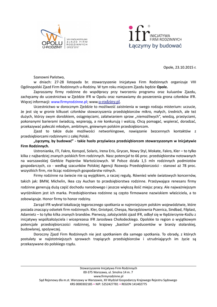 Opole, 23.10.2015 r. Szanowni Państwo, w dniach: 27-28 listopada br. stowarzyszenie Inicjatywa Firm Rodzinnych organizuje VIII Ogólnopolski Zjazd Firm Rodzinnych u-Rodziny. W tym roku miejscem Zjazdu będzie Opole. Zapraszamy firmy rodzinne do współpracy przy tworzeniu programu oraz kuluarów Zjazdu, zachęcamy do uczestnictwa w Zjeździe IFR w Opolu oraz namawiamy do poszerzenia grona członków IFR. Więcej informacji: www.firmyrodzinne.pl; www.u-rodziny.pl. Uczestnictwo w dorocznym Zjeździe to możliwość zaistnienia w swego rodzaju misterium: uczucie, że jest się w gronie kilkuset członków stowarzyszenia przedsiębiorców mikro, małych, średnich, ale też dużych, którzy swym dorobkiem, osiągnięciami, załatwianiem spraw „niemożliwych”, wiedzą, przeżyciami, pokonanymi barierami świadczą, wspierają, a nie konkurują i walczą. Chcą pomagać, wspierać, doradzać, przekazywać pałeczki młodym, ambitnym, gniewnym polskim przedsiębiorcom. Zjazd to także duże możliwości networkingowe, nawiązanie bezcennych kontaktów z przedsiębiorcami rodzinnymi z całej Polski. „Łączymy, by budować” - takie hasło przyświeca przedsiębiorcom stowarzyszonym w Inicjatywie Firm Rodzinnych. Ustronianka, ITI, Fakro, Konspol, Solaris, Irena Eris, Grycan, Nowy Styl, Mokate, Fakro, Kler – to tylko kilka z najbardziej znanych polskich firm rodzinnych. Nasz potencjał to 66 proc. przedsiębiorstw notowanych na warszawskiej Giełdzie Papierów Wartościowych. W Polsce działa 1,5 mln rodzinnych podmiotów gospodarczych, co - według szacunków Polskiej Agencji Rozwoju Przedsiębiorczości - stanowi aż 78 proc. wszystkich firm, nie licząc rodzinnych gospodarstw rolnych. Firmy rodzinne na świecie nie są wyjątkiem, a raczej regułą. Również wiele światowych koncernów, takich jak: BMW, Michelin, Ikea czy Auchan to przedsiębiorstwa rodzinne. Przeżywające renesans firmy rodzinne generują dużą część dochodu narodowego i jeszcze większą ilość miejsc pracy. Ale najważniejszym wyróżnikiem jest ich marka. Przedsiębiorstwa rodzinne są często firmowane nazwiskiem właściciela, a to zobowiązuje. Honor firmy to honor rodziny. Zarząd IFR wybrał lokalizację tegorocznego spotkania w najmniejszym polskim województwie, które posiada znaczący odsetek firm rodzinnych. Kler, Gniotpol, Chespa, Narzędziownia Pszenica, Sindbad, Filplast, Adamietz – to tylko kilka znanych brandów. Pierwszy, założycielski zjazd IFR, odbył się w Kędzierzynie-Koźlu z inicjatywy współzałożyciela i wiceprezesa IFR Jarosława Chołodeckiego. Opolskie to region o wyjątkowym potencjale przedsiębiorczości rodzinnej, to krajowy „bastion” producentów w branży stolarskiej, budowlanej, spożywczej. Doroczny Zjazd Firm Rodzinnych nie jest spotkaniem dla samego spotkania. To obrady, z których postulaty w najistotniejszych sprawach trapiących przedsiębiorców i utrudniających im życie są przekazywane do polskiego rządu. Stowarzyszenie Inicjatywa Firm Rodzinnych 00-375 Warszawa, ul. Smolna 14 m. 7 www.firmyrodzinne.pl Sąd Rejonowy dla m.st. Warszawy w Warszawie, XII Wydział Gospodarczy Krajowego Rejestru Sądowego KRS 0000302185 • NIP: 5252427781 • REGON 141402775 Wydarzenie współorganizują: Urząd Miasta Opola, Opolskie Centrum Rozwoju Gospodarki, Centrum Budownictwa i Wyposażenia Wnętrz domEXPO, Centrum Wystawienniczo-Kongresowe w Opolu, Park Naukowo-Technologiczny w Opolu. Opole spodziewa się 500 gości - przedstawicieli firm rodzinnych wraz z dziećmi. Dorośli wezmą udział w kilkunastu merytorycznych panelach, w trakcie których będą dyskutowane tematy ważne dla firm rodzinnych: sukcesja, kształcenie dualne czy wyzwania prawne. W piątkowy wieczór, 27 listopada br., na zaproszenie Urzędu Miasta Opola uczestnicy Zjazdu obejrzą znakomity spektakl, przygotowany przez Teatr Lalki i Aktora, a w sobotni wieczór odbędzie się, zgodnie z tradycją dorocznych Zjazdów, bankiet „Rodzinnych” i andrzejkowy bal w oprawie Jarka Wasika i jego gości. Dzieci wybiorą się na wycieczkę do Juraparku w Krasiejowie, gdzie pod opieką naukowców zwiedzą Park Nauki i Ewolucji Człowieka. Harry Potter i jego siedziba - zamek w Mosznej, Metamuzeum w Paczkowie, świat robotów w Parku Naukowo-Technologicznym w Opolu - to kolejne niespodzianki dla dorastających sukcesorów firm rodzinnych. Organizatorzy zajmą się też najmłodszymi uczestnikami Zjazdu; zabawę i opiekę zapewnią Waszym pociechom opolscy studenci w specjalnie do tego celu urządzonej strefie na terenie domEXPO. Wydarzenie swoim patronatem objęli: Marszałek Województwa Opolskiego i Prezydent Miasta Opola. Z wyrazami szacunku: prezes zarządu: Andrzej Jacek Blikle Inicjatywa Firm Rodzinnych Zgłoszenia członkowskie oraz zgłoszenia udziału w u-Rodzinach (27-28.11.2015 r): www.firmyrodzinne.pl; www.u-rodziny.pl Kontakt merytoryczny: Teresa Kudyba, Koordynator Zjazdu [email protected] 602374494 Stowarzyszenie Inicjatywa Firm Rodzinnych 00-375 Warszawa, ul. Smolna 14 m. 7 www.firmyrodzinne.pl Sąd Rejonowy dla m.st. Warszawy w Warszawie, XII Wydział Gospodarczy Krajowego Rejestru Sądowego KRS 0000302185 • NIP: 5252427781 • REGON 141402775
