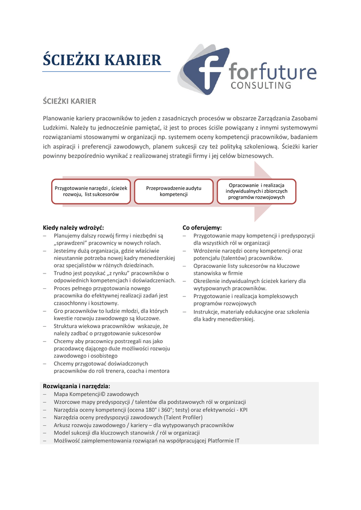 ŚCIEŻKI KARIER ŚCIEŻKI KARIER Planowanie kariery pracowników to jeden z zasadniczych procesów w obszarze Zarządzania Zasobami Ludzkimi. Należy tu jednocześnie pamiętać, iż jest to proces ściśle powiązany z innymi systemowymi rozwiązaniami stosowanymi w organizacji np. systemem oceny kompetencji pracowników, badaniem ich aspiracji i preferencji zawodowych, planem sukcesji czy też polityką szkoleniową. Ścieżki karier powinny bezpośrednio wynikać z realizowanej strategii firmy i jej celów biznesowych. Przygotowanie narzędzi , ścieżek rozwoju, list sukcesorów Przeprowadzenie audytu kompetencji Kiedy należy wdrożyć: Co oferujemy: Planujemy dalszy rozwój firmy i niezbędni są „sprawdzeni” pracownicy w nowych rolach. Jesteśmy dużą organizacja, gdzie właściwie nieustannie potrzeba nowej kadry menedżerskiej oraz specjalistów w różnych dziedzinach. Trudno jest pozyskać „z rynku” pracowników o odpowiednich kompetencjach i doświadczeniach. Proces pełnego przygotowania nowego pracownika do efektywnej realizacji zadań jest czasochłonny i kosztowny. Gro pracowników to ludzie młodzi, dla których kwestie rozwoju zawodowego są kluczowe. Struktura wiekowa pracowników wskazuje, że należy zadbać o przygotowanie sukcesorów Chcemy aby pracownicy postrzegali nas jako pracodawcę dającego duże możliwości rozwoju zawodowego i osobistego Chcemy przygotować doświadczonych pracowników do roli trenera, coacha i mentora Opracowanie i realizacja indywidualnych i zbiorczych programów rozwojowych Przygotowanie mapy kompetencji i predyspozycji dla wszystkich ról w organizacji Wdrożenie narzędzi oceny kompetencji oraz potencjału (talentów) pracowników. Opracowanie listy sukcesorów na kluczowe stanowiska w firmie Określenie indywidualnych ścieżek kariery dla wytypowanych pracowników. Przygotowanie i realizacja kompleksowych programów rozwojowych Instrukcje, materiały edukacyjne oraz szkolenia dla kadry menedżerskiej. Rozwiązania i narzędzia: Mapa Kompetencji© zawodowych Wzorcowe mapy predyspozycji / talentów dla podstawowych ról w organizacji Narzędzia oceny kompetencji (ocena 180° i 360°; testy) oraz efektywności - KPI Narzędzia oceny predyspozycji zawodowych (Talent Profiler) Arkusz rozwoju zawodowego / kariery – dla wytypowanych pracowników Model sukcesji dla kluczowych stanowisk / ról w organizacji Możliwość zaimplementowania rozwiązań na współpracującej Platformie IT Proces realizacji ZAKRES TYG: 1 2 3 4 5 6 7 8 9 Przygotowanie mapy kompetencji i predyspozycji dla wszystkich ról w organizacji Przygotowanie narzędzi oceny kompetencji oraz potencjału pracowników Badanie poziomu kompetencji oraz potencjału pracowników Przygotowanie programu rozwoju kompetencji Przygotowanie indywidualnych ścieżek rozwoju Szacunkowa wartość usługi Wielkość firmy Do 50 pracowników 250 pracowników 1000 pracowników Powyżej 1000 pracowników Szacunkowy koszt 25.000 zł 40.000 zł 80.000 zł od 90.000 zł Działania opcjonalne Realizacja programów rozwojowych dla menedżerów OPCJA 1 OPCJA 2 Realizacja programów rozwojowych dla High Potentials OPCJA 3 Realizacja programów rozwojowych dla sukcesorów OPCJA 4 Sesje coachingowe dla wyższej kadry menedżerskiej OPCJA 5 Przygotowanie narzędzi do ewaluacji programów rozwojowych Kontakt Kwestie organizacyjno - handlowe Kwestie merytoryczne Grzegorz Filipowicz; [email protected] Dodatkowy zakres wykorzystania Aktywne wspieranie rozwoju organizacji – nowi pracownicy Zarządzanie wiedzą – identyfikacja wewnętrznych zasobów wiedzy i jej upowszechnianie Employer Branding Zarządzanie wiekiem w oparciu o elementy intermentoringu 10