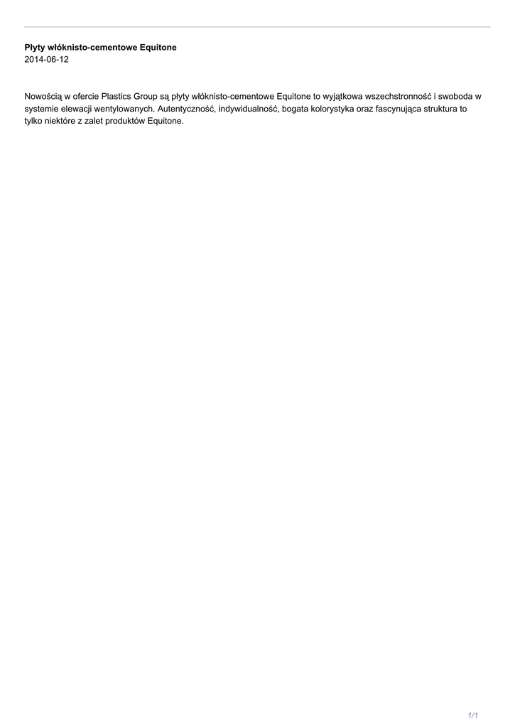 Płyty włóknisto-cementowe Equitone 2014-06-12 Nowością w ofercie Plastics Group są płyty włóknisto-cementowe Equitone to wyjątkowa wszechstronność i swoboda w systemie elewacji wentylowanych. Autentyczność, indywidualność, bogata kolorystyka oraz fascynująca struktura to tylko niektóre z zalet produktów Equitone. 1/1