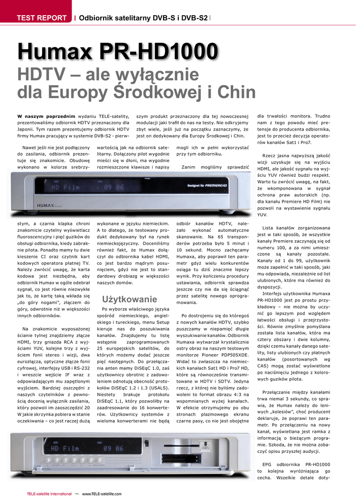 Odbiornik satelitarny DVB-S i DVB-S2 TEST REPORT Humax PR-HD1000 HDTV – ale wyłącznie dla Europy Środkowej i Chin W naszym poprzednim wydaniu TELE-satelity, szym produkt przeznaczony dla tej nowoczesnej dla trwałości monitora. Trudno prezentowaliśmy odbiornik HDTV przeznaczony dla modulacji jaki trafił do nas na testy. Nie odkryjemy nam z tego powodu mieć pre- Japonii. Tym razem prezentujemy odbiornik HDTV zbyt wiele, jeśli już na początku zaznaczymy, że tensje do producenta odbiornika, firmy Humax pracujący w systemie DVB-S2 - pierw- jest on dedykowany dla Europy Środkowej i Chin. jest to przecież decyzja operatorów kanałów Sat1 i Pro7. Nawet jeśli nie jest podłączony wartością jak na odbiornik sate- mogli ich w pełni wykorzystać do zasilania, odbiornik prezen- litarny. Dołączony pilot wygodnie przy tym odbiorniku. tuje się znakomicie. Obudowę mieści się w dłoni, ma wygodnie wykonano rozmieszczone klawisze i napisy w kolorze srebrzy- Rzecz jasna najwyższą jakość wizji uzyskuje się na wyjściu Zanim mogliśmy sprawdzić HDMI, ale jakość sygnału na wyjściu YUV również budzi respekt. Warto tu zwrócić uwagę, na fakt, że wkomponowana ochrona praw w sygnał autorskich (np. dla kanału Premiere HD Film) nie pozwoli na wystawienie sygnału YUV. stym, a czarna klapka chroni wykonane w języku niemieckim. odbiór znakomicie czytelny wyświetlacz A to dlatego, że testowany pro- żało fluoroscencyjny i pięć guzików do dukt dedykowany był na rynek skanowanie. obsługi odbiornika, kiedy zabrak- niemieckojęzyczny. Doceniliśmy derów potrzeba było 5 minut i nie pilota. Ponadto mamy tu dwie również fakt, że Humax dołą- 10 sekund. Mocno zachęcamy kieszenie CI oraz czytnik kart czył do odbiornika kabel HDMI, Humaxa, aby poprawił ten para- kodowych operatora płatnej TV. co jest bardzo mądrym posu- metr gdyż wielu konkurentów Należy zwrócić uwagę, że karta nięciem, gdyż nie jest to stan- osiąga tu dziś znacznie lepszy kodowa dardowy drobiazg w większości wynik. Przy kończeniu procedury naszych domów. ustawiania, odbiornik sprawdza jest niezbędna, aby odbiornik Humax w ogóle odebrał sygnał, co jest równie niezwykłe „do góry nogami”, złączem do góry, odwrotnie niż w większości Po wyborze właściwego języka innych odbiorników. Na znakomicie spośród wyposażonej Na HDTV, nale- automatyczne 65 transpon- jeszcze czy nie da się ściągnąć Użytkowanie jak to, że kartę taką wkłada się kanałów wykonać niemieckiego, przez satelitę nowego oprogramowania. Po dostrojeniu się do któregoś skiego i tureckiego, menu Setup z nowych kanałów HDTV, szybko kieruje puszczamy w niepamięć długie do poszukiwania Znajdujemy ścianie tylnej znajdziemy złącze kanałów. HDMI, trzy gniazda RCA z wyj- wstępnie listę wyszukiwanie kanałów. Odbiornik zaprogramowanych Humaxa wytwarzał krystalicznie ściami YUV, kolejne trzy z wyj- 25 do ostry obraz na naszym testowym ściem fonii stereo i wizji, dwa których możemy dodać jeszcze monitorze Pioneer PDP505XDE. eurozłącza, optyczne złącze fonii pięć następnych. Do przełącza- Widać to zwłaszcza na niemiec- cyfrowej, interfejsy USB i RS-232 nia anten mamy DiSEqC 1.0, zaś kich kanałach Sat1 HD i Pro7 HD, i wreszcie wejście IF wraz z użytkownicy obrotnic z zadowo- które są równocześnie transmi- odpowiadającym mu zapętlonym leniem odnotują obecność proto- towane w HDTV i SDTV. Jedyna wyjściem. Bardziej oszczędni z kołów DiSEqC 1.2 i 1.3 (USALS). rzecz, z której nie byliśmy zado- naszych czytelników z pewno- Niestety protokołu woleni to format obrazu 4:3 na ścią docenią wyłącznik zasilania, DiSEqC 1.1, który pozwoliłby na wspomnianych wyżej kanałach. który pozwoli im zaoszczędzić 20 zaadresowanie do 16 konwerte- W efekcie otrzymujemy po obu W jakie skrzynka pobiera w stanie rów. Użytkownicy systemów z stronach oczekiwania – co jest raczej dużą wieloma konwerterami nie będą czarne pasy, co nie jest obojętne europejskich tu satelitów, brakuje kanały Premiere zaczynają się od numeru 100, a za nimi umieszczone są kanały pozostałe. Kanały od 1 do 99, użytkownik może zapełnić w taki sposób, jaki mu odpowiada, niezależnie od list ulubionych, które ma również do dyspozycji. Interfejs użytkownika Humaxa PR-HD1000 jest po prostu przykładowy – nie można by uczy- angiel- nas Lista kanałów zorganizowana jest w taki sposób, że wszystkie plazmowego ekranu nić go lepszym pod względem łatwości obsługi i przejrzystości. Równie zmyślnie pomyślana została lista kanałów, która ma cztery obszary i dwie kolumny, dzięki czemu kanały danego satelity, listy ulubionych czy płatnych kanałów (posortowanych wg CAS) mogą zostać wyświetlone po naciśnięciu jednego z kolorowych guzików pilota. Przełączanie między kanałami trwa niemal 3 sekundy, co sprawia, że Humax należy do leniwych „kolesiów”, choć producent deklaruje, że poprawi ten parametr. Po przełączeniu na nowy kanał, wyświetlana jest ramka z informacją o bieżącym programie. Szkoda, że nie można zobaczyć opisu przyszłej audycji. EPG to cecha. TELE-satellite International — www.TELE-satellite.com odbiornika kolejna PR-HD1000 wyróżniająca Wszelkie detale go doty- czące większości kanałów ładują do niższych przepływności, ale kanału SITV-HD transmitowany rzystuje modulację DVB-8PSK, z się szybko i wyświetlane są jako obraz znikał co chwilę. z Chinastara na 87.5°E (3,851 V którą aktualne oprogramowanie 13300). Ten kanał HDTV wyko- Humaxa nie jest kompatybilne. wykres albo dla kilku kanałów, albo dla jednego. W pierwszej W trybie DVB-S2 próbowaliśmy chwili odbiornik wyświetla prze- uchwycić kanały HDTV brytyj- gląd wszystkich dni, dla których skiego Sky Digital, ale odbiornik dostępne są dane, zaś po kliknięciu na wybranej dacie, pokazywany jest program. Dzięki temu mieliśmy z kanała