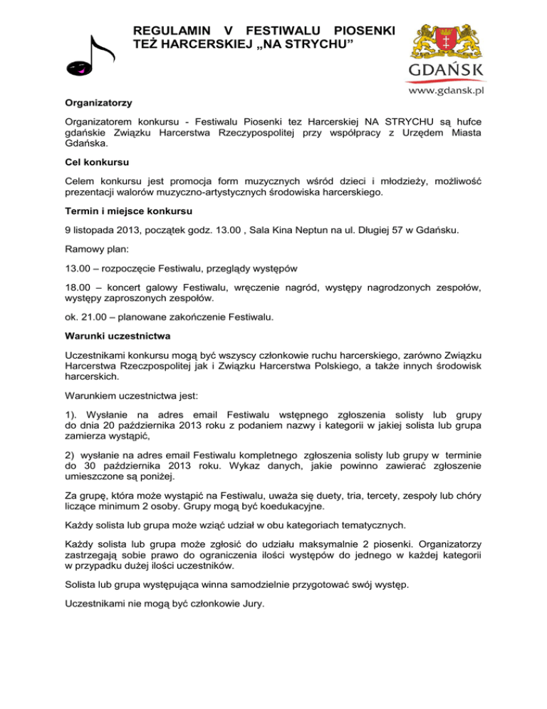 REGULAMIN V FESTIWALU PIOSENKI TEŻ HARCERSKIEJ „NA STRYCHU” Organizatorzy Organizatorem konkursu - Festiwalu Piosenki tez Harcerskiej NA STRYCHU są hufce gdańskie Związku Harcerstwa Rzeczypospolitej przy współpracy z Urzędem Miasta Gdańska. Cel konkursu Celem konkursu jest promocja form muzycznych wśród dzieci i młodzieży, możliwość prezentacji walorów muzyczno-artystycznych środowiska harcerskiego. Termin i miejsce konkursu 9 listopada 2013, początek godz. 13.00 , Sala Kina Neptun na ul. Długiej 57 w Gdańsku. Ramowy plan: 13.00 – rozpoczęcie Festiwalu, przeglądy występów 18.00 – koncert galowy Festiwalu, wręczenie nagród, występy nagrodzonych zespołów, występy zaproszonych zespołów. ok. 21.00 – planowane zakończenie Festiwalu. Warunki uczestnictwa Uczestnikami konkursu mogą być wszyscy członkowie ruchu harcerskiego, zarówno Związku Harcerstwa Rzeczpospolitej jak i Związku Harcerstwa Polskiego, a także innych środowisk harcerskich. Warunkiem uczestnictwa jest: 1). Wysłanie na adres email Festiwalu wstępnego zgłoszenia solisty lub grupy do dnia 20 października 2013 roku z podaniem nazwy i kategorii w jakiej solista lub grupa zamierza wystąpić, 2) wysłanie na adres email Festiwalu kompletnego zgłoszenia solisty lub grupy w terminie do 30 października 2013 roku. Wykaz danych, jakie powinno zawierać zgłoszenie umieszczone są poniżej. Za grupę, która może wystąpić na Festiwalu, uważa się duety, tria, tercety, zespoły lub chóry liczące minimum 2 osoby. Grupy mogą być koedukacyjne. Każdy solista lub grupa może wziąć udział w obu kategoriach tematycznych. Każdy solista lub grupa może zgłosić do udziału maksymalnie 2 piosenki. Organizatorzy zastrzegają sobie prawo do ograniczenia ilości występów do jednego w każdej kategorii w przypadku dużej ilości uczestników. Solista lub grupa występująca winna samodzielnie przygotować swój występ. Uczestnikami nie mogą być członkowie Jury. Kategorie tematyczne: I. Piosenka Filmowa Komentarz: tematem kategorii są wszystkie piosenki, które znamy z filmów lub zostały wykorzystane w filmie. II. Wolność Komentarz: wszystkie piosenki, których motywem przewodnim są nawiązania do szeroko rozumianej wolności. Zgłoszenia Zgłoszenie, zawierające: nazwę solisty lub grupy ilość uczestników tytuły piosenek numer telefonu i adres e-mail do osoby kontaktowej należy przesłać na adres [email protected] zgodnie z Warunkami uczestnictwa. Uwaga: w przypadku zgłoszenia do kategorii Piosenka Filmowa należy dodatkowo przygotować fragment(y) filmu, w którym piosenka została wykorzystana. Fragmenty zostaną wykorzystane podczas występu. W przypadku kategorii Wolność nie jest to wymagany, jednak wykonawcy mogą przekazać organizatorom przygotowany materiał, który będzie wykorzystany podczas występu. Kryteria oceny Jury, powołane przed Festiwalem, będzie oceniać występy grup pod względem: tekstu, interpretacji utworu kompozycji, aranżacji inscenizacji muzycznej estetyki, dopasowania ubioru do prezentacji utworu doboru repertuaru Wszelkie decyzje Jury są ostateczne i nieodwołalne. Nagrody Jury spośród uczestników Festiwalu przyzna wyróżnienia w każdej kategorii z podziałem na solistów i grupy oraz nagrodę Grand Prix dla najlepszego występu. Dodatkowe wyróżnienie przyzna publiczność festiwalu. Odczytanie werdyktu i rozdanie nagród nastąpi 9 listopada 2013 roku podczas koncertu galowego. Uwagi końcowe Organizator zapewnia sprzęt nagłaśniający. Kolejność występów w Festiwalu podana będzie najpóźniej przed rozpoczęciem konkursu. Próba mikrofonów odbywać się będzie bezpośrednio przed koncertem. Ostateczna interpretacja niniejszego regulaminu należy do organizatorów Festiwalu. Organizatorzy zastrzegają sobie możliwość zmiany regulaminu.