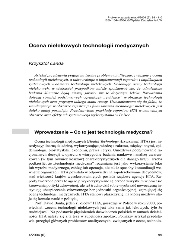 Problemy zarządzania, 4/2004 (6): 99 - 110 ISSN 1644-9584, © Wydział Zarządzania UW Ocena nielekowych technologii medycznych Krzysztof Łanda Artykuł przedstawia pogląd na istotne problemy analityczne, związane z oceną technologii nielekowych, a także traktuje o implementacji raportów i implikacjach systemowych w obszarze technologii nielekowych. Dokonując oceny technologii nielekowych, w większości przypadków należy spodziewać się, że odnalezione badania kliniczne będą niższej jakości niż te dotyczące leków. Rozważania dotyczą również podstawowych ograniczeń „evidence” w obszarze technologii nielekowych oraz przyczyn takiego stanu rzeczy. Ustosunkowano się do faktu, że standaryzacja w obszarze rejestracji i finansowania technologii nielekowych jest daleko mniej posunięta. Przedstawiono przykłady raportów HTA w omawianym obszarze oraz efekty ich systemowego wykorzystania w Polsce. Wprowadzenie – Co to jest technologia medyczna? Ocena technologii medycznych (Health Technology Assessment, HTA) jest interdyscyplinarną dziedziną, wykorzystującą wiedzę z zakresu, między innymi, epidemiologii, biostatystyki, ekonomii, prawa i etyki. Umożliwia podejmowanie racjonalnych decyzji w oparciu o wiarygodne badania naukowe i analizę uwarunkowań (w tym również kosztów) charakterystycznych dla danego kraju. Trzeba podkreślić, że „technologia medyczna” rozumiana jest jako wykorzystanie leku lub wyrobu medycznego, zabieg lub operacja, ale także sposoby komunikacji wewnątrz organizacji. HTA powstało w odpowiedzi na zapotrzebowanie decydentów, stąd większość krajów wysokorozwiniętych posiada rządowe agencje HTA. Raporty tworzone przez te agencje wykorzystywane są przede wszystkim w procesie kreowania polityki zdrowotnej, ale też trudno dziś sobie wyobrazić nowoczesną instytucję ubezpieczenia zdrowotnego bez jednostki organizacyjnej, zajmującej się oceną technologii medycznych. HTA stanowi płaszczyznę, na której możliwy staje się kontakt nauki z polityką. Prof. David Banta, jeden z „ojców” HTA, goszcząc w Polsce w roku 2000, powiedział: „ocena technologii nielekowych jest taka sama jak lekowych, tyle że trudniejsza”. Na podstawie pięcioletnich doświadczeń polskich w ramach działalności HTA należy się z tą tezą w zupełności zgodzić. Poniższy artykuł przedstawia przegląd głównych problemów analitycznych, związanych z oceną technolo- 4/2004 (6) 99