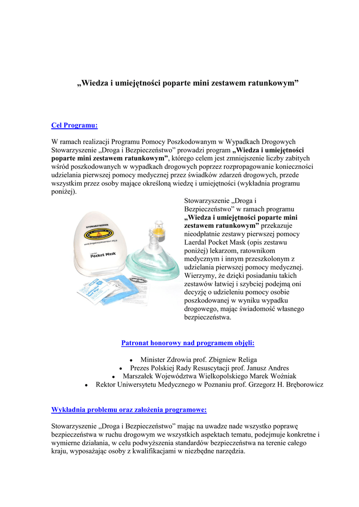 „Wiedza i umiejętności poparte mini zestawem ratunkowym” Cel Programu: W ramach realizacji Programu Pomocy Poszkodowanym w Wypadkach Drogowych Stowarzyszenie „Droga i Bezpieczeństwo” prowadzi program „Wiedza i umiejętności poparte mini zestawem ratunkowym”, którego celem jest zmniejszenie liczby zabitych wśród poszkodowanych w wypadkach drogowych poprzez rozpropagowanie konieczności udzielania pierwszej pomocy medycznej przez świadków zdarzeń drogowych, przede wszystkim przez osoby mające określoną wiedzę i umiejętności (wykładnia programu poniżej). Stowarzyszenie „Droga i Bezpieczeństwo” w ramach programu „Wiedza i umiejętności poparte mini zestawem ratunkowym” przekazuje nieodpłatnie zestawy pierwszej pomocy Laerdal Pocket Mask (opis zestawu poniżej) lekarzom, ratownikom medycznym i innym przeszkolonym z udzielania pierwszej pomocy medycznej. Wierzymy, że dzięki posiadaniu takich zestawów łatwiej i szybciej podejmą oni decyzję o udzieleniu pomocy osobie poszkodowanej w wyniku wypadku drogowego, mając świadomość własnego bezpieczeństwa. Patronat honorowy nad programem objęli: Minister Zdrowia prof. Zbigniew Religa Prezes Polskiej Rady Resuscytacji prof. Janusz Andres Marszałek Województwa Wielkopolskiego Marek Woźniak Rektor Uniwersytetu Medycznego w Poznaniu prof. Grzegorz H. Bręborowicz Wykładnia problemu oraz założenia programowe: Stowarzyszenie „Droga i Bezpieczeństwo” mając na uwadze nade wszystko poprawę bezpieczeństwa w ruchu drogowym we wszystkich aspektach tematu, podejmuje konkretne i wymierne działania, w celu podwyższenia standardów bezpieczeństwa na terenie całego kraju, wyposażając osoby z kwalifikacjami w niezbędne narzędzia. Zgodnie z naszym nadrzędnym celem jakim jest zmniejszanie zagrożenia życia i zdrowia w ruchu drogowym uważamy, że sprawny i efektywny system ratownictwa jest integralną częścią pojęcia bezpieczeństwa komunikacyjnego. Każdego roku ponad 5 tys. osób ginie na polskich drogach, a ok. 60 tys. zostaje rannych. Na 100 wypadków na polskich drogach ginie aż 11 osób, podczas gdy analogiczne wskaźniki w innych krajach Unii Europejskiej kształtują się na średnim poziomie ok. 3 zabitych / 100 wypadków drogowych. Nagłe zatrzymanie czynności krążeniowo – oddechowych, do których często dochodzi w wyniku wypadków drogowych wiąże się z wysoką śmiertelnością. Dlatego też do interwencji ratowniczych o najwyższym priorytecie (zgodnie ze standardami BTLS) należy przede wszystkim udrożnienie dróg oddechowych. Warunkiem przeżycia osoby, u której nastąpiło zatrzymanie oddechu jest szybkie wezwanie profesjonalnej pomocy oraz natychmiastowe podjęcie czynności resuscytacyjnych. Z dotychczasowych badań i obserwacji wynika, że po 3 minutach niedotlenienia następują nieodwracalne zmiany w całym organizmie, najszybciej obejmujące mózg. Po 10 minutach obumieranie jest procesem tak zaawansowanym, że przywrócenie prawidłowych czynności krążeniowo oddechowych i pełnej świadomości jest prawie niemożliwe. Przyjmuje się, że z każdą minutą zatrzymania krążenia człowiek traci kolejne 10% szans na ozdrowienie. Wykwalifikowana pomoc medyczna nie jest w stanie w większości przypadków w przeciągu tych pierwszych minut od zdarzenia dotrzeć na miejsce wypadku. Wykonanie podstawowych czynności resuscytacyjnych, czyli uciskanie klatki piersiowej oraz udrażnianie dróg oddechowych i prowadzenie oddechu zastępczego przez świadków zdarzenia dwukrotnie zwiększa szanse na skuteczną resuscytację do momentu przybycia specjalistycznego zespołu ratowniczego. Jak wskazują powyższe dane, bardzo często jedynym ratunkiem dla osób – ofiar wypadków drogowych, u których nastąpiło zatrzymanie czynności krążeniowo oddechowych jest udzielenie im pomocy przez świadków takiego zdarzenia. Ważne jednak, aby ratując życie czy zdrowie innych mieć pewność własnego bezpieczeństwa. Bezpieczeństwo ratownika, jak i poszkodowanego są najważniejsze w trakcie udzielania pomocy! Wentylacja metodą usta – usta bez odpowiedniego zabezpieczenia wiąże się z ryzykiem przeniesienia chorób zakaźnych takich jak: wirusowe zapalenie wątroby typu C, gruźlica, SARS, itp. Ryzyko zakażenia oraz niechęć do bezpośredniego kontaktu ze skórą i drogami oddechowymi obcego człowieka powodują, iż wiele osób - świadków wypadku drogowego nie podejmuje działań resuscytacyjnych. Ryzyko zakażenia można jednak znacznie zmniejszyć poprzez zastosowanie maski twarzowej z wysokiej jakości filtrem i zastawką jednokierunkową, zapobiegającą transmisji bakterii od poszkodowanego w trakcie wentylacji metodą usta – usta. Posiadając taki mini zestaw ratunkowy (w skład którego obok samej w/w maseczki resuscytacyjnej wchodzą rękawiczki ochronne i chusteczka dezynfekująca), osoby będące świadkiem wypadku drogowego łatwiej i szybciej podejmą decyzję o udzieleniu pierwszej pomocy medycznej poszkodowanym, niejednokrotnie ratując im zdrowie, a nawet życie. Dlatego też, taki zestaw pierwszej pomocy powinien, zdaniem naszego Stowarzyszenia, być niezbędnym elementem wyposażenia każdego samochodu osoby mającej stosowną wiedzę i umiejętności w posługiwaniu się nim. Szczególnie ważne jest, aby to właśnie osoby przeszkolone w zakresie udzielania pomocy medycznej (lekarze, ratownicy medyczni, przeszkoleni w zakresie ratownictwa medycznego studenci Akademii Medycznych, itp.) będąc świadkiem zdarzenia drogowego udzielili nieocenionej pomocy tym, którzy jej potrzebują. Trud i zaangażowanie służb medycznego ratownictwa drogowego jest nieocenionym skarbem zarówno dla każdego użytkownika drogi indywidualnie, jak i z punktu ogólnospołecznego patrząc. Ważne jednak, aby wiedza, umiejętności, doświadczenie tychże osób mogły służyć dla dobra drugiego człowieka także poza godzinami ich pracy czy służby (wzmocnieni