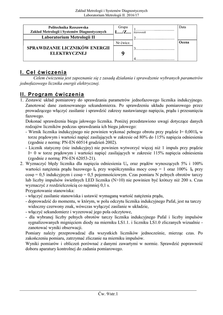 Zakład Metrologii i Systemów Diagnostycznych Laboratorium Metrologii II. 2016/17 Politechnika Rzeszowska Zakład Metrologii i Systemów Diagnostycznych Laboratorium Metrologii II SPRAWDZANIE LICZNIKÓW ENERGII ELEKTRYCZNEJ Grupa L..../Z.... Nr ćwicz. 9 1……………..................... kierownik 2......................................... 3......................................... Data Ocena 4......................................... I . Cel ćw icz eni a Celem ćwiczenia jest zapoznanie się z zasadą działania i sprawdzenie wybranych parametrów jednofazowego licznika energii elektrycznej. I I. Pr ogr am ćw iczeni a 1. Zestawić układ pomiarowy do sprawdzania parametrów jednofazowego licznika indukcyjnego. Zanotować dane zastosowanego sekundomierza. Po sprawdzeniu układu pomiarowego przez prowadzącego włączyć zasilanie i sprawdzić zakresy nastawianego napięcia, prądu i przesunięcia fazowego. Dokonać sprawdzenia biegu jałowego licznika. Poniżej przedstawiono uwagi dotyczące danych rodzajów liczników podczas sprawdzania ich biegu jałowego: - Wirnik licznika indukcyjnego nie powinien wykonać pełnego obrotu przy prądzie I= 0,001Ib w torze prądowym i wartości napięć zasilających w zakresie od 80% do 115% napięcia odniesienia (zgodnie z normą: PN-EN 60514 grudzień 2002). - Licznik statyczny (nie indukcyjny) nie powinien wytworzyć więcej niż 1 impuls przy prądzie I= 0 w torze prądowym i wartości napięć zasilających w zakresie 115% napięcia odniesienia (zgodnie z normą: PN-EN 62053-21). 2. Wyznaczyć błędy licznika dla napięcia odniesienia Un oraz prądów wynoszących 5% i 100% wartości natężenia prądu bazowego Ib przy współczynniku mocy cos = 1 oraz 100% Ib przy cos = 0,5 indukcyjnym i cos = 0,5 pojemnościowym. Czas pomiaru N pełnych obrotów tarczy lub liczby impulsów świetlnych LED licznika (N>10) nie powinien być krótszy niż 200 s. Czas wyznaczyć z rozdzielczością co najmniej 0,1 s. Przygotowanie stanowiska: - włączyć zasilanie stanowiska i ustawić wymaganą wartość natężenia prądu, - doprowadzić do momentu, w którym, w polu odczytu licznika indukcyjnego Pafal, jest na tarczy widoczny czerwony znak, wówczas wyłączyć zasilanie w układzie, - włączyć sekundomierz i wyzerować jego pola odczytowe, - dla wybranej liczby pełnych obrotów tarczy licznika indukcyjnego Pafal i liczby impulsów sygnalizowanych mignięciem diody na mierniku LS1.1. i liczniku LS1.0 zliczanych wizualnie zanotować wyniki obserwacji. Pomiary należy przeprowadzać dla wszystkich liczników jednocześnie, mierząc czas. Po zakończeniu pomiaru, zatrzymać zliczanie na mierniku impulsów. Wyniki pomiarów i obliczeń porównać z danymi zawartymi w normie. Sprawdzić poprawność doboru aparatury kontrolnej do zadania pomiarowego. Ćw. 9/str.1 Zakład Metrologii i Systemów Diagnostycznych Laboratorium Metrologii II. 2016/17 TABLICA 1. Wartości prądu rozruchu dla różnych klas licznika Rodzaj Klasa dokładności Indukcyjny 2 Statyczny Wartość natężenia prądu zasilającego w procentach natężenia prądu bazowego Ib Wartość współczynnika mocy 0,5% 1 0,6% 2 1 TABLICA 2. Dopuszczalny błąd aparatury pomiarowej IEC 60736 i granice błędów dla różnych klas licznika indukcyjnego norma PN-EN 60514 grudzień 2002 i statycznego PN-EN 62053-21 Prąd zasilający Wsp. Mocy 0,05 Ib od 0,1 Ib do Imax od 0,2 Ib do Imax Całkowita niepewność pomiaru aparatury kontrolnej ucr 1 ± 0,4% 0,5 ind ±0,6% Granice błędu procentowego dla liczników klasy dokładności 2 indukcyjny Statyczny 2,5 2,0 3,5 ±0,4% 1 P r ą d m a k s ym a l n y I m a x = 1 , 2 5 · I b 3,0 2,5 2,5 III. Przebieg ćwiczenia 1. Protokół sprawdzania licznika energii elektrycznej. 1.1 Spis przyrządów. Licznik statyczny LS1.1: typ: licznik elektroniczny klasa: 1 Licznik statyczny LS1.0 - 2 : typ: licznik elektroniczny klasa: 1 rok produkcji: napięcie pracy: stała znamionowa: C n imp kWh 3200imp kWh Częstotliwość: rok produkcji: napięcie pracy: stała znamionowa C n imp kWh 3200imp kWh Częstotliwość rok produkcji: napięcie pracy: prąd bazowy Ib stała znamionowa Częstotliwość średnica tarczy 2006 2006 Licznik indukcyjny PRLT 3195: typ: licznik indukcyjny klasa: 1 1961 C n obr kWh 1200obr kWh Ćw. 9/str.2 230 [V] Prąd bazowy Ib: 5(60) [A] 50 [Hz] 230 [V] Prąd bazowy Ib 5(60) [A] 50 [Hz] 230 [V] 50 [Hz] 5(10) [A] 80 mm Zakład Metrologii i Systemów Diagnostycznych Laboratorium Metrologii II. 2016/17 analizator parametrów sieci APS N12: producent: typ: LUMEL analizator elektroniczny zakresy mocy P: P=(0-120%)Pn, Pn =19999 [W] ±(0,1%ww+0,5%wm) znamionowa liczba ziaren Nn: 1 zakresy nap. U: zakresy prądowe I: błąd podstawowy: błąd podstawowy: U=(0-120)%Un, Un=400,0 [V] błąd podstawowy: 99999 I=(0-120)%In, In=5,000 [A]: ±(0,1%ww+0,2%wm) ±(0,1%ww+0,2%wm) zakres pomiaru błąd podstawowy Nn: pasmo częstotliwości: 4-400,0 [V] ±(0,1%ww+0,2%wm) 3999 [z] 40..50..440 [Hz] błąd podstawowy Nn: pasmo częstotliwości: ±(0,1%ww+0,2%wm) 4999 [z] 40..50..440 [Hz] V woltomierz z APS N12: Typ znamion. wsp. mocy: napięcia U: U=(0-120)%Un, Un=400[V]: A amperomierz z APS N12: Typ zakres pomiaru prądu I I=(0-120)%In, In=5,000[A]: 0,5-5,000[A] sekundomierz cyfrowy: Typ Rozdzielczość Dokładność błąd czasu reakcji 1.1.2 Układ pomiarowy RS 485/ USB RS 485 Przesuwnik fazy U R 0 APS N12 1 2 3 4 1 3 4 6 LS 1.1 1 3 4 LS 1.0-2 6 1 3 4 6 PRLT 3195 1 3 4 6 ATR Tr 220/24V Robc 3,6 Ćw. 9/str.3 Zakład Metrologii i Systemów Diagnostycznych Laboratorium Metrologii II. 2016/17 1.2 Sprawdzenie biegu jałowego licznika. Napięcie zasilające w procentach napięcia odniesienia Un Natężen LS1.1 LS1.0-2 PRLT 3195 ie prądu Sygnalizator Sygnalizator Wirnik zaświecił się zaświecił się wykonał (Tak/Ni e) (Tak/Nie) (Tak/Nie) pełny obrót? (Tak/Nie) U [V] 80% 0 90% 100% 230 115% 1.3 cos 1. 1 3. 0,5i 2. 4. 0 0 Wyznaczanie stałej rzeczywistej i błędów licz