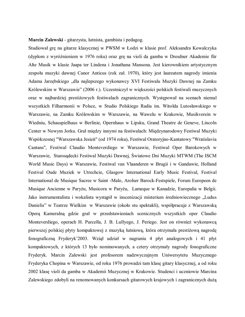 Marcin Zalewski - gitarzysta, lutnista, gambista i pedagog. Studiował grę na gitarze klasycznej w PWSM w Łodzi w klasie prof. Aleksandra Kowalczyka (dyplom z wyróżnieniem w 1976 roku) oraz grę na violi da gamba w Dresdner Akademie für Alte Musik w klasie Jaapa ter Lindena i Jonathana Mansona. Jest kierownikiem artystycznym zespołu muzyki dawnej Canor Anticus (rok zał. 1970), który jest laureatem nagrody imienia Adama Jarzębskiego „dla najlepszego wykonawcy XVI Festiwalu Muzyki Dawnej na Zamku Królewskim w Warszawie” (2006 r.). Uczestniczył w większości polskich festiwali muzycznych oraz w najbardziej prestiżowych festiwalach zagranicznych. Występował na scenach niemal wszystkich Filharmonii w Polsce, w Studio Polskiego Radia im. Witolda Lutosławskiego w Warszawie, na Zamku Królewskim w Warszawie, na Wawelu w Krakowie, Musikverein w Wiedniu, Schauspielhaus w Berlinie, Opernhaus w Lipsku, Grand Theatre de Geneve, Lincoln Center w Nowym Jorku. Grał między innymi na festiwalach: Międzynarodowy Festiwal Muzyki Współczesnej "Warszawska Jesień" (od 1974 roku), Festiwal Oratoryjno-Kantatowy "Wratislavia Cantans", Festiwal Claudio Monteverdiego w Warszawie, Festiwal Oper Barokowych w Warszawie, Starosądecki Festiwal Muzyki Dawnej, Światowe Dni Muzyki MTWM (The ISCM World Music Days) w Warszawie, Festiwal van Vlaanderen w Brugii i w Gandawie, Holland Festival Oude Muziek w Utrechcie, Glasgow International Early Music Festival, Festival International de Musique Sacree w Saint -Malo, Arolser Barock-Festspiele, Forum Europeen de Musique Ancienne w Paryżu, Musicora w Paryżu, Lameque w Kanadzie, Europalia w Belgii. Jako instrumentalista i wokalista wystąpił w inscenizacji misterium średniowiecznego „Ludus Danielis” w Teatrze Wielkim w Warszawie (około stu spektakli), współpracuje z Warszawską Operą Kameralną gdzie grał w przedstawieniach scenicznych wszystkich oper Claudio Monteverdiego, operach H. Purcella, J. B. Lullyego, J. Periego. Jest on również wykonawcą pierwszej polskiej płyty kompaktowej z muzyką lutniową, która otrzymała prestiżową nagrodę fonograficzną Fryderyk’2003. Wziął udział w nagraniu 4 płyt analogowych i 41 płyt kompaktowych, z których 13 było nominowanych, a cztery otrzymały nagrody fonograficzne Fryderyk. Marcin Zalewski jest profesorem nadzwyczajnym Uniwersytetu Muzycznego Fryderyka Chopina w Warszawie, od roku 1976 prowadzi tam klasę gitary klasycznej, a od roku 2002 klasę violi da gamba w Akademii Muzycznej w Krakowie. Studenci i uczniowie Marcina Zalewskiego zdobyli na renomowanych konkursach gitarowych krajowych i zagranicznych dużą ilość najwyższych nagród oraz wyróżnienia. Marcin Zalewski zapraszany jest do wygłaszania wykładów oraz prowadzenia lekcji mistrzowskich na sympozjach naukowych, festiwalach, kursach, w wyższych uczelniach oraz szkołach muzycznych, był jurorem wielu konkursów gitarowych.