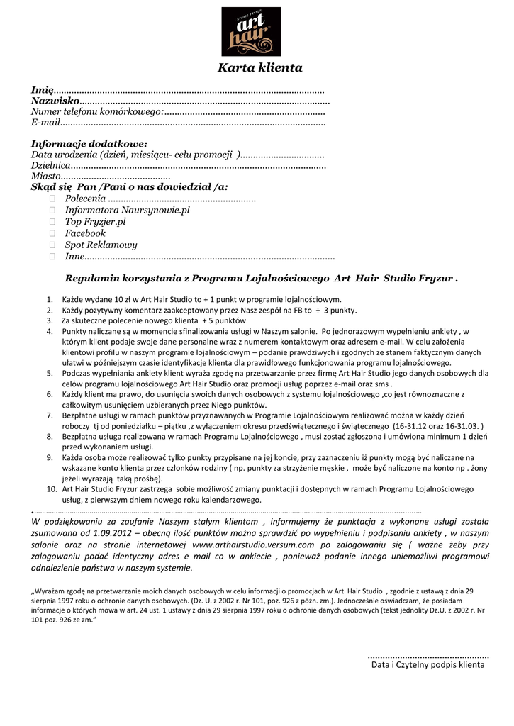 Karta klienta Imię.......................................................................................................... Nazwisko.................................................................................................. Numer telefonu komórkowego:............................................................... E-mail........................................................................................................ Informacje dodatkowe: Data urodzenia (dzień, miesiącu- celu promocji )................................. Dzielnica.................................................................................................... Miasto........................................... Skąd się Pan /Pani o nas dowiedział /a: Polecenia …………………………………………………. Informatora Naursynowie.pl Top Fryzjer.pl Facebook Spot Reklamowy Inne.................................................................................................. Regulamin korzystania z Programu Lojalnościowego Art Hair Studio Fryzur . 1. Każde wydane 10 zł w Art Hair Studio to + 1 punkt w programie lojalnościowym. 2. Każdy pozytywny komentarz zaakceptowany przez Nasz zespół na FB to + 3 punkty. 3. Za skuteczne polecenie nowego klienta + 5 punktów 4. Punkty naliczane są w momencie sfinalizowania usługi w Naszym salonie. Po jednorazowym wypełnieniu ankiety , w którym klient podaje swoje dane personalne wraz z numerem kontaktowym oraz adresem e-mail. W celu założenia klientowi profilu w naszym programie lojalnościowym – podanie prawdziwych i zgodnych ze stanem faktycznym danych ułatwi w późniejszym czasie identyfikacje klienta dla prawidłowego funkcjonowania programu lojalnościowego. 5. Podczas wypełniania ankiety klient wyraża zgodę na przetwarzanie przez firmę Art Hair Studio jego danych osobowych dla celów programu lojalnościowego Art Hair Studio oraz promocji usług poprzez e-mail oraz sms . 6. Każdy klient ma prawo, do usunięcia swoich danych osobowych z systemu lojalnościowego ,co jest równoznaczne z całkowitym usunięciem uzbieranych przez Niego punktów. 7. Bezpłatne usługi w ramach punktów przyznawanych w Programie Lojalnościowym realizować można w każdy dzień roboczy tj od poniedziałku – piątku ,z wyłączeniem okresu przedświątecznego i świątecznego (16-31.12 oraz 16-31.03. ) 8. Bezpłatna usługa realizowana w ramach Programu Lojalnościowego , musi zostać zgłoszona i umówiona minimum 1 dzień przed wykonaniem usługi. 9. Każda osoba może realizować tylko punkty przypisane na jej koncie, przy zaznaczeniu iż punkty mogą być naliczane na wskazane konto klienta przez członków rodziny ( np. punkty za strzyżenie męskie , może być naliczone na konto np . żony jeżeli wyrażają taką prośbę). 10. Art Hair Studio Fryzur zastrzega sobie możliwość zmiany punktacji i dostępnych w ramach Programu Lojalnościowego usług, z pierwszym dniem nowego roku kalendarzowego. .……………………………………………………………………………………………………………………………………………………………..............… W podziękowaniu za zaufanie Naszym stałym klientom , informujemy że punktacja z wykonane usługi została zsumowana od 1.09.2012 – obecną ilość punktów można sprawdzić po wypełnieniu i podpisaniu ankiety , w naszym salonie oraz na stronie internetowej www.arthairstudio.versum.com po zalogowaniu się ( ważne żeby przy zalogowaniu podać identyczny adres e mail co w ankiecie , ponieważ podanie innego uniemożliwi programowi odnalezienie państwa w naszym systemie. „Wyrażam zgodę na przetwarzanie moich danych osobowych w celu informacji o promocjach w Art Hair Studio , zgodnie z ustawą z dnia 29 sierpnia 1997 roku o ochronie danych osobowych. (Dz. U. z 2002 r. Nr 101, poz. 926 z późn. zm.). Jednocześnie oświadczam, że posiadam informacje o których mowa w art. 24 ust. 1 ustawy z dnia 29 sierpnia 1997 roku o ochronie danych osobowych (tekst jednolity Dz.U. z 2002 r. Nr 101 poz. 926 ze zm.” Data i Czytelny podpis klienta