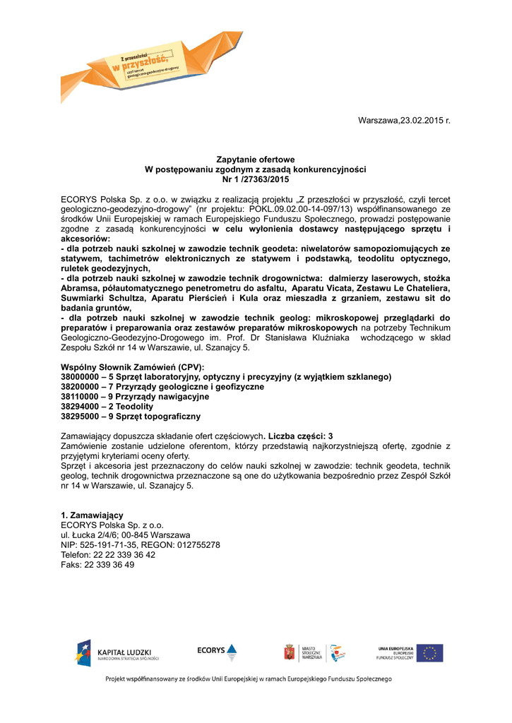 Warszawa,23.02.2015 r. Zapytanie ofertowe W postępowaniu zgodnym z zasadą konkurencyjności Nr 1 /27363/2015 ECORYS Polska Sp. z o.o. w związku z realizacją projektu „Z przeszłości w przyszłość, czyli tercet geologiczno-geodezyjno-drogowy” (nr projektu: POKL.09.02.00-14-097/13) współfinansowanego ze środków Unii Europejskiej w ramach Europejskiego Funduszu Społecznego, prowadzi postępowanie zgodne z zasadą konkurencyjności w celu wyłonienia dostawcy następującego sprzętu i akcesoriów: - dla potrzeb nauki szkolnej w zawodzie technik geodeta: niwelatorów samopoziomujących ze statywem, tachimetrów elektronicznych ze statywem i podstawką, teodolitu optycznego, ruletek geodezyjnych, - dla potrzeb nauki szkolnej w zawodzie technik drogownictwa: dalmierzy laserowych, stożka Abramsa, półautomatycznego penetrometru do asfaltu, Aparatu Vicata, Zestawu Le Chateliera, Suwmiarki Schultza, Aparatu Pierścień i Kula oraz mieszadła z grzaniem, zestawu sit do badania gruntów, - dla potrzeb nauki szkolnej w zawodzie technik geolog: mikroskopowej przeglądarki do preparatów i preparowania oraz zestawów preparatów mikroskopowych na potrzeby Technikum Geologiczno-Geodezyjno-Drogowego im. Prof. Dr Stanisława Kluźniaka wchodzącego w skład Zespołu Szkół nr 14 w Warszawie, ul. Szanajcy 5. Wspólny Słownik Zamówień (CPV): 38000000 – 5 Sprzęt laboratoryjny, optyczny i precyzyjny (z wyjątkiem szklanego) 38200000 – 7 Przyrządy geologiczne i geofizyczne 38110000 – 9 Przyrządy nawigacyjne 38294000 – 2 Teodolity 38295000 – 9 Sprzęt topograficzny Zamawiający dopuszcza składanie ofert częściowych. Liczba części: 3 Zamówienie zostanie udzielone oferentom, którzy przedstawią najkorzystniejszą ofertę, zgodnie z przyjętymi kryteriami oceny oferty. Sprzęt i akcesoria jest przeznaczony do celów nauki szkolnej w zawodzie: technik geodeta, technik geolog, technik drogownictwa przeznaczone są one do użytkowania bezpośrednio przez Zespół Szkół nr 14 w Warszawie, ul. Szanajcy 5. 1. Zamawiający ECORYS Polska Sp. z o.o. ul. Łucka 2/4/6; 00-845 Warszawa NIP: 525-191-71-35, REGON: 012755278 Telefon: 22 22 339 36 42 Faks: 22 339 36 49 2. Opis przedmiotu zamówienia: Miejscem odbioru zamówienia od Wykonawców będzie szkoła objęta projektem - Zespół Szkół nr 14 w Warszawie, ul. Szanajcy 5. Zamówienie obejmuje skompletowanie sprzętu i akcesoriów, oznakowanie każdego z urządzeń oraz serwis gwarancyjny. Zamówiony sprzęt i akcesoria powinny spełniać następujące parametry : CZĘŚĆ 1: NIWELATOR SAMOPOZIO MUJĄCY ze statywem Ilość sztuk Specyfikacja techniczna 10 • Niwelator optyczny (samopoziomujący) o parametrach nie gorszych niż: - powiększenie lunety co najmniej 28x - dokładność pomiaru co najmniej +/- 1,5mm/km podwójnej niwelacji, - kompensator magnetyczny o zakresie działania co najmniej +/- 15’ - opis koła poziomego 400g (gradowym) - norma pyło- i wodo- szczelności co najmniej IP66 (lub odpowiednio IPX6) - temperatura pracy od -20oC do +50oC - instrukcja obsługi - pudło transportowe - osłona przeciwsłoneczna obiektywu - zestaw narzędzi do rektyfikacji - pion sznurkowy - świadectwo jakości instrumentu poświadczające poprawność pracy instrumentu, wydane przez autoryzowany serwis - okres gwarancji niwelatora co najmniej 24 miesiące • Statyw do niwelatora o parametrach nie gorszych niż: statyw aluminiowy, lekki z płaską małą głowicą, na zaciski mimośrodowe, ze standardową śrubą sprzęgającą (5/8"), z paskiem do przenoszenia statywu na ramieniu, odporny na działanie czynników atmosferycznych i wody Gwarancja Dostawa • Łata niwelacyjna o parametrach nie gorszych niż: łata teleskopowa, aluminiowa z opisem typu „E”, z początkiem podziału (zerem łaty) pokrywającym się z powierzchnią stopy łaty, ze zintegrowaną libellą pudełkową o długości co najmniej 4,00m, zabezpieczona przed ścieraniem, odporna na działanie czynników atmosferycznych i wody - pokrowiec ochronny Gwarancja Wykonawcy – 24 miesiące, obejmuje odbiór wadliwego sprzętu i dostarczenie sprawnego urządzenia po naprawie/wymianie na własny koszt (po uznaniu roszczeń gwarancyjnych użytkownika) Dostawa musi być zrealizowana w ciągu 7 dni kalendarzowych od daty podpisania umowy. Urządzenia uszkodzone w transporcie lub posiadające wady fabryczne, Wykonawca odbiera na własny koszt, a następnie bez pobierania dodatkowych opłat dostarcza pozbawione wad urządzenia, w terminie nie dłuższym niż 7 dni roboczych od zgłoszenia nieprawidłowości przez Zamawiającego TACHIMETR ELEKTORNI CZNY ze statywem Ilość sztuk Specyfikacja techniczna 3 • Tachimetr elektroniczny (bezlustrowy) o parametrach nie gorszych niż: - powiększenie lunety co najmniej 30x - dokładność pomiaru kątów co najmniej 5” - pomiar odległości bezlustrowy o zasięgu co najmniej 350m - pomiar odległości lustrowy (na 1 pryzmat) o zasięgu co najmniej 3500m - dokładność pomiaru odległości bezlustrowego co najmniej +/– (3mm+2ppm) - dokładność pomiaru odległości lustrowego (na 1 pryzmat) co najmniej +/– (2mm+2ppm) - kompensator co najmniej dwuosiowy o zakresie działania co najmniej +/- 3,5’ - norma pyło- i wodo- szczelności co najmniej IP65 - temperatura pracy od -20oC do +50oC - dwustronny wyświetlacz - wbudowane podświetlenie wyświetlacza - menu oraz oprogramowanie wewnętrzne tachimetru - instrukcja obsługi - wbudowana pamięć wewnętrzna na co najmniej 10000 punktów - porty komunikacyjne RS-232/USB - możliwość wyzwalania pomiaru zdalnie z dodatkowego kontrolera, (wbudowany Bluetooth) - pudło transportowe - osłona przeciwsłoneczna obiektywu - zestaw narzędzi do rektyfikacji - pion laserowy lub optyczny - dwie baterie litowo-jonowe wystarczające na co najmniej 8 godz. ciągłej pracy tachimetru oraz ładowarka sieciowa - kabel transmisyjny - świadectwo jakości instrumentu poświadczające popra