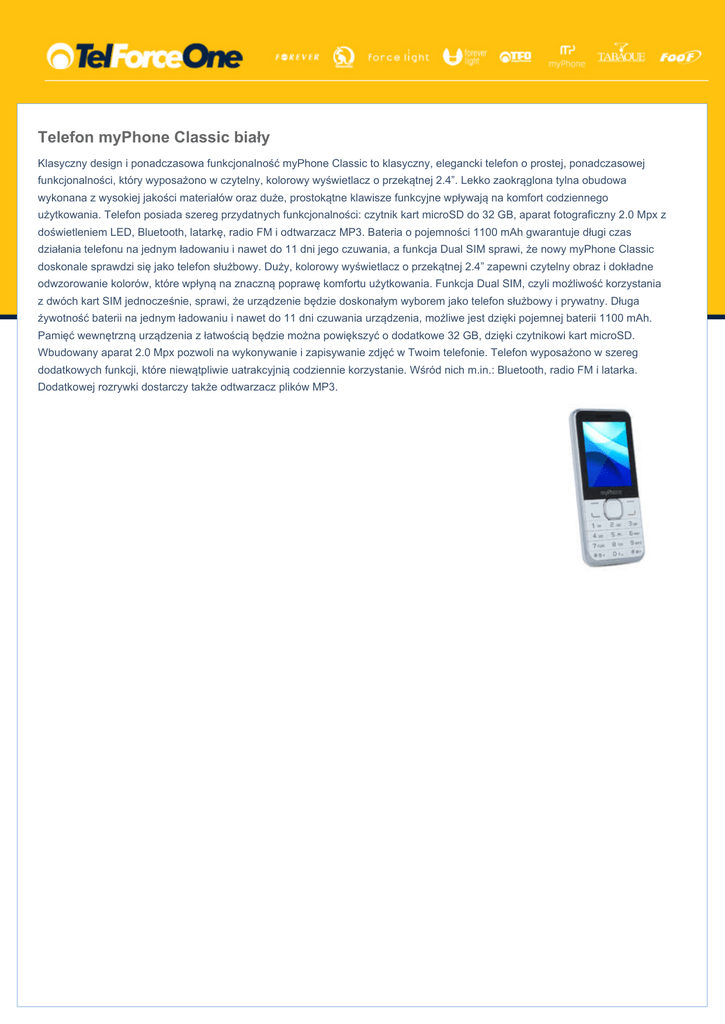 Telefon myPhone Classic biały Klasyczny design i ponadczasowa funkcjonalność myPhone Classic to klasyczny, elegancki telefon o prostej, ponadczasowej funkcjonalności, który wyposażono w czytelny, kolorowy wyświetlacz o przekątnej 2.4”. Lekko zaokrąglona tylna obudowa wykonana z wysokiej jakości materiałów oraz duże, prostokątne klawisze funkcyjne wpływają na komfort codziennego użytkowania. Telefon posiada szereg przydatnych funkcjonalności: czytnik kart microSD do 32 GB, aparat fotograficzny 2.0 Mpx z doświetleniem LED, Bluetooth, latarkę, radio FM i odtwarzacz MP3. Bateria o pojemności 1100 mAh gwarantuje długi czas działania telefonu na jednym ładowaniu i nawet do 11 dni jego czuwania, a funkcja Dual SIM sprawi, że nowy myPhone Classic doskonale sprawdzi się jako telefon służbowy. Duży, kolorowy wyświetlacz o przekątnej 2.4” zapewni czytelny obraz i dokładne odwzorowanie kolorów, które wpłyną na znaczną poprawę komfortu użytkowania. Funkcja Dual SIM, czyli możliwość korzystania z dwóch kart SIM jednocześnie, sprawi, że urządzenie będzie doskonałym wyborem jako telefon służbowy i prywatny. Długa żywotność baterii na jednym ładowaniu i nawet do 11 dni czuwania urządzenia, możliwe jest dzięki pojemnej baterii 1100 mAh. Pamięć wewnętrzną urządzenia z łatwością będzie można powiększyć o dodatkowe 32 GB, dzięki czytnikowi kart microSD. Wbudowany aparat 2.0 Mpx pozwoli na wykonywanie i zapisywanie zdjęć w Twoim telefonie. Telefon wyposażono w szereg dodatkowych funkcji, które niewątpliwie uatrakcyjnią codziennie korzystanie. Wśród nich m.in.: Bluetooth, radio FM i latarka. Dodatkowej rozrywki dostarczy także odtwarzacz plików MP3.