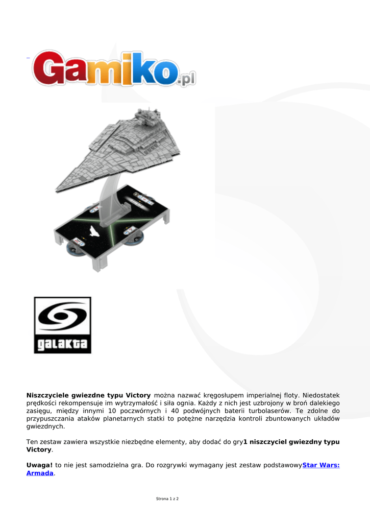 Niszczyciele gwiezdne typu Victory można nazwać kręgosłupem imperialnej floty. Niedostatek prędkości rekompensuje im wytrzymałość i siła ognia. Każdy z nich jest uzbrojony w broń dalekiego zasięgu, między innymi 10 poczwórnych i 40 podwójnych baterii turbolaserów. Te zdolne do przypuszczania ataków planetarnych statki to potężne narzędzia kontroli zbuntowanych układów gwiezdnych. Ten zestaw zawiera wszystkie niezbędne elementy, aby dodać do gry1 niszczyciel gwiezdny typu Victory. Uwaga! to nie jest samodzielna gra. Do rozgrywki wymagany jest zestaw podstawowyStar Wars: Armada. Strona 1 z 2 Zawartość pudełka: 1 plastikowy, pomalowany statek z podstawką i żebrem mocującym 3 wskaźniki rozkazów żeton statku 1 wskaźnik prędkości 2 karty statków 14 kart ulepszeń 15 różnych żetonów Wiek 14 + Liczba graczy 2 Czas gry ok. 120 minut Instrukcja polska Wydanie polskie Producent Galakta Strona 2 z 2
