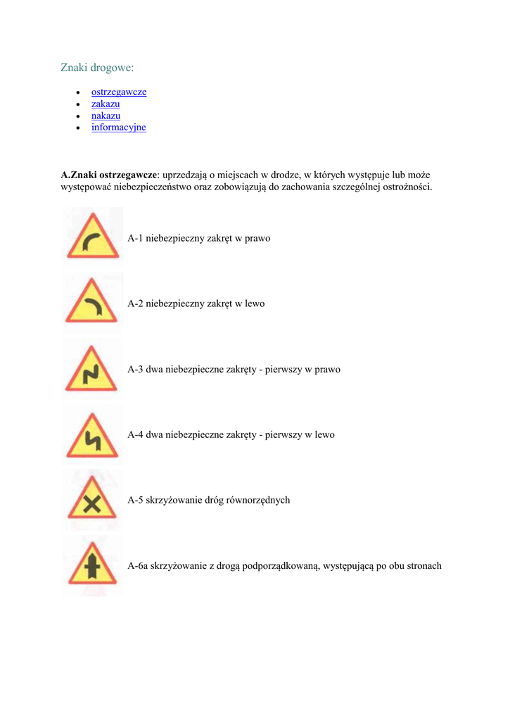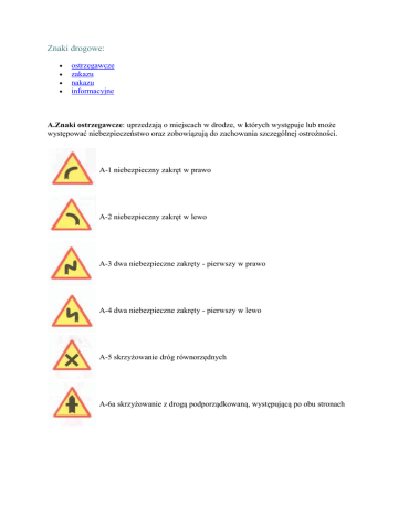 Znaki drogowe: ostrzegawcze zakazu nakazu informacyjne A.Znaki ostrzegawcze: uprzedzają o miejscach w drodze, w których występuje lub może występować niebezpieczeństwo oraz zobowiązują do zachowania szczególnej ostrożności. A-1 niebezpieczny zakręt w prawo A-2 niebezpieczny zakręt w lewo A-3 dwa niebezpieczne zakręty - pierwszy w prawo A-4 dwa niebezpieczne zakręty - pierwszy w lewo A-5 skrzyżowanie dróg równorzędnych A-6a skrzyżowanie z drogą podporządkowaną, występującą po obu stronach A-6b skrzyżowanie z drogą podporządkowaną, występującą po prawej stronie A-6c skrzyżowanie z drogą podporządkowaną, występującą po lewej stronie A-6d wlot drogi jednokierunkowej z prawej strony A-6e wlot drogi jednokierunkowej z lewej strony A-7 ustąp pierwszeńswa przejazdu A-8 skrzyżowanie o ruchu okrężnym A-9 przejazd kolejowy z zaporami A-10 przejazd kolejowy bez zapór 6-3 krzyż św. Andrzeja przed przejazdem jednotorowym 6-4 krzyż św. Andrzeja przed przejazdem wielotorowym A-11 nierówna droga A-12a zwężenie jezdni dwustronne A-12b zwężenie jezdni prawostronne A-12c zwężenie jezdni lewostronne A-14 roboty na drodze A-16 przejście dla pieszych A-17 dzieci - ostrzega o miejscu szczególnie uczęszczanym przez dzieci A-20 odcinek jezdni o ruchu dwukierunkowym - ostrzega jadących jezdnią jednokierunkową A-21 tramwaj - ostrzega o niebezpiecznym przejeździe przez tory tramwajowe sygnały świetlne - ostrzega o zbliżaniu się do miejsca, w którym ruch jest kierowany za pomocą sygnalizacji świetlnej B.Znaki zakazu: B-1 zakaz ruchu w obu kierunkach B-2 zakaz wjazdu B-9 zakaz wjazdu dla rowerów (dotyczy również motorowerów) B-10 zakaz wjazdu motorowerów B-41 zakaz ruchu pieszych B-20 stop - zakaz wjazdu na skrzyżowanie bez zatrzymania B-21 zakaz skrętu w lewo B-22 zakaz skrętu w prawo B-23 zakaz zawracania B-24 koniec zakazu zawracania B-31 pierwszeństwo dla nadjeżdżającym z przeciwka B-35 zakaz postoju (ponad jedną minutę) B-36 zakaz zatrzymania się B-37 zakaz postoju w dni nieparzyste B-38 zakaz postoju w dni parzyste B-42 koniec zakazów B-43 strefa ograniczonej prędkości C.Znaki nakazu: C-1 nakaz jazdy w prawo (skręcanie przed znakiem) C-2 nakaz skrętu w prawo (skręcanie za znakiem) C-3 nakaz jazdy w lewo (skręcanie przed znakiem) C-4 nakaz skretu w lewo (skręcanie za znakiem) C-5 nakaz jazdy prosto przez skrzyżowanie C-6 nakaz jazdy prosto lub w prawo C-7 nakaz jazdy prosto lub w lewo C-8 nakaz jazdy w prawo lub w lewo (skręcanie za znakiem) C-9 nakaz jazdy z prawej strony znaku C-10 nakaz jazdy z lewej strony znaku C-11 nakaz jazdy z prawej lub lewej strony znaku C-12 ruch okrężny C-13 droga dla rowerzystów C-14 prędkość minimalna C-16 droga dla pieszych D.Znaki informacyjne: D1 droga z pierwszeństwem D2 koniec drogi z pierwszeństwem D-3 droga jednokierunkowa D-4a droga bez przejazdu D-5 pierwszeństwo na zwężonym odcinku jezdni D-6 miejsce przejścia dla pieszych D-7 droga ekspresowa (na której jazda rowerem i motorowerem jest zabroniona) autostrada (jazda rowerem i motorowerem jest zabroniona) D-11 początek pasa ruchu dla autobusów (ruch innych pojazdów na tym pasie zabronion D-13 początek pasa ruchu powolnego D-14 koniec pasa ruchu powolnego D-15 przystanek autobusowy strefa zamieszkania (ograniczona prędkość do 20km/h) E-17 obszar zabudowany: obowiązuje zmniejszona prędkość, zakaz używania sygnałów do ruchu E-18 koniec obszaru zabudowanego H-2 tabliczka umieszczona pod znakiem, wskazuje długość odcinka drogi, na którym wy H-3 tabliczka mówi o ilości niebezpiecznych zakrętów H-15 informuje o przebiegu drogi z pierwszeństwem przejazdu