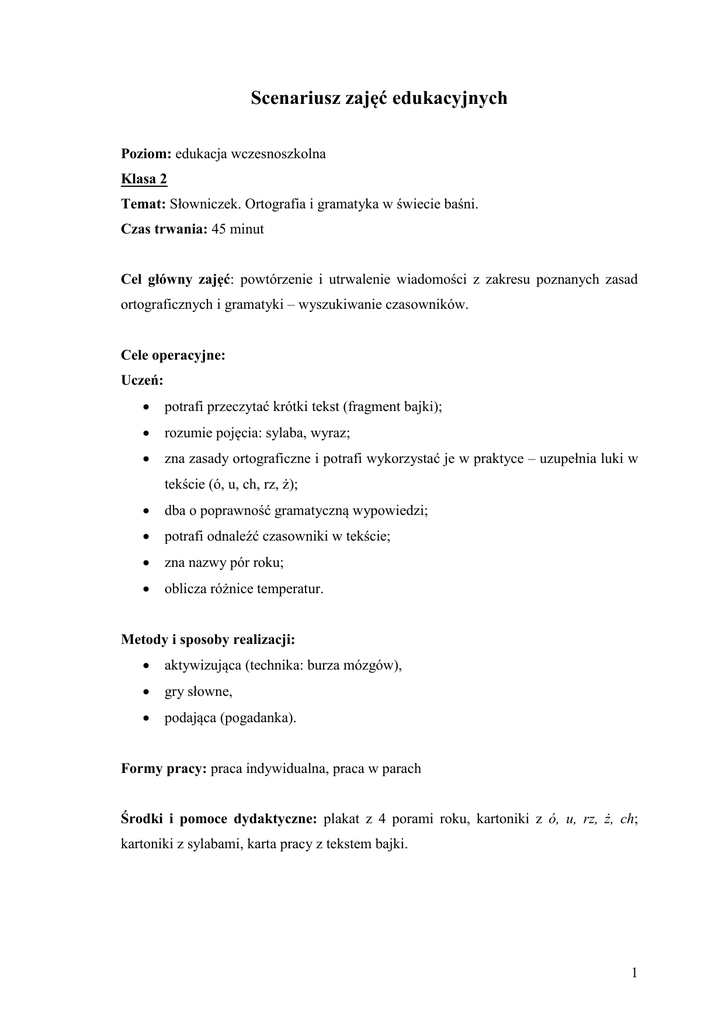 Scenariusz zajęć edukacyjnych Poziom: edukacja wczesnoszkolna Klasa 2 Temat: Słowniczek. Ortografia i gramatyka w świecie baśni. Czas trwania: 45 minut Cel główny zajęć: powtórzenie i utrwalenie wiadomości z zakresu poznanych zasad ortograficznych i gramatyki – wyszukiwanie czasowników. Cele operacyjne: Uczeń: potrafi przeczytać krótki tekst (fragment bajki); rozumie pojęcia: sylaba, wyraz; zna zasady ortograficzne i potrafi wykorzystać je w praktyce – uzupełnia luki w tekście (ó, u, ch, rz, ż); dba o poprawność gramatyczną wypowiedzi; potrafi odnaleźć czasowniki w tekście; zna nazwy pór roku; oblicza różnice temperatur. Metody i sposoby realizacji: aktywizująca (technika: burza mózgów), gry słowne, podająca (pogadanka). Formy pracy: praca indywidualna, praca w parach Środki i pomoce dydaktyczne: plakat z 4 porami roku, kartoniki z ó, u, rz, ż, ch; kartoniki z sylabami, karta pracy z tekstem bajki. 1 Temat: Słowniczek. Ortografia i gramatyka w świecie baśni. Przebieg zajęć 1. Powitanie uczniów. Przedstawienie celu lekcji, krótkie omówienie tematyki zajęć. 2. Rozgrzewka: burza mózgów – szukanie postaci z bajek, w których imionach występują trudności ortograficzne – pomagamy lalce Celinie stworzyć listę gości na przyjęcie urodzinowe. 3. Pomagamy Celinie napisać bajkę jako jedną z atrakcji przyjęcia urodzinowego – uzupełnianie wyrazów w tekście brakującymi trudnościami ortograficznymi. Uczniowie – korzystając z wiedzy na temat zasad ortografii – uzupełniają karty. W ramach sprawdzenia poprawności wykonanego ćwiczenia na forum klasy uczniowie korzystają z karteczek samoprzylepnych, na których znajdują się: ó, u, rz, ż, ch; przypomnienie zasad ortograficznych; podawanie własnych przykładów. 4. Skojarzenia ze słowem: czasownik. Odnajdywanie czasowników w bajce Celinki. 5. Przerwa śródlekcyjna: zabawa z sylabami. 6. Podróż Celinki przez magiczne krainy w celu rozdania zaproszeń na urodziny: odgadywanie zagadek i tworzenie własnych; nazywanie pór roku; tworzenie skojarzeń związanych z określoną porą roku, porządkowanie ich w kolejności alfabetycznej. 7. Zabawa: Co chcę dostać i co z tym zrobię? (zostanie przeprowadzona, jeśli zdążymy zrealizować założone cele) 8. Podsumowanie zajęć: dzielimy się pozytywnymi myślami: cieszę się, że umiem/ pamiętam/rozumiem…, następnym razem chciałbym więcej/ spróbuję lepiej… Załącznik (bajka) Dawno, dawno temu za górami, za lasami z przyjaznymi duchami i uroczymi wróżkami, mieszkał stary król i królowa. Uwielbiali oni zupę owocową, na deser zjadali mnóstwo krówek. Wrócili właśnie z dalekiej podróży… Autor: Agnieszka Sawicka 2 Literatura: Krzyżewska J., Aktywizujące metody i techniki w edukacji wczesnoszkolnej. Suwałki 1998r. Stasica J. Język polski. 160 pomysłów na nauczanie zintegrowane w klasach I – III, Kraków 2010r. 3