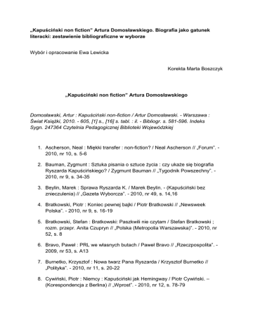 „Kapuściński non fiction” Artura Domosławskiego. Biografia jako gatunek literacki: zestawienie bibliograficzne w wyborze Wybór i opracowanie Ewa Lewicka Korekta Marta Boszczyk „Kapuściński non fiction” Artura Domosławskiego Domosławski, Artur : Kapuściński non-fiction / Artur Domosławski. - Warszawa : Świat Książki, 2010. - 605, [1] s., [16] s. tabl. : il. - Bibliogr. s. 581-596. Indeks Sygn. 247364 Czytelnia Pedagogicznej Biblioteki Wojewódzkiej 1. Ascherson, Neal : Miękki transfer : non-fiction? / Neal Ascherson // „Forum”. 2010, nr 10, s. 5-6 2. Bauman, Zygmunt : Sztuka pisania o sztuce życia : czy ukaże się biografia Ryszarda Kapuścińskiego? / Zygmunt Bauman // „Tygodnik Powszechny”. 2010, nr 9, s. 34-35 3. Beylin, Marek : Sprawa Ryszarda K. / Marek Beylin. - (Kapuściński bez znieczulenia) // „Gazeta Wyborcza”. - 2010, nr 49, s. 14,16 4. Bratkowski, Piotr : Koniec pewnej bajki / Piotr Bratkowski // „Newsweek Polska”. - 2010, nr 9, s. 16-19 5. Bratkowski, Stefan : Bratkowski: Paszkwili nie czytam / Stefan Bratkowski ; rozm. przepr. Anita Czupryn // „Polska (Metropolia Warszawska)”. - 2010, nr 52, s. 8 6. Bravo, Paweł : PRL we własnych butach / Paweł Bravo // „Rzeczpospolita”. 2009, nr 53, s. A13 7. Burnetko, Krzysztof : Nowa twarz Pana Ryszarda / Krzysztof Burnetko // „Polityka”. - 2010, nr 11, s. 20-22 8. Cywiński, Piotr : Niemcy : Kapuściński jak Hemingway / Piotr Cywiński. – (Korespondencja z Berlina) // „Wprost”. - 2010, nr 12, s. 78-79 9. Domosławski, Artur : Domosławski: Pisałem z dobrym sercem dla niego / Artur Domosławski ; rozm. przepr. Agaton Koziński // „Polska (Metropolia Warszawska)”. - 2010, nr 50, s. 6-7 10. Domosławski, Artur : Hycle w Arkadii : opowieść o nienapisanych książkach Ryszarda Kapuścińskiego / Artur Domosławski // „Gazeta Wyborcza”. - 2008, nr 17, dod. „Duży Format”, nr 3, s. 12-14 11. Domosławski, Artur : Imperium cesarza / Artur Domosławski ; rozm. przepr. Daniel Passent // „Polityka”. - 2010, nr 4, s. 28-31 12. Domosławski, Artur : Kapuściński dla dorosłych / Artur Domosławski ; rozm. przepr. Katarzyna Janowska // „Przekrój”. - 2010, nr 9, s. 14-17 13. Domosławski, Artur : Nie miał czego aż tak się bać / Artur Domosławski ; rozm. przepr. Aleksander Kaczorowski, Wojciech Maziarski // „Newsweek Polska”. - 2010, nr 9, s. 20-24 14. Domosławski, Artur : „Prawda" i "cała prawda" : non-fiction? / Artur Domosławki ; rozm. przepr. Julio Villanueva Chang // „Forum”. - 2010, nr 10, s. 10-11 15. Eberhardt, Grzegorz : Odbrązawianie czy lukrowanie / Grzegorz Eberhardt // „Tygodnik Solidarność”. - 2010, nr 12, s. 18-19 16. Garton Ash, Timothy : Musimy wierzyć świadkom / Timothy Garton Ash. (Kapuściński bez znieczulenia) // „Gazeta Wyborcza”. - 2010, nr 61, s. 22 17. Goźliński, Paweł : Życie na bombie / Paweł Goźliński. - (Kapuściński bez znieczulenia) // „Gazeta Wyborcza”. - 2010, nr 55, s. 22-23 18. Janicki, Mariusz : PRL dla dorosłych / Mariusz Janicki, Wiesław Władyka // „Polityka”. - 2010, nr 13, s. 20, 22 19. Kalarus, Maciej : Szyba - rzecz o Kapuścińskim : na marginesie „Kapuściński non-fiction" / Maciej Kalarus // „Świat i Słowo”. - 2010, nr 2, s. 263-272 20. Każdy czytał inną książkę / Adam Boniecki, Agata Tuszyńska, Andrzej Stasiuk, Artur Domosławski, Roman Kurkiewicz ; rozm. przepr. Wojciech Tochman. - (Kapuściński bez znieczulenia) // „Gazeta Wyborcza”. - 2010, nr 73, s. 18-19 Fragment debaty. 21. Koziński, Agaton : Kapuściński ubarwiał swe życie / Agaton Koziński // „Polska (Metropolia Warszawska)”. - 2010, nr 40, s. 3 22. Koziński, Agaton : Życie barwniejsze niż książki, które porwały świat / Agaton Koziński // „Polska (Metropolia Warszawska)”. - 2010, nr 42, dod. Magazyn, s. II-III 23. Kula, Marcin : Z PRL-em jak z mrówkami faraona / Marcin Kula ; rozm. przepr. Adam Leszczyński // „Gazeta Wyborcza”. - 2010, nr 73, s. 20 24. Lacouture, Jean : Nie ma mocniejszego zarzutu wobec reportera niż kłamstwo / Jean Lacouture ; rozm. przepr. Jędrzej Bielecki // „Dziennik Gazeta Prawna”. - 2010, nr 45, dod. „Magazyn”, s. M2-M3 25. Leszczyński, Adam : Kiedy reporter gra nie fair / Adam Leszczyński. (Kapuściński bez znieczulenia) // „Gazeta Wyborcza”. - 2010, nr 49, s. 15-16 26. Lubowski, Andrzej : Fałszywe "Non-fiction" / Andrzej Lubowski. - (Kapuściński bez znieczulenia) // „Gazeta Wyborcza”. - 2010, nr 54, s. 16 27. Łubieński, Tomasz : Uczeń Kapuścińskiego? / Tomasz Łubieński. (Kapuściński bez znieczulenia) // „Gazeta Wyborcza”. - 2010, nr 52, s. 13 28. Marzec, Bartosz : Nieodgadniony uśmiech pana Ryszarda / Bartosz Marzec // „Rzeczpospolita”. - 2010, nr 41, s. A16 29. Masłoń, Krzysztof : Zerwane przedstawienie „Króla Ryszarda" / Krzysztof Masłoń // „Rzeczpospolita”. - 2010, nr 49, s. A28-A29 30. Mroczkowska-Brand, Katarzyna : Cieniowanie Kapuścińskiego / Katarzyna Mroczkowska-Brand ; rozm. przepr. Barbara Stefańska // „Polska (Metropolia Warszawska)”. - 2010, nr 72, dod. Magazyn, s. VI 31. Mucharski, Piotr : Rozdzieranie Kapuścińskiego : przybysz : ukazała się biografia Ryszarda Kapuścińskiego / Piotr Mucharski // „Tygodnik Powszechny”. - 2010, nr 10, s. 30-31 32. Musiał, Łukasz : Wiele hałasu o co? : fikcja non-fiction / Łukasz Musiał // „Przegląd Polityczny”. - Nr 100 (2010), s. 87-93 33. Olszewski, Michał : Rozdzieranie Kapuścińskiego / Michał Olszewski // „Tygodnik Powszechny”. - 2010, nr 10, s. 30 34. Opisać Ryszarda Kapuścińskiego / Stefan Bratkowski, Andrzej Braun, Aleksander Hall, Krzysztof Karasek, Leszek Kołakowski, Hanna Krall, Jerzy Markuszewski, Jarosław Mikołajewski, Jacek Napiórkowski, Jarosław Abramow Newerly, Andrzej Stasiuk, Andrzej Strumiłło, Mariusz Szczygieł, Andrzej Wajda, Krzysztof Wojna ; oprac. Wojciech Kass // „Topos”.