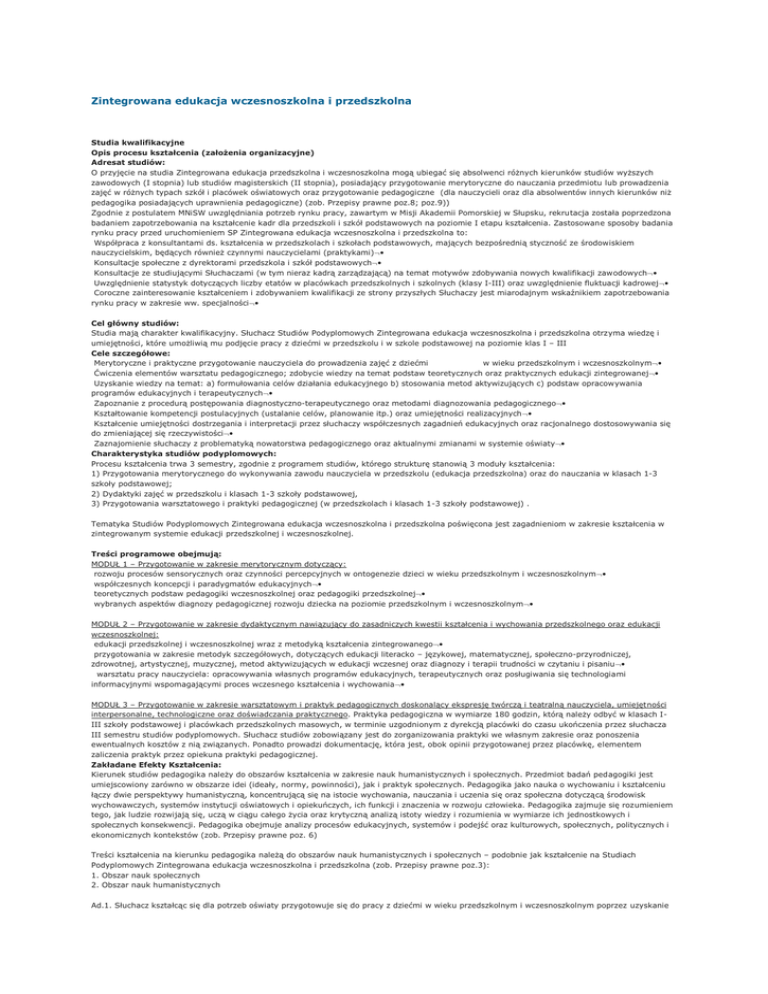 Zintegrowana edukacja wczesnoszkolna i przedszkolna Studia kwalifikacyjne Opis procesu kształcenia (założenia organizacyjne) Adresat studiów: O przyjęcie na studia Zintegrowana edukacja przedszkolna i wczesnoszkolna mogą ubiegać się absolwenci różnych kierunków studiów wyższych zawodowych (I stopnia) lub studiów magisterskich (II stopnia), posiadający przygotowanie merytoryczne do nauczania przedmiotu lub prowadzenia zajęć w różnych typach szkół i placówek oświatowych oraz przygotowanie pedagogiczne (dla nauczycieli oraz dla absolwentów innych kierunków niż pedagogika posiadających uprawnienia pedagogiczne) (zob. Przepisy prawne poz.8; poz.9)) Zgodnie z postulatem MNiSW uwzględniania potrzeb rynku pracy, zawartym w Misji Akademii Pomorskiej w Słupsku, rekrutacja została poprzedzona badaniem zapotrzebowania na kształcenie kadr dla przedszkoli i szkół podstawowych na poziomie I etapu kształcenia. Zastosowane sposoby badania rynku pracy przed uruchomieniem SP Zintegrowana edukacja wczesnoszkolna i przedszkolna to: Współpraca z konsultantami ds. kształcenia w przedszkolach i szkołach podstawowych, mających bezpośrednią styczność ze środowiskiem nauczycielskim, będących również czynnymi nauczycielami (praktykami)• Konsultacje społeczne z dyrektorami przedszkola i szkół podstawowych• Konsultacje ze studiującymi Słuchaczami (w tym nieraz kadrą zarządzającą) na temat motywów zdobywania nowych kwalifikacji zawodowych• Uwzględnienie statystyk dotyczących liczby etatów w placówkach przedszkolnych i szkolnych (klasy I-III) oraz uwzględnienie fluktuacji kadrowej• Coroczne zainteresowanie kształceniem i zdobywaniem kwalifikacji ze strony przyszłych Słuchaczy jest miarodajnym wskaźnikiem zapotrzebowania rynku pracy w zakresie ww. specjalności• Cel główny studiów: Studia mają charakter kwalifikacyjny. Słuchacz Studiów Podyplomowych Zintegrowana edukacja wczesnoszkolna i przedszkolna otrzyma wiedzę i umiejętności, które umożliwią mu podjęcie pracy z dziećmi w przedszkolu i w szkole podstawowej na poziomie klas I – III Cele szczegółowe: Merytoryczne i praktyczne przygotowanie nauczyciela do prowadzenia zajęć z dziećmi w wieku przedszkolnym i wczesnoszkolnym• Ćwiczenia elementów warsztatu pedagogicznego; zdobycie wiedzy na temat podstaw teoretycznych oraz praktycznych edukacji zintegrowanej• Uzyskanie wiedzy na temat: a) formułowania celów działania edukacyjnego b) stosowania metod aktywizujących c) podstaw opracowywania programów edukacyjnych i terapeutycznych• Zapoznanie z procedurą postępowania diagnostyczno-terapeutycznego oraz metodami diagnozowania pedagogicznego• Kształtowanie kompetencji postulacyjnych (ustalanie celów, planowanie itp.) oraz umiejętności realizacyjnych• Kształcenie umiejętności dostrzegania i interpretacji przez słuchaczy współczesnych zagadnień edukacyjnych oraz racjonalnego dostosowywania się do zmieniającej się rzeczywistości• Zaznajomienie słuchaczy z problematyką nowatorstwa pedagogicznego oraz aktualnymi zmianami w systemie oświaty• Charakterystyka studiów podyplomowych: Procesu kształcenia trwa 3 semestry, zgodnie z programem studiów, którego strukturę stanowią 3 moduły kształcenia: 1) Przygotowania merytorycznego do wykonywania zawodu nauczyciela w przedszkolu (edukacja przedszkolna) oraz do nauczania w klasach 1-3 szkoły podstawowej; 2) Dydaktyki zajęć w przedszkolu i klasach 1-3 szkoły podstawowej, 3) Przygotowania warsztatowego i praktyki pedagogicznej (w przedszkolach i klasach 1-3 szkoły podstawowej) . Tematyka Studiów Podyplomowych Zintegrowana edukacja wczesnoszkolna i przedszkolna poświęcona jest zagadnieniom w zakresie kształcenia w zintegrowanym systemie edukacji przedszkolnej i wczesnoszkolnej. Treści programowe obejmują: MODUŁ 1 – Przygotowanie w zakresie merytorycznym dotyczący: rozwoju procesów sensorycznych oraz czynności percepcyjnych w ontogenezie dzieci w wieku przedszkolnym i wczesnoszkolnym• współczesnych koncepcji i paradygmatów edukacyjnych• teoretycznych podstaw pedagogiki wczesnoszkolnej oraz pedagogiki przedszkolnej• wybranych aspektów diagnozy pedagogicznej rozwoju dziecka na poziomie przedszkolnym i wczesnoszkolnym• MODUŁ 2 – Przygotowanie w zakresie dydaktycznym nawiązujący do zasadniczych kwestii kształcenia i wychowania przedszkolnego oraz edukacji wczesnoszkolnej: edukacji przedszkolnej i wczesnoszkolnej wraz z metodyką kształcenia zintegrowanego• przygotowania w zakresie metodyk szczegółowych, dotyczących edukacji literacko – językowej, matematycznej, społeczno-przyrodniczej, zdrowotnej, artystycznej, muzycznej, metod aktywizujących w edukacji wczesnej oraz diagnozy i terapii trudności w czytaniu i pisaniu• warsztatu pracy nauczyciela: opracowywania własnych programów edukacyjnych, terapeutycznych oraz posługiwania się technologiami informacyjnymi wspomagającymi proces wczesnego kształcenia i wychowania• MODUŁ 3 – Przygotowanie w zakresie warsztatowym i praktyk pedagogicznych doskonalący ekspresję twórczą i teatralną nauczyciela, umiejętności interpersonalne, technologiczne oraz doświadczania praktycznego. Praktyka pedagogiczna w wymiarze 180 godzin, którą należy odbyć w klasach IIII szkoły podstawowej i placówkach przedszkolnych masowych, w terminie uzgodnionym z dyrekcją placówki do czasu ukończenia przez słuchacza III semestru studiów podyplomowych. Słuchacz studiów zobowiązany jest do zorganizowania praktyki we własnym zakresie oraz ponoszenia ewentualnych kosztów z nią związanych. Ponadto prowadzi dokumentację, która jest, obok opinii przygotowanej przez placówkę, elementem zaliczenia praktyk przez opiekuna praktyki pedagogicznej. Zakładane Efekty Kształcenia: Kierunek studiów pedagogika należy do obszarów kształcenia w zakresie nauk humanistycznych i społecznych. Przedmiot badań pedagogiki jest
