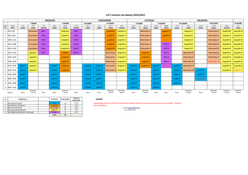 LO V semestr rok szkolny 2014/2015 WRZESIEŃ I ZJAZD godz. lekc. DATA Dzień 5 IX piątek PAŹDZIERNIK II ZJAZD 6 IX sobota 7 IX niedziela 19 IX piątek 20 IX sobota 21 IX niedziela 10 X piątek LISTOPAD IV ZJAZD III ZJAZD 24 X piątek V ZJAZD 25 X sobota 26 X niedziela 14 XI piątek GRUDZIEŃ VI ZJAZD 15 XI sobota 28 XI piątek 29 XI sobota VIII ZJAZD VII ZJAZD 5 XII piątek 6 XII sobota 12 XII piątek IX ZJAZD 13 XII sobota 14 XII niedziela 10 I sobota 2 8:50 - 9:35 matematyka 1 WOS 1 Geografia 6 WOS 7 j.angielski 6 Geografia 11 Matematyka 11 j.angielski 15 Geografia 21 Matematyka 21 Geografia 26 Geografia 36 3 9:40 - 10:25 matematyka 2 WOS 2 Geografia 7 WOS 8 j.angielski 7 Geografia 12 Matematyka 12 j.angielski 16 Geografia 22 Matematyka 22 Geografia 27 Geografia 37 4 10:30 - 11:15 matematyka 3 WOS 3 Geografia 8 WOS 9 j.angielski 8 Geografia 13 Matematyka 13 j.angielski 17 Geografia 23 Matematyka 23 Geografia 28 Geografia 38 5 11:20 - 12:05 matematyka 4 WOS 4 Geografia 9 WOS 10 j.angielski 9 Geografia 14 Matematyka 14 WOS 13 Geografia 24 Matematyka 24 Geografia 29 Geografia 39 6 12:10 - 12:55 matematyka 5 WOS 5 Geografia 10 WOS 11 j.angielski 10 Geografia 15 Matematyka 15 WOS 14 Geografia 25 Matematyka 25 Geografia 30 Geografia 40 7 13:10 - 13:55 geografia 1 WOS 6 j.angielski 1 WOS 12 Matematyka 6 Geografia 16 j.angielski 11 WOS 15 Matematyka 16 Matematyka 26 Geografia 31 Geografia 41 8 14:10 - 14:55 geografia 2 j.angielski 2 Matematyka 7 Geografia 17 j.angielski 12 WOS 16 Matematyka 17 Matematyka 27 Geografia 32 Geografia 42 9 15:00 - 15:45 geografia 3 j.angielski 3 Matematyka 8 Geografia 18 j.angielski 13 WOS 17 Matematyka 18 Matematyka 28 Geografia 33 Geografia 43 10 15:50 - 16:35 j.polski 1 geografia 4 j.polski 7 j.angielski 4 j.polski 13 j.polski 19 Matematyka 9 Geografia 19 j.polski 25 Geografia 34 Geografia 44 11 16:40 - 17:25 j.polski 2 geografia 5 j.polski 8 j.angielski 5 j.polski 14 j.polski 20 Matematyka 10 Geografia 20 j.polski 26 Geografia 35 Geografia 45 12 17:30 - 18:45 j.polski 3 j.polski 9 j.polski 15 j.polski 21 j.polski 27 13 18:50 - 19:35 j.polski 4 j.polski 10 j.polski 16 j.polski 22 14 19:45 - 20:30 j.polski 5 j.polski 11 j.polski 17 14 20:35 - 21:25 j.polski 6 j.polski 12 j.polski 18 Biuro Biuro Salezjanie Sala 44 Salezjanie Sala 44 Miejsce L.p. 1 2 3 4 6 Biuro Salezjanie Sala 44 Wykładowca mgr Joanna Ganobis mgr Zbigniew Wacławek mgr inż. Anna Homa mgr Łukasz Niewiadomski mgr Małgorzata Dziędziel- Gabryszak Biuro Biuro Salezjanie Sala 44 Przedmiot Liczba godzin j. polski j. angielski matematyka geografia WOS 44 17 28 45 18 SUMA 152 Biuro Terminarz egzaminów 12 XII 29 XI 13 XII 10 I 29 XI Matematyka 19 j.polski 32 j.polski 38 Matematyka 20 j.polski 33 j.polski 39 j.polski 43 j.polski 28 j.polski 34 j.polski 40 j.polski 44 j.polski 23 j.polski 29 j.polski 35 j.polski 41 j.polski 24 j.polski 30 j.polski 36 Salezjanie Sala 44 Biuro Salezjanie Sala 44 j.polski 31 WOS 18 j.polski 37 Salezjanie Sala 44 j.angielski 14 Biuro Biuro Biuro UWAGI! Rozkład zajęć może ulec zmianie!!! Należy śledzić aktualne informacje na naszej strony www.sckz.pl w zakładce - Oświęcim Dane kontaktowe: e-mail: [email protected] tel. 33 846 45 68 Salezjanie Sala 44 j.polski 42 Biuro Salezjanie Sala 44