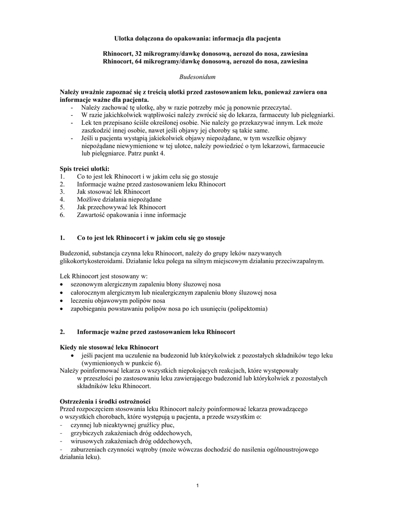 Ulotka dołączona do opakowania: informacja dla pacjenta Rhinocort, 32 mikrogramy/dawkę donosową, aerozol do nosa, zawiesina Rhinocort, 64 mikrogramy/dawkę donosową, aerozol do nosa, zawiesina Budesonidum Należy uważnie zapoznać się z treścią ulotki przed zastosowaniem leku, ponieważ zawiera ona informacje ważne dla pacjenta. - Należy zachować tę ulotkę, aby w razie potrzeby móc ją ponownie przeczytać. - W razie jakichkolwiek wątpliwości należy zwrócić się do lekarza, farmaceuty lub pielęgniarki. - Lek ten przepisano ściśle określonej osobie. Nie należy go przekazywać innym. Lek może zaszkodzić innej osobie, nawet jeśli objawy jej choroby są takie same. - Jeśli u pacjenta wystąpią jakiekolwiek objawy niepożądane, w tym wszelkie objawy niepożądane niewymienione w tej ulotce, należy powiedzieć o tym lekarzowi, farmaceucie lub pielęgniarce. Patrz punkt 4. Spis treści ulotki: 1. Co to jest lek Rhinocort i w jakim celu się go stosuje 2. Informacje ważne przed zastosowaniem leku Rhinocort 3. Jak stosować lek Rhinocort 4. Możliwe działania niepożądane 5. Jak przechowywać lek Rhinocort 6. Zawartość opakowania i inne informacje 1. Co to jest lek Rhinocort i w jakim celu się go stosuje Budezonid, substancja czynna leku Rhinocort, należy do grupy leków nazywanych glikokortykosteroidami. Działanie leku polega na silnym miejscowym działaniu przeciwzapalnym. Lek Rhinocort jest stosowany w: sezonowym alergicznym zapaleniu błony śluzowej nosa całorocznym alergicznym lub niealergicznym zapaleniu błony śluzowej nosa leczeniu objawowym polipów nosa zapobieganiu powstawaniu polipów nosa po ich usunięciu (polipektomia) 2. Informacje ważne przed zastosowaniem leku Rhinocort Kiedy nie stosować leku Rhinocort jeśli pacjent ma uczulenie na budezonid lub którykolwiek z pozostałych składników tego leku (wymienionych w punkcie 6). Należy poinformować lekarza o wszystkich niepokojących reakcjach, które występowały w przeszłości po zastosowaniu leku zawierającego budezonid lub którykolwiek z pozostałych składników leku Rhinocort. Ostrzeżenia i środki ostrożności Przed rozpoczęciem stosowania leku Rhinocort należy poinformować lekarza prowadzącego o wszystkich chorobach, które występują u pacjenta, a przede wszystkim o: - czynnej lub nieaktywnej gruźlicy płuc, - grzybiczych zakażeniach dróg oddechowych, - wirusowych zakażeniach dróg oddechowych, - zaburzeniach czynności wątroby (może wówczas dochodzić do nasilenia ogólnoustrojowego działania leku). 1 Należy również poinformować lekarza o zażywaniu innych leków zawierających glikokortykosteroidy. Zaleca się regularną kontrolę wzrostu dzieci i młodzieży przyjmujących glikokortykosteroidy, bez względu na drogę ich podawania, ze względu na ryzyko spowolnienia wzrostu. Jeśli wzrost jest spowolniony, lekarz może zweryfikować sposób leczenia zmniejszając stosowaną dawkę glikokortykosteroidów donosowych. Podczas zmiany leczenia glikokortykosteroidami o działaniu ogólnym na leczenie lekiem Rhinocort należy zachować szczególną ostrożność ze względu na ryzyko wystąpienia zaburzeń czynności osi podwzgórze-przysadka-nadnercza. U tych pacjentów dawka glikokortykosteroidów o działaniu ogólnym powinna być stopniowo zmniejszana. U pacjentów należących do tej grupy, w sytuacjach stresowych, np. zabieg chirurgiczny czy uraz, lekarz rozważy zastosowanie dodatkowego leczenia glikokortykosteroidami o działaniu ogólnym. Należy skonsultować się z lekarzem, nawet jeśli powyższe ostrzeżenia dotyczą sytuacji występujących w przeszłości. Należy unikać kontaktu leku Rhinocort z oczami. W razie zaistnienia takiej sytuacji należy natychmiast przemyć oczy wodą. Stosowanie leku Rhinocort u pacjentów w podeszłym wieku Nie ma konieczności zmiany dawkowania u osób w podeszłym wieku. Stosowanie leku Rhinocort u pacjentów z zaburzeniami czynności nerek i (lub) wątroby U osób z zaburzeniami czynności wątroby lek Rhinocort należy stosować ostrożnie. Rhinocort a inne leki Należy powiedzieć lekarzowi o wszystkich lekach przyjmowanych przez pacjenta obecnie lub ostatnio, a także o lekach, które pacjent planuje przyjmować, nawet tych, które są wydawane bez recepty, a szczególnie o zażywaniu ketokonazolu i itrakonazolu (leki stosowane w zakażeniach grzybiczych). Jeśli jednoczesne stosowanie takich leków z lekiem Rhinocort jest konieczne, przerwa między stosowaniem poszczególnych leków powinna być jak najdłuższa, a dodatkowo lekarz może zalecić zmniejszenie dawki budezonidu. Należy również poinformować lekarza o niepokojących reakcjach, które występowały po zażyciu innych leków. Ciąża i karmienie piersią Jeśli pacjentka jest w ciąży lub karmi piersią, przypuszcza że może być w ciąży lub gdy planuje mieć dziecko, powinna poradzić się lekarza przed zastosowaniem tego leku. Ciąża Jeśli kobieta leczona lekiem Rhinocort zajdzie w ciążę, powinna niezwłocznie poinformować o tym lekarza. Lek Rhinocort można stosować w ciąży jedynie wtedy, gdy w opinii lekarza przewidywana korzyść dla matki jest większa niż ryzyko dla płodu. Karmienie piersią Budezonid przenikania do mleka kobiecego. Podczas stosowania budezonidu w dawkach leczniczych, nie przewiduje się żadnego wpływu na dziecko karmione piersią. Jednakże, lek Rhinocort może być stosowany u kobiet karmiących piersią jedynie wtedy, gdy w opinii lekarza przewidywana korzyść dla matki jest większa niż ryzyko dla dziecka. Prowadzenie pojazdów i obsługiwanie maszyn Lek Rhinocort nie wpływa na zdolność prowadzenia pojazdów i obsługiwania maszyn. 2 Rhinocort zawiera sorbinian potasu Lek zawiera sorbinian potasu, który może powodować miejscowe reakcje skórne (np. kontaktowe zapalenie skóry). 3. Jak stosować lek Rhinocort Ten lek należy zawsze stosować zgodnie z zaleceniami lekarza. W razie wątpliwo