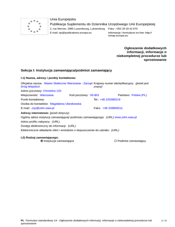 Unia Europejska Publikacja Suplementu do Dziennika Urzędowego Unii Europejskiej 2, rue Mercier, 2985 Luxembourg, Luksemburg Faks: +352 29 29 42 670 E-mail: [email protected] Informacje i formularze on-line: http:// simap.europa.eu Ogłoszenie dodatkowych informacji, informacje o niekompletnej procedurze lub sprostowanie Sekcja I: Instytucja zamawiająca/podmiot zamawiający I.1) Nazwa, adresy i punkty kontaktowe: Oficjalna nazwa: Miasto Stołeczne Warszawa - Zarząd Krajowy numer identyfikacyjny: (jeżeli jest Dróg Miejskich znany) _____ Adres pocztowy: Chmielna 120 Miejscowość: Warszawa Kod pocztowy: 00-801 Punkt kontaktowy: _____ Państwo: Polska (PL) Tel.: +48 225589219 Osoba do kontaktów: Magdalena Ulandowska E-mail: [email protected] Faks: +48 228909211 Adresy internetowe: (jeżeli dotyczy) Ogólny adres instytucji zamawiającej/ podmiotu zamawiającego: (URL) www.zdm.waw.pl Adres profilu nabywcy: (URL) _____ Dostęp elektroniczny do informacji: (URL) _____ Elektroniczne składanie ofert i wniosków o dopuszczenie do udziału: (URL) _____ I.2) Rodzaj zamawiającego: Instytucja zamawiająca Podmiot zamawiający PL Formularz standardowy 14 - Ogłoszenie dodatkowych informacji, informacje o niekompletnej procedurze lub sprostowanie 1/4 Sekcja II: Przedmiot zamówienia II.1.1) Nazwa nadana zamówieniu: KONSERWACJA URZĄDZEŃ SYGNALIZACJI ŚWIETLNEJ NA TERENIE M.ST. WARSZAWA W CZTERECH NIEZALEŻNYCH OBSZARACH II.1.2) Krótki opis zamówienia lub zakupu: (podano w pierwotnym ogłoszeniu) Konserwacja urządzeń sygnalizacji świetlnej na terenie m.st. Warszawa w czterech niezależnych obszarach. Specjalistyczna usługa jaką jest konserwacja urządzeń sygnalizacji świetlnej zlokalizowanych na skrzyżowaniach, przejściach dla pieszych, przejazdach tramwajowych na terenie m.st. Warszawa. II.1.3) Wspólny Słownik Zamówień (CPV) Główny przedmiot Słownik główny 50232200 Słownik uzupełniający (jeżeli dotyczy) PL Formularz standardowy 14 - Ogłoszenie dodatkowych informacji, informacje o niekompletnej procedurze lub sprostowanie 2/4 Sekcja IV: Procedura IV.1)Rodzaj procedury (podano w pierwotnym ogłoszeniu) Otwarta Ograniczona Ograniczona przyspieszona Negocjacyjna Negocjacyjna przyspieszona Dialog konkurencyjny Negocjacyjna z uprzednim ogłoszeniem Negocjacyjna bez uprzedniego ogłoszenia Negocjacyjna z publikacją ogłoszenia o zamówieniu Negocjacyjna bez publikacji ogłoszenia o zamówieniu Udzielenie zamówienia bez uprzedniej publikacji ogłoszenia o zamówieniu w Dzienniku Urzędowym Unii Europejskiej IV.2)Informacje administracyjne IV.2.1)Numer referencyjny: (podano w pierwotnym ogłoszeniu) DZP/48/PN/42/15 IV.2.2)Dane referencyjne ogłoszenia w przypadku ogłoszeń przesłanych drogą elektroniczną: Pierwotne ogłoszenie przesłane przez eNotices TED eSender Login: ENOTICES_dizp Dane referencyjne ogłoszenia: 2015-127977 rok i numer dokumentu IV.2.3)Ogłoszenie, którego dotyczy niniejsza publikacja: Numer ogłoszenia w Dz.U.: 2015/S 189-343226 z dnia: 30/09/2015 (dd/mm/rrrr) IV.2.4)Data wysłania pierwotnego ogłoszenia: 25/09/2015 (dd/mm/rrrr) PL Formularz standardowy 14 - Ogłoszenie dodatkowych informacji, informacje o niekompletnej procedurze lub sprostowanie 3/4 Sekcja VI: Informacje uzupełniające VI.1) Ogłoszenie dotyczy: Procedury niepełnej Sprostowania Informacji dodatkowych VI.2) Informacje na temat niepełnej procedury udzielenia zamówienia: Postępowanie o udzielenie zamówienia zostało przerwane Postępowanie o udzielenie zamówienia uznano za nieskuteczne Zamówienia nie udzielono Zamówienie może być przedmiotem ponownej publikacji VI.3) Informacje do poprawienia lub dodania : VI.3.1) Zmiana oryginalnej informacji podanej przez instytucję zamawiającą Publikacja w witrynie TED niezgodna z oryginalną informacją, przekazaną przez instytucję zamawiającą Oba przypadki VI.3.2) W ogłoszeniu pierwotnym W odpowiedniej dokumentacji przetargowej (więcej informacji w odpowiedniej dokumentacji przetargowej) W obu przypadkach (więcej informacji w odpowiedniej dokumentacji przetargowej) VI.3.3) Tekst, który należy poprawić w pierwotnym ogłoszeniu Miejsce, w którym znajduje się Zamiast: zmieniany tekst: Powinno być: VI.3.4) Daty, które należy poprawić w pierwotnym ogłoszeniu Miejsce, w którym znajdują się Zamiast: zmieniane daty: 20/11/2015 Godzina: 15:30 IV.3.3) (dd/mm/rrrr) Powinno być: 27/11/2015 Godzina: 15:30 (dd/mm/rrrr) Miejsce, w którym znajdują się zmieniane daty: IV.3.4) Zamiast: 23/11/2015 Godzina: 10:00 (dd/mm/rrrr) Powinno być: 30/11/2015 Godzina: 10:00 (dd/mm/rrrr) Miejsce, w którym znajdują się zmieniane daty: IV.3.8) Zamiast: 23/11/2015 Godzina: 11:00 (dd/mm/rrrr) Powinno być: 30/11/2015 Godzina: 11:00 (dd/mm/rrrr) VI.3.5) Adresy i punkty kontaktowe, które należy poprawić VI.3.6) Tekst, który należy dodać do pierwotnego ogłoszenia Miejsce, w którym należy dodać tekst: Tekst do dodania: VI.4) Inne dodatkowe informacje: _____ VI.5) Data wysłania niniejszego ogłoszenia: 20/11/2015 (dd/mm/rrrr) - ID:2015-155770 PL Formularz standardowy 14 - Ogłoszenie dodatkowych informacji, informacje o niekompletnej procedurze lub sprostowanie 4/4