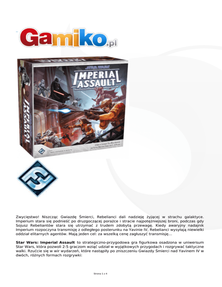 Zwycięstwo! Niszcząc Gwiazdę Śmierci, Rebelianci dali nadzieję żyjącej w strachu galaktyce. Imperium stara się podnieść po druzgoczącej porażce i stracie najpotężniejszej broni, podczas gdy Sojusz Rebeliantów stara się utrzymać z trudem zdobytą przewagę. Kiedy awaryjny nadajnik Imperium rozpoczyna transmisję z odległego posterunku na Yavinie IV, Rebelianci wysyłają niewielki oddział elitarnych agentów. Mają jeden cel: za wszelką cenę zagłuszyć transmisję… Star Wars: Imperial Assault to strategiczno-przygodowa gra figurkowa osadzona w uniwersum Star Wars, która pozwoli 2-5 graczom wziąć udział w wyjątkowych przygodach i rozgrywać taktyczne walki. Rzućcie się w wir wydarzeń, które nastąpiły po zniszczeniu Gwiazdy Śmierci nad Yavinem IV w dwóch, różnych formach rozgrywki: Strona 1 z 4 Kampania w Imperial Assault W rozgrywce w trybie kampanii, maksymalnie pięciu graczy rozegra serię ekscytujących misji połączonych w kampanię. Jeden z graczy dowodzi silnie uzbrojonymi siłami Imperium Galaktycznego, a pozostali gracze wcielają się w bohaterów Rebelii, wyruszających na misje i tajne operacje. W trakcie kampanii zarówno siły Imperium jak i Rebelianci będą zdobywać nowe umiejętności i wyposażenie, dzięki czemu postacie będą rozwijać się wraz z kolejnymi rozdziałami historii. Każda z ponad 30 misji przygotowywana jest z wykorzystaniem dwustronnych kafelków planszy, wybranych spośród ponad pięćdziesięciu dostępnych. Odwzorowują one różnorodne miejsca ze świata Star Wars, takie jak dżungle Yavina IV, pustynne pustkowia Tatooine czy metalowe korytarze imperialnej bazy. Misje w trybie kampanii stawiają przed graczami wyjątkowe wyzwania, które zmuszą ich do wykorzystania wszystkich możliwości kontrolowanych przez nich postaci, w walce o osiągnięcie celów misji. Kiedy gracz aktywuje postać, może wykonać dwie akcje – poruszyć się, zaatakować wręcz lub za pomocą broni dystansowej, otwierać drzwi, przeszukiwać skrzynie w poszukiwaniu przydatnych przedmiotów albo odpoczywać aby zniwelować zmęczenie i wyleczyć rany. Wykonywane akcje i sposób ich rozpatrywania jest kluczowy dla osiągnięcia sukcesu w każdej misji. Potyczka w Imperial Assault W trybie pojedynku dwóch graczy zbierze oddziały uderzeniowe i stanie do walki twarzą w twarz o kluczowe dla obu stron cele. Misje w tym trybie pozwalają dwóm graczom zmierzyć się w bezpośredniej, taktycznej walce. Gracze tworzą w nim własne oddziały imperialnych, rebelianckich lub najemnych sił, wraz z odpowiednimi taliami kart dowodzenia, które mogą zagrywać aby zyskać niespodziewaną przewagę. Każda misja w trybie pojedynku ma własne cele – niezależnie od tego czy gracze będą starali się odzyskać zaginione holokrony czy też bronić się przed szturmującymi oddziałami, będą musieli zmierzyć się z zagrożeniami i podejmować taktyczne decyzje w każdym z pojedynków. W standardowej misji w trybie pojedynku gracze tworzą drużyny z żołnierzy i bohaterów oraz talie kart dowodzenia, które zapewnią im przewagę w bitwie. Wybierając spośród bohaterów oraz oddziałów reprezentujących trzy różne stronnictwa, a karty spośród wielu dostępnych kombinacji, gracze będą mieli wiele możliwości modyfikacji swoich sił uderzeniowych. Podczas samych misji, gracze będą walczyć o osiągnięcie określonego celu, takiego jak ucieczka z zabójczym T-16 Skyhopperem czy odbiór kontrabandy dla Huttów. Niezależnie od celu, gra będzie się toczyć o wysoką stawkę, a każda misja będzie wymagać od graczy zdolności taktycznych. Wasze uzbrojenie Uzbrojenie, wyposażenie oraz karty klas zarówno dla Imperium oraz Rebeliantów dodatkowo zwiększają regrywalność. Przemytnicy, renegaci albo bohaterowie Rebelii mogą stale rozwijać swoje umiejętności pasujące do ich specjalizacji. Dodatkowo, w trakcie kampanii gracze będą zdobywać kredyty, które pozwolą im na zakup różnorodnych przedmiotów, takich jak pistolety blasterowe czy wibroostrza, które dodatkowo można wyposażyć w ulepszenia, takie jak ekran taktyczny. Kiedy bohaterowie zdobywają doświadczenie i lepszy sprzęt, Imperium nie pozostaje w tyle, wykorzystując okazję do zwiększenia potęgi militarnej, ulepszenia technologii czy opracowania nowych taktyk. Dwa zestawy sojuszników Dodatkowo, w podstawowym zestawie gry Imperial Assault zawarte zostały dwa zestawy Strona 2 z 4 sojuszników: Luke’a Skywalkera oraz Dartha Vadera. Znajdują się w nich plastikowe figurki, wraz z nowymi misjami dla trybu kampanii i pojedynku, skupiającymi się na tych dwóch ikonicznych postaciach ze świata Star Wars. Zawartość pudełka: 34 plastikowe figurki 59 kafelków mapy 11 kostek 289 kart ponad 150 żetonów zestaw dodatkowy: Luke Skywalker zestaw dodatkowy: Darth Vader instrukcja skrócona instrukcja podręcznik kampanii podręcznik potyczek Wiek 12 + Liczba graczy 2-5 Czas gry ok. 90 minut Instrukcja angielska Wydanie angielskie Strona 3 z 4 Producent Fantasy Flight Games Projektant Justin Kemppainen Corey Konieczka Jonathan Ying Strona 4 z 4