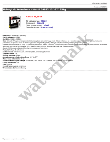 Informacje o produkcie Utworzono 04-03-2017 Uchwyt do telewizora 4World 09933 13"-37" 35kg Cena : 35,99 zł Nr katalogowy : 09933 Producent : 4World Stan magazynowy : niski Średnia ocena : brak recenzji w at er m ar k Gwarancja: 24 miesiące gwarancji Kod Producenta: 09933 Kod EAN:: 5908214366828 Opis: Uchwyty TV wykonane są z materiałów najwyższej jakościUchwyty marki 4Word wykonane są z wysokiej jakości materiałów oraz są malowane proszkowo, co sprawia, że na ich matowej powłoce nie pozostają ślady! Uchwyty przystosowane są kompatybilne z wszystkimi markami telewizorów (m.in. Sony, LG, Samsung, Panasonic, SHARP, Toshiba). Każdy z naszych uchwytów zamontujesz szybko i w prosty sposób. W zestawie załączona jest instrukcja manualna, która ułatwi proces montażu. Solidnie wykonane oraz międzynarodowy standard VESA, gwarantuje stabilność przymocowanego telewizora. Produkt: Uchwyt do telewizora Zastosowanie: telewizory LCD , telewizory LED , telewizory plazmowe Standard VESA: Tak Miejsce montażu: ściana Akceptowana przekątna telewizora: 13 " do 37 " Maks. waga telewizora: 35 kg Rozstaw otworów pod uchwyt: 50 x 50mm, 75 x 75mm, 100 x 100mm, 200 x 100mm, 200 x 200 mm Cechy dodatkowe: b/d Kolor: czarny Sposób lakierowania: proszkowe W komplecie: Zestaw montażowy Wygenerowano w programie www.oscGold.com