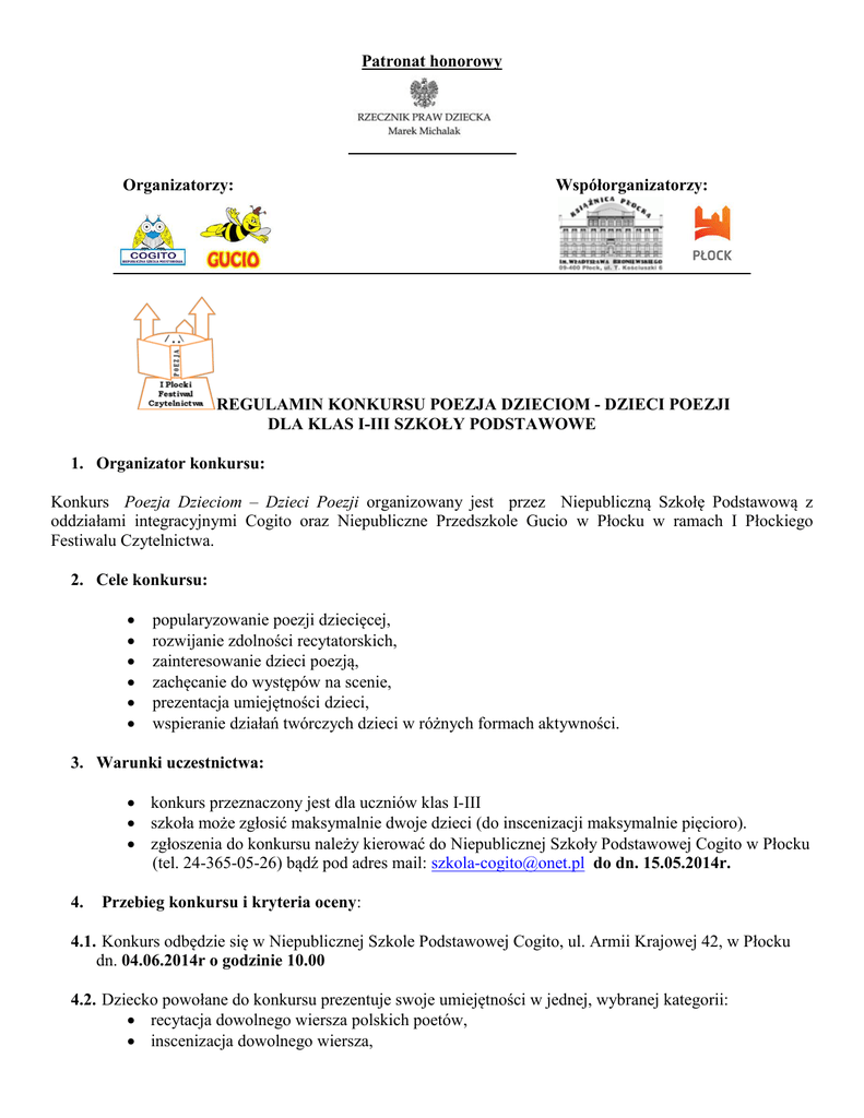 Patronat honorowy Organizatorzy: Współorganizatorzy: REGULAMIN KONKURSU POEZJA DZIECIOM - DZIECI POEZJI DLA KLAS I-III SZKOŁY PODSTAWOWE 1. Organizator konkursu: Konkurs Poezja Dzieciom – Dzieci Poezji organizowany jest przez Niepubliczną Szkołę Podstawową z oddziałami integracyjnymi Cogito oraz Niepubliczne Przedszkole Gucio w Płocku w ramach I Płockiego Festiwalu Czytelnictwa. 2. Cele konkursu: popularyzowanie poezji dziecięcej, rozwijanie zdolności recytatorskich, zainteresowanie dzieci poezją, zachęcanie do występów na scenie, prezentacja umiejętności dzieci, wspieranie działań twórczych dzieci w różnych formach aktywności. 3. Warunki uczestnictwa: konkurs przeznaczony jest dla uczniów klas I-III szkoła może zgłosić maksymalnie dwoje dzieci (do inscenizacji maksymalnie pięcioro). zgłoszenia do konkursu należy kierować do Niepublicznej Szkoły Podstawowej Cogito w Płocku (tel. 24-365-05-26) bądź pod adres mail: [email protected] do dn. 15.05.2014r. 4. Przebieg konkursu i kryteria oceny: 4.1. Konkurs odbędzie się w Niepublicznej Szkole Podstawowej Cogito, ul. Armii Krajowej 42, w Płocku dn. 04.06.2014r o godzinie 10.00 4.2. Dziecko powołane do konkursu prezentuje swoje umiejętności w jednej, wybranej kategorii: recytacja dowolnego wiersza polskich poetów, inscenizacja dowolnego wiersza, twórczość własna. 4.3. Konkurs będzie miał formę prezentacji dowolnego utworu poetyckiego. 4.4. Nauczyciel dziecka, które bierze udział w konkursie dostarcza tekst prezentowanego wiersza jury. 4.5. Powołana przez organizatora komisja dokona oceny wg następujących kryteriów: pamięciowe opanowanie tekstu (0-3p), interpretacja tekstu (0-3p), ogólny wyraz artystyczny ( uzasadniony gest sceniczny, element ruchu, strój )( 0-3p). 4.6. Po zaprezentowaniu przez dzieci przygotowanych wierszy komisja uda się na naradę, po której zostanie ogłoszony werdykt. 4.7. Decyzja komisji jest niepodważalna. 5. Nagrody rzeczowe: 5.1. Laureaci I, II, III miejsca otrzymają nagrody rzeczowe oraz dyplomy. 5.2. Ogłoszenie wyników odbędzie się po zakończeniu obrad komisji. 5.3. Wszyscy uczestnicy konkursu otrzymają pamiątkowe dyplomy. 6. Postanowienia końcowe: 6.1. Wyniki konkursu zostaną opublikowane na stronie internetowej Szkoły Podstawowej Cogito. 6.2. Uczestnicy konkursu wyrażają zgodę na publikacje ich wizerunku w formie elektronicznej na stronie internetowej przedszkola Gucio i Szkoły Podstawowej Cogito. 6.3.Przystąpienie do konkursu jest równoznaczne z akceptacją regulaminu. Karty zgłoszeniowe poniżej KARTA ZGŁOSZENIA Uzupełnioną kartę zgłoszenia należy przesłać pod adres organizatora: Niepubliczna Szkoła Podstawowa Cogito, ul. Armii Krajowej 42, 09-409 Płock lub na adres e-mail: [email protected] Nazwa i adres szkoły oraz kontakt telefoniczny: ……………………………………………………………………………………………………………………………… ………………………………………………………………………………………………………………………… 1. Imię i nazwisko uczestnika:…………………………………………….………..……klasa:……… 2. Tytuł i autor wiersza:……………………………………………………………………………………… 3. Kategoria: recytacja dowolnego wiersza, inscenizacja dowolnego wiersza, twórczość własna (wybór wpisać poniżej):…………………………………………………………………………………………………… 4. Imię i nazwisko nauczyciela: ..……………………………………………………………………….. 1. Imię i nazwisko uczestnika:…………………………………………….………..……klasa :……… 2. Tytuł i autor wiersza:……………………………………………………………………………………… 3. Kategoria: recytacja dowolnego wiersza, inscenizacja dowolnego wiersza, twórczość własna (wybór wpisać poniżej):…………………………………………………………………………………………………… 4. Imię i nazwisko nauczyciela: ..……………………………………………………………………….. 1. Imię i nazwisko uczestnika:…………………………………………….………..……klasa:……… 2. Tytuł i autor wiersza:……………………………………………………………………………………… 3. Kategoria: recytacja dowolnego wiersza, inscenizacja dowolnego wiersza, twórczość własna (wybór wpisać poniżej):…………………………………………………………………………………………………… 4. Imię i nazwisko nauczyciela: ..………………………………………………………………………..