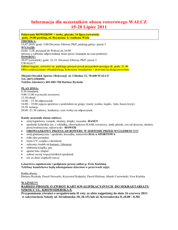 Informacja dla uczestników obozu rowerowego WAŁCZ 15-28 Lipiec 2011 Pakowanie ROWERÓW + torby, plecaki, 14 lipca (czwartek) godz. 19.00 parking, ul. Reymonta k/ stadionu Wisła ZBIÓRKA: 15.07.2010 godz. 5.00 Dworzec Główny PKP, parking górny- peron 3 WYJAZD: Godz. 5.28, przyjazd do Wałcza ok.16.00 (proszę o zabranie odpowiedniej ilości picia i kanapek na czas podróży). POWRÓT: 28.07 (czwartek), godz. 22.18 Dworzec Główny PKP- peron 3. UWAGA!!! Odbiór bagaży, rowerów na parkingu górnym przed przyjazdem pociągu ok. godz. 21.40 Obóz rozpoczynamy obiadokolacją, kończymy śniadaniem + prowiant na drogę powrotną Miejski Ośrodek Sportu i Rekreacji ul. Chłodna 12, 78-600 WAŁCZ Tel. (067)/2584056 Telefon Alarmowy 601-082-768 Dariusz Ryskala PLAN DNIA: 8.30 śniadanie 9.00-13.00 wycieczki rowerowe 13.30 obiad 14.00 – 15.30 odpoczynek 16.00 – 19.00 zajęcia sportowe z podziałem na grupy: (narty wodne, kajaki, hala, basen kryty) 19.30 kolacja 20.00 -21.30 zabawy, konkursy, czas wolny na odpoczynek. Każdy uczestnik obozu zabiera: • strój kąpielowy /czepek, okulary, klapki, suszarka -BASEN • spodenki kolarskie tzn. z wkładką, obowiązkowo KASK rowerowy, mały plecak, coś od deszczu, okulary przeciwsłoneczne, rękawiczki –ROWER • OBOWIĄZKOWY PRZEGLĄD ROWERU W SERWISIE PRZED WYJAZDEM !!!!!! • strój gimnastyczny / spodenki, koszulka, tenisówki-HALA SPORTOWA • rolki (kto posiada). • krem UV, czapka z daszkiem • zalecany środek na komary / kleszcze • ulubioną książkę, grę • aparat foto /chętni/ • zabrać raczej więcej krótkich spodenek • nie za dużo ciepłych rzeczy Lekarstwa zapakowane i podpisane proszę oddać p. Ewie Kielskiej Telefony komórkowe będą udostępniane dzieciom w przerwach zajęć. Kadra obozu: Dariusz Ryskala, Paweł Nowacki, Krzysztof Kulpicki, Paweł Holizna, Marek Czerwiński, Ewa Kielska WAŻNE!!!! BARDZO PROSZĘ O ZWROT KART KWALIFIKACYJNYCH DO SEKRAETARIATU SZKOŁY UL. KROWODERSKA 8. Przypominam również o uregulowaniu II raty za obóz najpóźniej do dnia 16 czerwca 2011 w sekretariacie Szkoły ul. Stradomska 10, (8-15) lub ul. Krowoderska 8, (8.00 - 8.30)