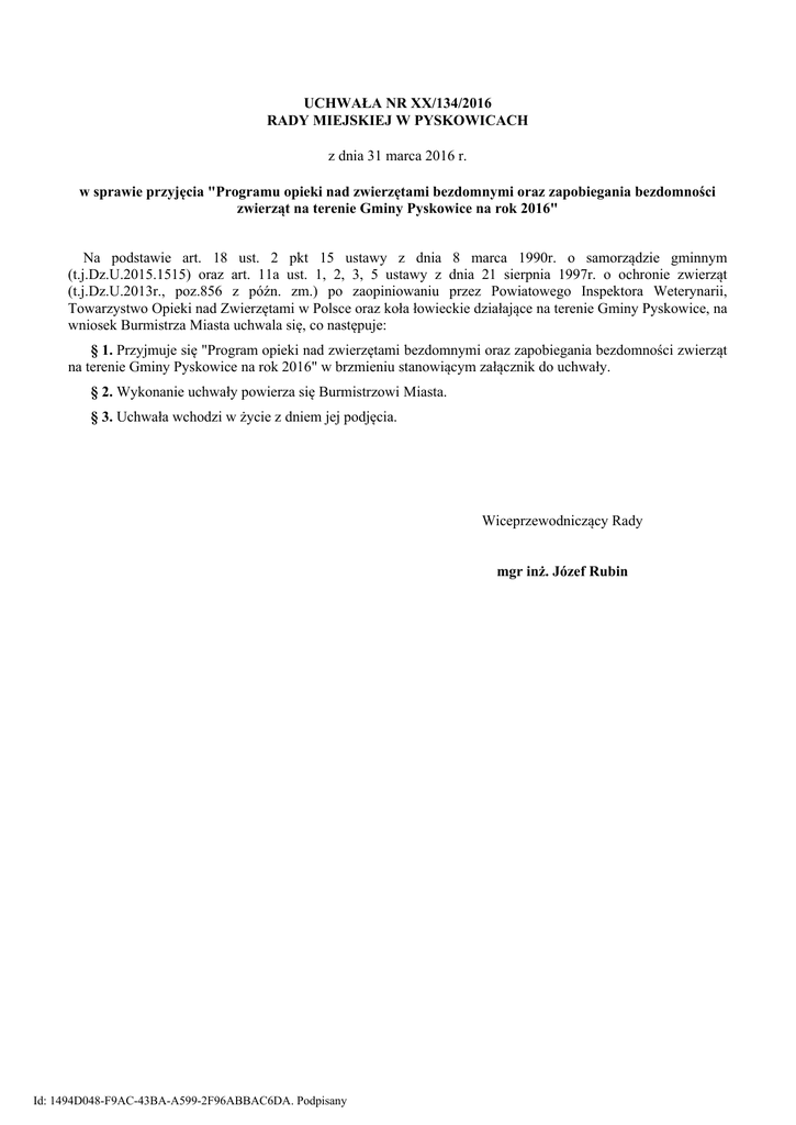 UCHWAŁA NR XX/134/2016 RADY MIEJSKIEJ W PYSKOWICACH z dnia 31 marca 2016 r. w sprawie przyjęcia "Programu opieki nad zwierzętami bezdomnymi oraz zapobiegania bezdomności zwierząt na terenie Gminy Pyskowice na rok 2016" Na podstawie art. 18 ust. 2 pkt 15 ustawy z dnia 8 marca 1990r. o samorządzie gminnym (t.j.Dz.U.2015.1515) oraz art. 11a ust. 1, 2, 3, 5 ustawy z dnia 21 sierpnia 1997r. o ochronie zwierząt (t.j.Dz.U.2013r., poz.856 z późn. zm.) po zaopiniowaniu przez Powiatowego Inspektora Weterynarii, Towarzystwo Opieki nad Zwierzętami w Polsce oraz koła łowieckie działające na terenie Gminy Pyskowice, na wniosek Burmistrza Miasta uchwala się, co następuje: § 1. Przyjmuje się "Program opieki nad zwierzętami bezdomnymi oraz zapobiegania bezdomności zwierząt na terenie Gminy Pyskowice na rok 2016" w brzmieniu stanowiącym załącznik do uchwały. § 2. Wykonanie uchwały powierza się Burmistrzowi Miasta. § 3. Uchwała wchodzi w życie z dniem jej podjęcia. Wiceprzewodniczący Rady mgr inż. Józef Rubin Id: 1494D048-F9AC-43BA-A599-2F96ABBAC6DA. Podpisany Załącznik do Uchwały Nr XX/134/2016 Rady Miejskiej w Pyskowicach z dnia 31 marca 2016 r. Program opieki nad zwierzętami bezdomnymi oraz zapobiegania bezdomności zwierząt na terenie Gminy na rok 2016 Rozdział I. Zapewnienie bezdomnym zwierzętom miejsca w schronisku dla zwierząt Gmina realizuje zadanie poprzez: 1. doprowadzenie bezdomnych zwierząt do schroniska dla bezdomnych zwierząt w Miedarach przy ul. 1 Maja, prowadzonego przez Przedsiębiorstwo Wielobranżowe "ZAMEX" Patryk Hańderek, zwanego dalej Schroniskiem dla zwierząt lub Schroniskiem, zapewniając doprowadzonym zwierzętom odpowiednie warunki przez stosowny okres, nie krótszy niż 14 dni, 2. współpracę z organizacjami pozarządowymi, których działalnością statutową jest ochrona zwierząt oraz z kołami łowieckimi działającymi na jej obszarze, w celu zainicjowania doprowadzenia do Schroniska dla zwierząt. Rozdział II. Opieka nad wolno żyjącymi kotami, w tym ich dokarmianie Gmina realizuje zadanie poprzez: 1. podejmowanie interwencji przez pracowników Urzędu Miasta w sprawach kotów wolno żyjących, 2. tworzenie rejestru społecznych opiekunów zwierząt, a w szczególności kotów, którzy deklarują współpracę w zakresie opieki nad bezdomnymi zwierzętami, 3. współpracę ze społecznymi opiekunami oraz lekarzami weterynarii mającymi siedziby na terenie Gminy, zgłaszających uzasadnioną potrzebę podjęcia opieki nad kotami wolno żyjącymi, 4. współpracę ze społecznymi opiekunami kotów wolno żyjących, właścicielami domów lub zarządcami, mieszkańcami, organizacjami społecznymi oraz służbami porządkowymi, w zakresie sprawowania bieżącej opieki, 5. zakup przez Urząd Miejski i wydawanie karmy społecznym opiekunom (karmicielom kotów), w szczególności w okresie zimowym, 6. monitorowanie skupisk kotów wolno żyjących, w celu zapewnienia im opieki, ograniczenia rozrodczości oraz ze względów epidemiologicznych zachowania czystości w miejscach ich dokarmiania. Rozdział III. Odławianie bezdomnych zwierząt 1. Czynności związane z odławianiem bezdomnych zwierząt będą prowadzone przez Tonsmeier Południe Sp. z o.o., Oddział w Pyskowicach przy ul. Zaolszany 3. 2. Inicjowanie działań dotyczących odłowienia bezdomnych zwierząt należy do służb porządkowych. 3. Odławiane bezdomne zwierzęta będą przewożone do Schroniska dla zwierząt. 4. W przypadku odłowionych rannych zwierząt, opiekę lekarską nad nimi zapewni lekarz weterynarii Stanisław Marszałek z siedzibą w Pyskowicach przy ul. Czyżyków 9 lub Schronisko, do którego zwierzę zostanie przewiezione. Rozdział IV. Obligatoryjna sterylizacja albo kastracja zwierząt w schroniskach dla zwierząt U zwierząt z terenu Gminy Pyskowice doprowadzonych do Schroniska, będzie wykonany zabieg sterylizacji lub kastracji, po upływie 14 dni od ich umieszczenia w Schronisku. Rozdział V. Poszukiwanie właścicieli dla bezdomnych zwierząt Gmina realizuje zadanie poprzez: Id: 1494D048-F9AC-43BA-A599-2F96ABBAC6DA. Podpisany 1. współpracę ze Schroniskiem, które prowadzi działania zmierzające do pozyskiwania nowych właścicieli i oddawania do adopcji bezdomnych psów i kotów osobom zainteresowanym i zdolnym zapewnić im należyte warunki bytowania, 2. informowanie o możliwości adopcji zwierząt bezdomnych wyłapanych z terenu Gminy Pyskowice, w sposób zwyczajowo przyjęty np. strona internetowa Urzędu lub prasa lokalna. Rozdział VI. Usypianie ślepych miotów 1. Ślepe mioty będą usypiane zgodnie z obowiązującymi przepisami prawa przez miejscowego lekarza weterynarii. 2. Na wniosek społecznych opiekunów może zostać wystawione przez Urząd Miejski zlecenie na wykonanie przedmiotowego zabiegu. Po uzyskaniu zlecenia społeczny opiekun zwierząt podejmuje działania, by zabieg został wykonany. 3. Gmina po zgłoszeniu przez społecznych opiekunów zwierząt i przy współpracy z tymi opiekunami, zlecać będzie dokonanie zabiegów sterylizacji lub kastracji kotów wolno żyjących. Rozdział VII. Wskazanie gospodarstwa rolnego w celu zapewnienia miejsca dla zwierząt gospodarskich Zwierzęta gospodarskie przewożone będą do gospodarstwa rolnego w Pyskowicach przy ul. Młyńskiej 3. Rozdział VIII. Zapewnienie całodobowej opieki weterynaryjnej w przypadkach zdarzeń drogowych z udziałem zwierząt 1. Gmina zapewnia całodobową opiekę weterynaryjną w przypadkach zdarzeń drogowych z udziałem zwierząt, w Przychodni Weterynaryjnej w Pyskowicach przy ul. Czyżyków 9. Po udzieleniu pomocy poszkodowanemu zwierzęciu bezdomnemu przez lekarza weterynarii, zostanie ono przetransportowane do Schroniska. 2. Zgłoszeń o wystąpieniu zdarzeń drogowych z udziałem zwierząt należy dokonywać w punkcie pn.: „Alarm dla zwierząt” pod numerem telefonu 32/332-60-06, Straż Miejska w Pyskowicach ul. Strzelców Bytomskich 3. Rozd