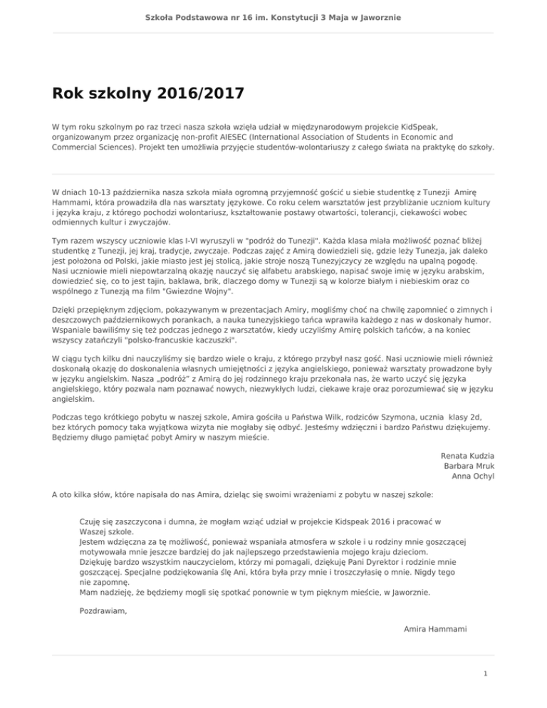 Szkoła Podstawowa nr 16 im. Konstytucji 3 Maja w Jaworznie Rok szkolny 2016/2017 W tym roku szkolnym po raz trzeci nasza szkoła wzięła udział w międzynarodowym projekcie KidSpeak, organizowanym przez organizację non-profit AIESEC (International Association of Students in Economic and Commercial Sciences). Projekt ten umożliwia przyjęcie studentów-wolontariuszy z całego świata na praktykę do szkoły. W dniach 10-13 października nasza szkoła miała ogromną przyjemność gościć u siebie studentkę z Tunezji Amirę Hammami, która prowadziła dla nas warsztaty językowe. Co roku celem warsztatów jest przybliżanie uczniom kultury i języka kraju, z którego pochodzi wolontariusz, kształtowanie postawy otwartości, tolerancji, ciekawości wobec odmiennych kultur i zwyczajów. Tym razem wszyscy uczniowie klas I-VI wyruszyli w "podróż do Tunezji". Każda klasa miała możliwość poznać bliżej studentkę z Tunezji, jej kraj, tradycje, zwyczaje. Podczas zajęć z Amirą dowiedzieli się, gdzie leży Tunezja, jak daleko jest położona od Polski, jakie miasto jest jej stolicą, jakie stroje noszą Tunezyjczycy ze względu na upalną pogodę. Nasi uczniowie mieli niepowtarzalną okazję nauczyć się alfabetu arabskiego, napisać swoje imię w języku arabskim, dowiedzieć się, co to jest tajin, baklawa, brik, dlaczego domy w Tunezji są w kolorze białym i niebieskim oraz co wspólnego z Tunezją ma film "Gwiezdne Wojny". Dzięki przepięknym zdjęciom, pokazywanym w prezentacjach Amiry, mogliśmy choć na chwilę zapomnieć o zimnych i deszczowych październikowych porankach, a nauka tunezyjskiego tańca wprawiła każdego z nas w doskonały humor. Wspaniale bawiliśmy się też podczas jednego z warsztatów, kiedy uczyliśmy Amirę polskich tańców, a na koniec wszyscy zatańczyli "polsko-francuskie kaczuszki". W ciągu tych kilku dni nauczyliśmy się bardzo wiele o kraju, z którego przybył nasz gość. Nasi uczniowie mieli również doskonałą okazję do doskonalenia własnych umiejętności z języka angielskiego, ponieważ warsztaty prowadzone były w języku angielskim. Nasza „podróż” z Amirą do jej rodzinnego kraju przekonała nas, że warto uczyć się języka angielskiego, który pozwala nam poznawać nowych, niezwykłych ludzi, ciekawe kraje oraz porozumiewać się w języku angielskim. Podczas tego krótkiego pobytu w naszej szkole, Amira gościła u Państwa Wilk, rodziców Szymona, ucznia klasy 2d, bez których pomocy taka wyjątkowa wizyta nie mogłaby się odbyć. Jesteśmy wdzięczni i bardzo Państwu dziękujemy. Będziemy długo pamiętać pobyt Amiry w naszym mieście. Renata Kudzia Barbara Mruk Anna Ochyl A oto kilka słów, które napisała do nas Amira, dzieląc się swoimi wrażeniami z pobytu w naszej szkole: Czuję się zaszczycona i dumna, że mogłam wziąć udział w projekcie Kidspeak 2016 i pracować w Waszej szkole. Jestem wdzięczna za tę możliwość, ponieważ wspaniała atmosfera w szkole i u rodziny mnie goszczącej motywowała mnie jeszcze bardziej do jak najlepszego przedstawienia mojego kraju dzieciom. Dziękuję bardzo wszystkim nauczycielom, którzy mi pomagali, dziękuję Pani Dyrektor i rodzinie mnie goszczącej. Specjalne podziękowania ślę Ani, która była przy mnie i troszczyłasię o mnie. Nigdy tego nie zapomnę. Mam nadzieję, że będziemy mogli się spotkać ponownie w tym pięknym mieście, w Jaworznie. Pozdrawiam, Amira Hammami 1