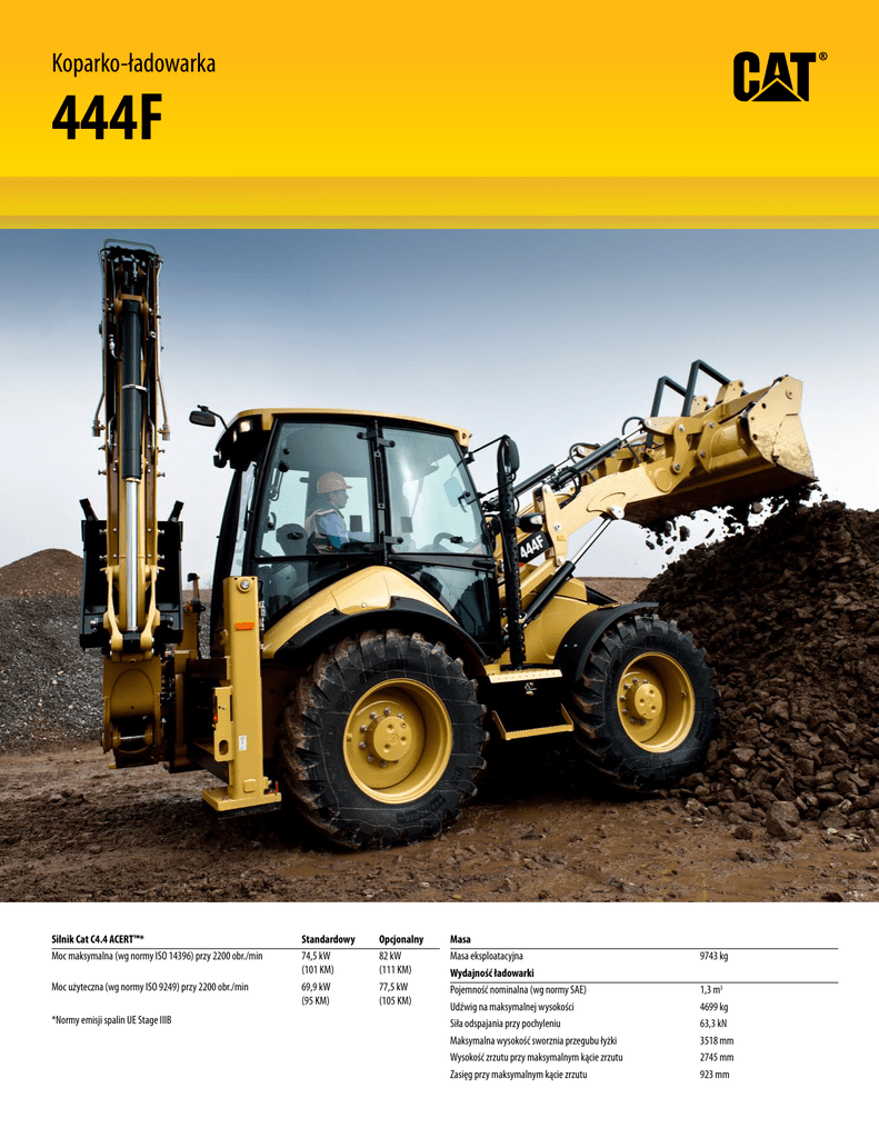 Koparko-ładowarka 444F Silnik Cat C4.4 ACERT™* Moc maksymalna (wg normy ISO 14396) przy 2200 obr./min Moc użyteczna (wg normy ISO 9249) przy 2200 obr./min *Normy emisji spalin UE Stage IIIB Standardowy 74,5 kW (101 KM) 69,9 kW (95 KM) Opcjonalny 82 kW (111 KM) 77,5 kW (105 KM) Masa Masa eksploatacyjna Wydajność ładowarki Pojemność nominalna (wg normy SAE) Udźwig na maksymalnej wysokości Siła odspajania przy pochyleniu Maksymalna wysokość sworznia przegubu łyżki Wysokość zrzutu przy maksymalnym kącie zrzutu Zasięg przy maksymalnym kącie zrzutu 9743 kg 1,3 m3 4699 kg 63,3 kN 3518 mm 2745 mm 923 mm Wydajność kolejnej generacji Przekładnia hydrokinetyczna ze sprzęgłem blokującym O 16% mniejsze zużycie paliwa i o 11% większa średnia prędkość – przekładnia hydrokinetyczna ze sprzęgłem blokującym to niezwykle przydatny element podczas poruszania się pomiędzy stanowiskami pracy. Wydajny układ hydrauliczny Pompa osiowo-tłokowa o dużej wydajności automatycznie wykrywa przepływ wymagany do wykonania danej pracy i zapewnia płynną kontrolę oraz dużą moc przy obniżonej prędkości obrotowej silnika. Obsługa serwisowa W modelu 444F zastosowano odchylany moduł chłodnicy, łatwo otwieraną pokrywę silnika oraz regulowane nakładki cierne stabilizatora i ramienia teleskopowego. Oznacza to mniej przestojów maszyny i większą wygodę pracy. Duży zbiornik paliwa wykonany z tworzywa Duży, wykonany z tworzywa 160-litrowy zbiornik paliwa, który w połączeniu z oszczędnym silnikiem Cat i wydajnym układem hydraulicznym pozwala na dłuższą pracę maszyny bez tankowania i poprawia wygodę pracy. Materiał kompozytowy zapobiega powstawaniu rdzy wewnątrz zbiornika i chroni w ten sposób podzespoły wewnętrzne. Spis treści Jednakowy rozmiar opon...............................................................4 Stanowisko pracy operatora...........................................................6 Ładowarka.....................................................................................8 Koparka..........................................................................................9 Hydraulika....................................................................................10 Układ przeniesienia napędu.........................................................11 Osprzęt roboczy............................................................................12 Wsparcie dla klientów..................................................................13 Obsługa serwisowa......................................................................13 Dane techniczne...........................................................................14 Wyposażenie standardowe..........................................................18 Wyposażenie dodatkowe.............................................................19 2 Kontynuujące sukces modeli serii F koparko-ładowarki Cat są obecnie wyposażone w najnowsze technologie zmniejszające emisję spalin i spełniające wymagania norm UE Stage IIIB. Wprowadzone w nowym silniku ze sterowaniem elektronicznym nowe funkcje umożliwiające oszczędzanie paliwa oraz nieprzesłaniająca widoczności pionowa rura wydechowa to coś więcej niż zwykła aktualizacja silnika. 3 Pasywny system filtra cząstek stałych Bezobsługowy filtr cząstek stałych nie wymaga interwencji operatora, dzięki wbudowanej funkcji automatycznego czyszczenia. To kolejna rzecz, o której nie trzeba już pamiętać. Funkcja automatycznego wyrównywania kół Przełączanie trybów pracy układu kierowniczego jest teraz jeszcze łatwiejsze – funkcja automatycznego wyrównywania kół umożliwia włączenie wybranego trybu po ustawieniu kół w osi środkowej maszyny. Osie i blokada mechanizmu różnicowego Wytrzymałe osie Cat zastosowane w modelu 444F zostały zaprojektowane do użytku w najtrudniejszych warunkach, a blokada mechanizmu różnicowego tylnej osi zapewnia przyczepność na każdego rodzaju podłożu. Hamowanie z włączaniem napędu na wszystkie koła Wciśnięcie pedału hamulca podczas jazdy z włączonym napędem na dwa koła powoduje samoczynne załączenie napędu na wszystkie koła. Po zwolnieniu pedału hamulca jest przywracany napęd na dwa koła. To rozwiązanie doskonale sprawdza się w niebezpiecznych warunkach i na śliskich lub stromych nawierzchniach. Tryb hamowania wybiera się za pomocą łatwo dostępnego włącznika napędu na wszystkie koła, co zwiększa skuteczność hamowania i pozwala ograniczyć zużycie opon. Wysoka wartość po zakończeniu eksploatacji Wysoki stopień ochrony modelu 444F przed korozją i uszkodzeniami zapewnia podkład lakierniczy nanoszony metodą galwaniczną (E-Coat), która gwarantuje dokładne pokrycie wszystkich powierzchni metalowych. Z kolei trwała, poliuretanowa powłoka zewnętrzna sprawia, że model 444F wygląda dobrze i zachowuje wysoką wartość rynkową przez długi czas. Silnikowy filtr powietrza Suchy, odśrodkowy filtr powietrza zespolony z automatycznym odpylaczem powietrza i układem automatycznie usuwającym zanieczyszczenia wyróżnia się bardzo dużą trwałością użytkową, nawet podczas pracy przy dużym zapyleniu. Skraca to czas obsługi technicznej i obniża koszty. Ekstremalne warunki Nasze sprawdzone silniki zostały przetestowane w najtrudniejszych warunkach. W zależności od wymagań regionalnych nasze maszyny mogą zostać wyposażone do pracy w bardzo niskich lub bardzo wysokich temperaturach (do 50°C). Światła robocze Przednie i tylne światła robocze modelu 444F są regulowane. Operator może skierować strumień światła dokładnie tam, gdzie go najbardziej potrzebuje, co gwarantuje doskonałe oświetlenie miejsca pracy niezależnie od warunków oświetlenia zewnętrznego. 4 Jednakowy rozmiar opon Uniwersalność w każdym terenie. Większa zdolność do poruszania się po miękkim terenie Model 444F może sprawnie pracować w terenie, w którym 