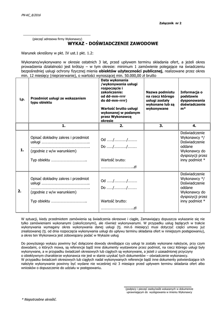 PN-KC_8/2016 Załącznik nr 2 (pieczęć adresowa firmy Wykonawcy) WYKAZ - DOŚWIADCZENIE ZAWODOWE Warunek określony w pkt. IV ust.1 pkt. 1.2: Wykonano/wykonywano w okresie ostatnich 3 lat, przed upływem terminu składania ofert, a jeżeli okres prowadzenia działalności jest krótszy – w tym okresie: minimum 1 zamówienie polegające na świadczeniu bezpośredniej usługi ochrony fizycznej mienia obiektów użyteczności publicznej, realizowane przez okres min. 12 miesięcy (nieprzerwanie), o wartości wynoszącej min. 50.000,00 zł brutto Lp. Przedmiot usługi ze wskazaniem typu obiektu Data wykonania /wykonywania usługi rozpoczęcie i zakończenie: od dd-mm-rrrr do dd-mm-rrrr) Wartość brutto usługi wykonanej w podanym przez Wykonawcę okresie 1. 1. Opisać dokładny zakres i przedmiot usługi ……………………………………….. …………………………………………………. (zgodnie z w/w warunkiem) Typ obiektu …………………………….. 2. Nazwa podmiotu na rzecz którego usługi zostały wykonane lub są wykonywane 3. Od ……/…………/……… Do ……/…………/……… Wartość brutto: Informacja o podstawie dysponowania doświadczenie m* 4. Doświadczenie Wykonawcy */ Doświadczenie oddane Wykonawcy do dyspozycji przez inny podmiot * …………………………..zł 2. Opisać dokładny zakres i przedmiot usługi ……………………………………….. …………………………………………………. (zgodnie z w/w warunkiem) Typ obiektu …………………………….. Od ……/…………/……… Do ……/…………/……… Wartość brutto: Doświadczenie Wykonawcy */ Doświadczenie oddane Wykonawcy do dyspozycji przez inny podmiot * …………………………..zł W sytuacji, kiedy przedmiotem zamówienia są świadczenia okresowe i ciągłe, Zamawiający dopuszcza wykazanie się nie tylko zamówieniami wykonanymi (zakończonymi), ale również wykonywanymi. W przypadku usług będących w trakcie wykonywania wymagany okres wykonywania danej usługi (tj. min.6 miesięcy) musi dotyczyć części umowy już zrealizowanej (tj. od dnia rozpoczęcia wykonywania usługi do upływu terminu składania ofert w niniejszym postępowaniu), a okres ten Wykonawca jest zobowiązany podać w Wykazie usług Do powyższego wykazu powinny być dołączone dowody określające czy usługi te zostały wykonane należycie, przy czym dowodami, o których mowa, są referencje bądź inne dokumenty wystawione przez podmiot, na rzecz którego usługi były wykonywane, a w przypadku świadczeń okresowych lub ciągłych są wykonywane, a jeżeli z uzasadnionej przyczyny o obiektywnym charakterze wykonawca nie jest w stanie uzyskać tych dokumentów – oświadczenie wykonawcy. W przypadku świadczeń okresowych lub ciągłych nadal wykonywanych referencje bądź inne dokumenty potwierdzające ich należyte wykonywanie powinny być wydane nie wcześniej niż 3 miesiące przed upływem terminu składania ofert albo wniosków o dopuszczenie do udziału w postępowaniu. (podpis/y i pieczęć osoby/osób wskazanych w dokumencie uprawniającym do występowania w imieniu Wykonawcy * Niepotrzebne skreślić.