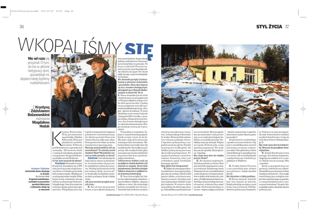 610str56stylzycia:edek 2011-07-20 14:54 Page 56 STYL ŻYCIA 57 56 Nie od razu się przyznał. O tym, że ma w głowie nietypowy dom, powiedział mi, dopiero kiedy byliśmy małżeństwem Z Krystyną i Zdzisławem Bolanowskimi rozmawia Magdalena Hodak Krystyna i Zdzisław, właściciele domu ukrytego w skarpie. Na stronie obok: Fragment południowo-zachodni w przyszłości porośnie bluszczem i całkowicie wtopi się w otoczenie K rystyna Bolanowska, 55 lat, jest emerytowaną polonistką. Zdzisław Bolanowski, 69 lat, jest plastykiem i architektem wnętrz. W Brzeziu pod Bełchatowem zaprojektował ziemiankę – 220-metrowy obiekt z częścią do mieszkania, gospodarczą i garażami. Swoją trzyhektarową działkę nazwali Bolanowo. Co też wam przyszło do głowy? Krystyna Ziemiankę wymyślił mój mąż. Poznaliśmy się w 1997 roku przez kuzynkę mojej bratowej, która w Gdańsku prowadziła biuro matrymonialne. Mieliśmy już za sobą poprzednie związki. Bolan był już wtedy owładnięty obsesją budowy podziemnego królestwa. I dopiął swego. Nasz dom mieści się wewnątrz skarpy położonej w gęstym lesie. Wkopaliśmy się w nią. Z górki wystaje jedynie fragment południowo-zachodniej ściany, ale wkrótce porośnie bluszczem i będą widoczne tylko same okna. Domu prawie nie widać, na dachu rosną krzewy i spacerują sarny. Dlaczego postanowiliście tak się zamaskować? To ucieczka przed światem? Bunt? Nie jesteście czasem na takie pomysły za starzy? Zdzisław Jest taka kategoria ludzi, którzy zawsze są zbuntowani. Ja zbuntowałem się przeciwko architekturze, która się wywyższa. Według niej budynek wtedy jest ciekawy, kiedy „wycina się” ze środowiska. Im bardziej czerwony dach, tym lepszy. Bo go z daleka widać. Jak pana pomysł przyjęła przyszła żona… K. Nie od razu się przyznał. O tym, że ma w głowie nietypowy dom, powiedział mi, dopiero kiedy byliśmy małżeństwem. Rozmowy na ten temat były, i to poważne. No bo po co taki dom? Przecież wystarczy prosty, typu kanadyjczyk. Ale Zdzichu się uparł. Nie chciał nigdy niczego, co już wcześniej było wymyślone. Ale ziemianki już były! Zamieszkiwały je plemiona słowiańskie i germańskie. Wasz dom kojarzy się też z trendem ekologicznym, jaki pojawił się w Stanach Zjednoczonych w latach 60. XX w. Z. Nasza ziemianka tym się różni od plemiennej czy propagowanej w USA przez hipisów, że łączy w sobie dwie sprzeczne idee. Z jednej strony pragnienie ucieczki i prowadzenie jaskiniowego życia, z drugiej – dążenie do luksusu. W ziemi ukryliśmy nowoczesny budynek z lampami LED w środku, z pompą cieplną, rekuperatorem powietrza. Jest domem ekologicznym i w założeniu ekonomicznym. Drogie instalacje zwrócą się w przyszłości. Przepadam za wygodami. Żyjemy w czasach konsumpcyjnych. Każdy czerpie z życia, ile się da. Dla mnie z tego życia zawsze najważniejsze było mieszkanie. Wybudowaliśmy niezwykły dom dla zwykłych ludzi. Niezwykły, bo podziemny. Dla zwykłych ludzi, gdyż za tę samą cenę można wybudować na powierzchni dom o porównywalnym komforcie. Tolkienowscy hobbici czuli się szczęśliwi w swoich domkach i też stawiali na wygodę. Simon Dale zainspirowany atmosferą książek Tolkiena stworzył w walijskim lesie baśniową konstrukcję. Z. Nasz dom mógłby być faktycznie takim bardziej rozbudowanym domkiem z Tolkiena – skrytym całkiem w ziemi. Ale technologia budowy musiałaby być droższa. Trzeba by było budować na siatce wysokieobcasy.pl + 19 LUTEGO 2011 + Wysokie Obcasy FOT. TOMASZ STAŃCZAK WKOPALIŚMY SIĘ stalowej natryskiwanej cementem. Izolacja takiego lokum byłaby trudna. Można też było zastosować schemat polskiego dworu. Z wjazdem z jednej strony, a wyjazdem na stronę ogrodu. Powstałby przejazd w środku górki. Ale działka z jednej strony jest za wąska na takie przedsięwzięcie. Pomysł po konsultacji z moim bratankiem Tomaszem, który jest architektem, upadł. Trzeba było koncepcję uprościć. Były jakieś inne kompromisy? K. Bałam się otwartej przestrzeni wokół domu. Jest nieprzytulnie, jak wiatr się rozhula. Zdzichu lubił patrzeć daleko, aż do horyzontu. Stanęło na moim. Chciałam mieć dom otulony lasem. Siedzieć w nim jak w kokonie. W sumie to chyba nauczyliśmy się chcieć tego samego. Zmienialiśmy sposób patrzenia na rzeczywistość. Skoro ja zgodziłam się zamieszkać z nim pod ziemią, to on zaakceptował gęsty las. Ważne, że na działce jest staw. Zrobiliśmy sztuczny strumyk. Wspina się i opada. Dotlenia ryby, a nam sprawia przyjemność. Bez wody bym się nie zgodziła. Płynie jak życie. Uspokaja. Bez czego wasz dom nie mógłby jeszcze istnieć? K. Bez kamieni węgielnych. Zdzichu pochodzi ze Lwowa. Brat przywiózł dla niego kamień z miejsca urodzenia. Rodzinnego domu Bolana już nie ma. Lwowski kamień został zatopiony w fundamentach. Jest w słoiku obok buteleczki z tekstem: „Po kilkudziesięciu latach wędrówki po świecie buduję dom moich marzeń, w którym chcę osiąść na stałe. Niech ten pochodzący ze Lwowa – miejsca mojego urodzenia Wysokie Obcasy + 19 LUTEGO 2011 + wysokieobcasy.pl – kamień, zamurowany w jego fundamentach, będzie klamrą spinającą mój los”. Drugi kamień wydobyliśmy z piasku na terenie budowy. Najpierw zawisł kilkanaście metrów nad ziemią, na starym, rozłożystym dębie. Strzegł budowy. Potem umieściliśmy go w specjalnej wnęce w murze. Ale wcześniej kamień został poświęcony w kościele parafialnym w Wadlewie. ? K. To takie dziwne? Przecież o nas powiedział pani właśnie nasz proboszcz – ksiądz Jarosław Burski. Nie słyszałam o takiej praktyce. Z. Dom to świętość. Zawieźliśmy więc kamień do kościoła. Ksiądz położył go na ołtarzu, a pod koniec mszy poświęcił. Pobłogosławił też potem nasze fundamen- ty. Proboszcz to nam się naprawdę udał. Jestem bardzo wrażliwy na jakość katolicyzmu. Czuję si