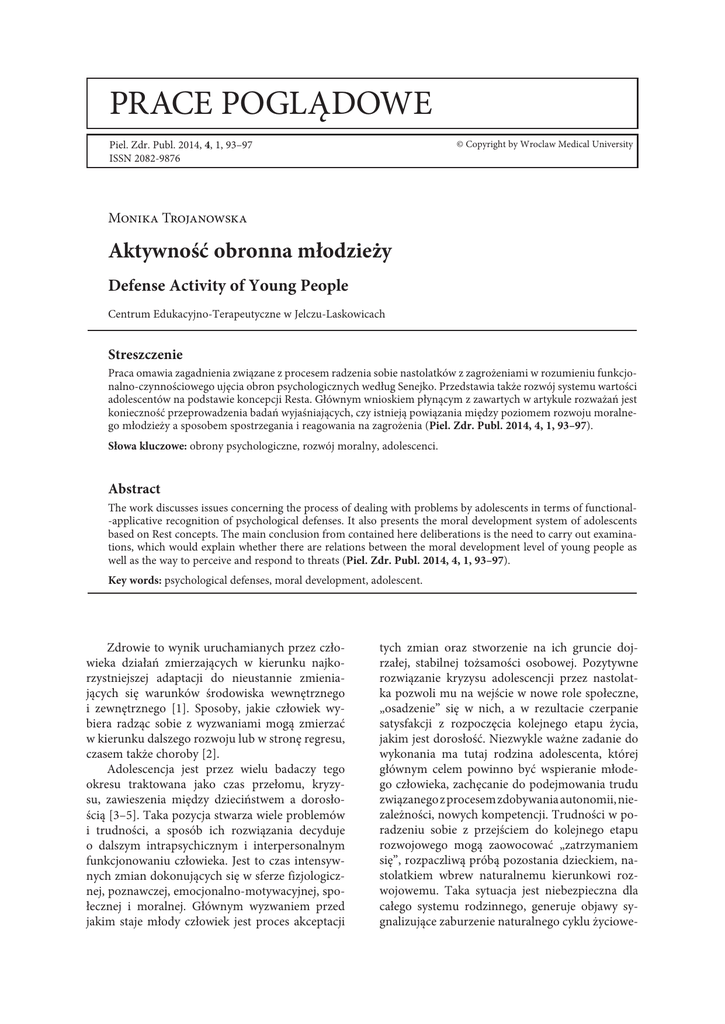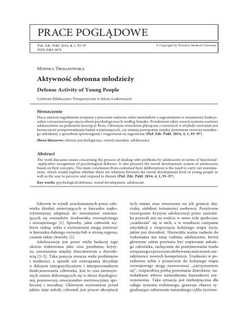 PRACE POGLĄDOWE Piel. Zdr. Publ. 2014, 4, 1, 93–97 ISSN 2082-9876 © Copyright by Wroclaw Medical University Monika Trojanowska Aktywność obronna młodzieży Defense Activity of Young People Centrum Edukacyjno-Terapeutyczne w Jelczu-Laskowicach Streszczenie Praca omawia zagadnienia związane z procesem radzenia sobie nastolatków z zagrożeniami w rozumieniu funkcjonalno-czynnościowego ujęcia obron psychologicznych według Senejko. Przedstawia także rozwój systemu wartości adolescentów na podstawie koncepcji Resta. Głównym wnioskiem płynącym z zawartych w artykule rozważań jest konieczność przeprowadzenia badań wyjaśniających, czy istnieją powiązania między poziomem rozwoju moralnego młodzieży a sposobem spostrzegania i reagowania na zagrożenia (Piel. Zdr. Publ. 2014, 4, 1, 93–97). Słowa kluczowe: obrony psychologiczne, rozwój moralny, adolescenci. Abstract The work discusses issues concerning the process of dealing with problems by adolescents in terms of functional-applicative recognition of psychological defenses. It also presents the moral development system of adolescents based on Rest concepts. The main conclusion from contained here deliberations is the need to carry out examinations, which would explain whether there are relations between the moral development level of young people as well as the way to perceive and respond to threats (Piel. Zdr. Publ. 2014, 4, 1, 93–97). Key words: psychological defenses, moral development, adolescent. Zdrowie to wynik uruchamianych przez człowieka działań zmierzających w kierunku najkorzystniejszej adaptacji do nieustannie zmieniających się warunków środowiska wewnętrznego i zewnętrznego [1]. Sposoby, jakie człowiek wybiera radząc sobie z wyzwaniami mogą zmierzać w kierunku dalszego rozwoju lub w stronę regresu, czasem także choroby [2]. Adolescencja jest przez wielu badaczy tego okresu traktowana jako czas przełomu, kryzysu, zawieszenia między dzieciństwem a dorosłością [3–5]. Taka pozycja stwarza wiele problemów i trudności, a sposób ich rozwiązania decyduje o dalszym intrapsychicznym i interpersonalnym funkcjonowaniu człowieka. Jest to czas intensywnych zmian dokonujących się w sferze fizjologicznej, poznawczej, emocjonalno-motywacyjnej, społecznej i moralnej. Głównym wyzwaniem przed jakim staje młody człowiek jest proces akceptacji tych zmian oraz stworzenie na ich gruncie dojrzałej, stabilnej tożsamości osobowej. Pozytywne rozwiązanie kryzysu adolescencji przez nastolatka pozwoli mu na wejście w nowe role społeczne, „osadzenie” się w nich, a w rezultacie czerpanie satysfakcji z rozpoczęcia kolejnego etapu życia, jakim jest dorosłość. Niezwykle ważne zadanie do wykonania ma tutaj rodzina adolescenta, której głównym celem powinno być wspieranie młodego człowieka, zachęcanie do podejmowania trudu związanego z procesem zdobywania autonomii, niezależności, nowych kompetencji. Trudności w poradzeniu sobie z przejściem do kolejnego etapu rozwojowego mogą zaowocować „zatrzymaniem się”, rozpaczliwą próbą pozostania dzieckiem, nastolatkiem wbrew naturalnemu kierunkowi rozwojowemu. Taka sytuacja jest niebezpieczna dla całego systemu rodzinnego, generuje objawy sygnalizujące zaburzenie naturalnego cyklu życiowe- 94 M. Trojanowska go rodziny [5]. Stąd tak ważne staje się przyjrzenie w jaki sposób młodzi ludzie radzą sobie z zagrożeniami stojącymi na drodze do osiągania dorosłości. Funkcjonalno-czynnościowe ujęcie obron psychologicznych [6, 7] w szczegółowy sposób omawia sytuacje identyfikowane przez adolescentów jako zagrażające oraz działania obronne wykorzystywane w procesie radzenia sobie w sytuacji trudnej, stresującej. Nie bez znaczenia dla dalszego rozwoju jest system przekonań i wartości, jaki posiada młody człowiek. Światopogląd, filozofia życiowa, którą kieruje się podmiot dokonując różnych wyborów, koniecznych w procesie rozwoju, pozwala mieć przekonanie o słuszności podejmowanych działań i decyzji, jest podstawą do oceny zachowania swojego i innych, nadaje sens życiu, chroni przed zwątpieniem i rozpaczą [4]. W okresie adolescencji nadawanie znaczenia dziejącym się zmianom, poszukiwanie ich ważności i wartości jest jednym z wyzwań, jakie stoi przed młodzieżą. Ponadto Obuchowski [8] spoglądając szerzej – systemowo, pisze, że „Człowiek mimo swej wewnętrznej złożoności i unikalności jest bytem społecznym”, zatem istnienie i prawidłowe funkcjonowanie jednostki implikuje istnienie innych ludzi jako koniecznego warunku rozwoju. Normy postępowania i wzory zachowania postulowane w danym systemie społecznym są niezbędne do utrzymania jego spójności i wewnętrznej równowagi. W dalszej części artykułu autorka opisuje stadia rozwoju moralności według koncepcji Resta [9] jako jednego z podmiotowych uwarunkowań aktywności obronnej [1]. Celem pracy jest omówienie procesu radzenia sobie młodzieży z zagrożeniami w rozumieniu funkcjonalno-czynnościowego ujęcia obron psychologicznych oraz przedstawienie najważniejszych zmian dokonujących się w rozwoju systemu wartości nastolatków jako jednego z podmiotowych uwarunkowań aktywności obronnej [1]. Funkcjonalno-czynnościowe ujęcie obrony psychologicznej Funkcjonalno-czynnościowe ujęcie obrony psychologicznej według Senejko [6, 7] zakłada, że celem nadrzędnym, do którego dąży człowiek jest jego rozwój. W związku z powyższym podstawową funkcją aktywności obronnej jest wykonywanie takich działań, które będą sprzyjały radzeniu sobie w sytuacjach trudnych, zagrażających rozwojowi jednostki. Zagrożenie jest w tym przypadku rozumiane jako „zakłócenie (utrudnienie lub uniemożliwienie) najważniejszych dla podmiotu standardów regulacji, tj. czynników motywacyjnych (potrzeb, wartości, postaw itp.), pobudzających, ukierunkowujących i nadających istotne znaczenie aktywności człowieka