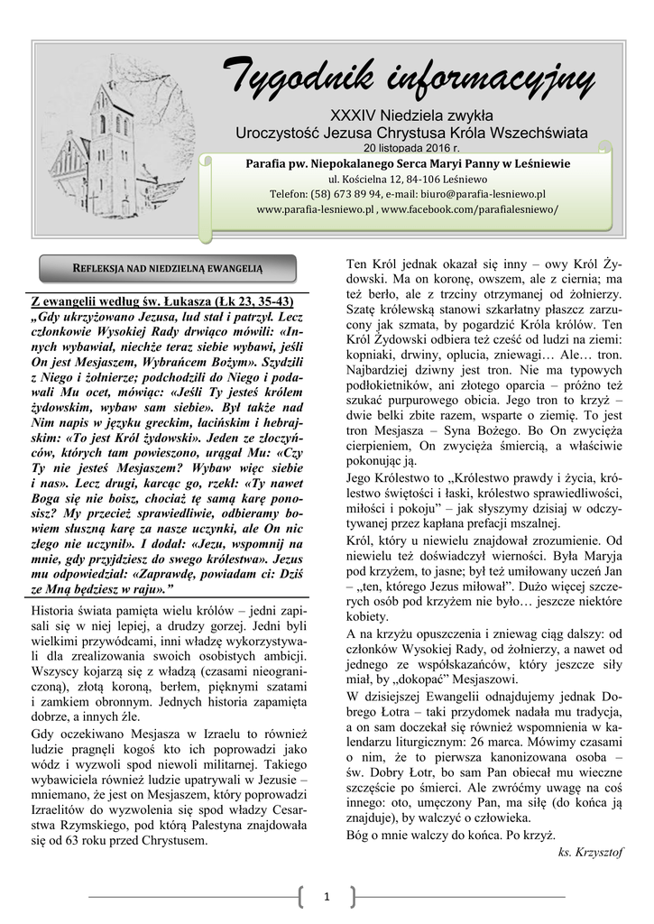 Tygodnik informacyjny XXXIV Niedziela zwykła Uroczystość Jezusa Chrystusa Króla Wszechświata 20 listopada 2016 r. Parafia pw. Niepokalanego Serca Maryi Panny w Leśniewie ul. Kościelna 12, 84-106 Leśniewo Telefon: (58) 673 89 94, e-mail: [email protected] www.parafia-lesniewo.pl , www.facebook.com/parafialesniewo/ Ten Król jednak okazał się inny – owy Król Żydowski. Ma on koronę, owszem, ale z ciernia; ma też berło, ale z trzciny otrzymanej od żołnierzy. Szatę królewską stanowi szkarłatny płaszcz zarzucony jak szmata, by pogardzić Króla królów. Ten Król Żydowski odbiera też cześć od ludzi na ziemi: kopniaki, drwiny, oplucia, zniewagi… Ale… tron. Najbardziej dziwny jest tron. Nie ma typowych podłokietników, ani złotego oparcia – próżno też szukać purpurowego obicia. Jego tron to krzyż – dwie belki zbite razem, wsparte o ziemię. To jest tron Mesjasza – Syna Bożego. Bo On zwycięża cierpieniem, On zwycięża śmiercią, a właściwie pokonując ją. Jego Królestwo to „Królestwo prawdy i życia, królestwo świętości i łaski, królestwo sprawiedliwości, miłości i pokoju” – jak słyszymy dzisiaj w odczytywanej przez kapłana prefacji mszalnej. Król, który u niewielu znajdował zrozumienie. Od niewielu też doświadczył wierności. Była Maryja pod krzyżem, to jasne; był też umiłowany uczeń Jan – „ten, którego Jezus miłował”. Dużo więcej szczerych osób pod krzyżem nie było… jeszcze niektóre kobiety. A na krzyżu opuszczenia i zniewag ciąg dalszy: od członków Wysokiej Rady, od żołnierzy, a nawet od jednego ze współskazańców, który jeszcze siły miał, by „dokopać” Mesjaszowi. W dzisiejszej Ewangelii odnajdujemy jednak Dobrego Łotra – taki przydomek nadała mu tradycja, a on sam doczekał się również wspomnienia w kalendarzu liturgicznym: 26 marca. Mówimy czasami o nim, że to pierwsza kanonizowana osoba – św. Dobry Łotr, bo sam Pan obiecał mu wieczne szczęście po śmierci. Ale zwróćmy uwagę na coś innego: oto, umęczony Pan, ma siłę (do końca ją znajduje), by walczyć o człowieka. Bóg o mnie walczy do końca. Po krzyż. ks. Krzysztof REFLEKSJA NAD NIEDZIELNĄ EWANGELIĄ Z ewangelii według św. Łukasza (Łk 23, 35-43) „Gdy ukrzyżowano Jezusa, lud stał i patrzył. Lecz członkowie Wysokiej Rady drwiąco mówili: «Innych wybawiał, niechże teraz siebie wybawi, jeśli On jest Mesjaszem, Wybrańcem Bożym». Szydzili z Niego i żołnierze; podchodzili do Niego i podawali Mu ocet, mówiąc: «Jeśli Ty jesteś królem żydowskim, wybaw sam siebie». Był także nad Nim napis w języku greckim, łacińskim i hebrajskim: «To jest Król żydowski». Jeden ze złoczyńców, których tam powieszono, urągał Mu: «Czy Ty nie jesteś Mesjaszem? Wybaw więc siebie i nas». Lecz drugi, karcąc go, rzekł: «Ty nawet Boga się nie boisz, chociaż tę samą karę ponosisz? My przecież sprawiedliwie, odbieramy bowiem słuszną karę za nasze uczynki, ale On nic złego nie uczynił». I dodał: «Jezu, wspomnij na mnie, gdy przyjdziesz do swego królestwa». Jezus mu odpowiedział: «Zaprawdę, powiadam ci: Dziś ze Mną będziesz w raju».” Historia świata pamięta wielu królów – jedni zapisali się w niej lepiej, a drudzy gorzej. Jedni byli wielkimi przywódcami, inni władzę wykorzystywali dla zrealizowania swoich osobistych ambicji. Wszyscy kojarzą się z władzą (czasami nieograniczoną), złotą koroną, berłem, pięknymi szatami i zamkiem obronnym. Jednych historia zapamięta dobrze, a innych źle. Gdy oczekiwano Mesjasza w Izraelu to również ludzie pragnęli kogoś kto ich poprowadzi jako wódz i wyzwoli spod niewoli militarnej. Takiego wybawiciela również ludzie upatrywali w Jezusie – mniemano, że jest on Mesjaszem, który poprowadzi Izraelitów do wyzwolenia się spod władzy Cesarstwa Rzymskiego, pod którą Palestyna znajdowała się od 63 roku przed Chrystusem. 1 OGŁOSZENIA PARAFIALNE INTENCJE MSZALNE 1. Przeżywamy dziś Uroczystość Chrystusa Króla Wszechświata. Zakończenie Roku Kościelnego i zakończenie Roku Miłosierdzia. Na zakończenie każdej Mszy św. odmawiać będziemy Jubileuszowy Akt Przyjęcia Jezusa Chrystusa za Króla i Pana. Przed kościołem zbiórka do puszek na budowę kościoła w Ostrowie. 2. Również dzisiaj rozpoczynamy Parafialną Peregrynację obrazu Pana Jezusa Miłosiernego. Kalendarium będzie dostępne w przyszłą niedzielę. Przez najbliższy tydzień zapraszamy do modlitwy przed obrazem w kościele. Nowennę pompejańską rozpoczniemy w przyszłą niedzielę odmawiając różaniec po mszach św. o g. 8.00, 9.30 i 11.00. Informacje o peregrynacji na naszej stronie internetowej. 3. Adoracja Najświętszego Sakramentu prowadzona przez Zespół muzyczny z rozważaniami o Bożym Miłosierdziu we wtorek o g. 19.30. Zapraszamy! 4. W środę po Mszy św. o 18.00 Nowenna do MB N. Pomocy. W tym tygodniu nie będzie środowego spotkania biblijnego. 5. W piątek o g. 19.00 spotkanie dla młodzieży w salce na plebanii. 6. Spotkanie Scholki dziecięcej w sobotę o g. 10.00, dla lektorów o g. 11.00, a dla wszystkich ministrantów o g. 11.30. 7. Sobota – o godz. 17.00 Msza św. z liturgią niedzielną. 8. Przyszła Niedziela jest I Niedzielą Adwentu – początek nowego roku kościelnego. 9. W zakrystii od przyszłej niedzieli będą do nabycia świece wigilijne: małe w cenie 6 złotych, duże 16 zł. 10. W przyszłą Niedzielę I Adwentu podczas Mszy św. o g. 8,00 pobłogosławimy opłatki wigilijne, które będą dostępne przez cały Adwent w zakrystii. 11. Wyniki Parafialnej Ligii Biblijnej są dostępne na stronie internetowej i na tablicy ogłoszeń. 12. Wypominki roczne możemy składać w zakrystii i w kancelarii parafialnej. 13. W przyszłą niedzielę będzie można nabyć naszą parafialną gazetkę "Echo Serca", w której również informacje i kalendarium naszej peregrynacji. poniedziałek Ofiarowan