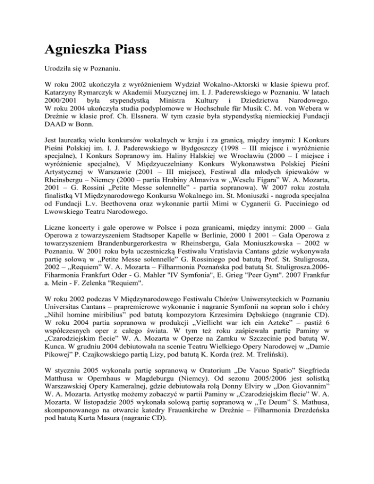 Agnieszka Piass Urodziła się w Poznaniu. W roku 2002 ukończyła z wyróżnieniem Wydział Wokalno-Aktorski w klasie śpiewu prof. Katarzyny Rymarczyk w Akademii Muzycznej im. I. J. Paderewskiego w Poznaniu. W latach 2000/2001 była stypendystką Ministra Kultury i Dziedzictwa Narodowego. W roku 2004 ukończyła studia podyplomowe w Hochschule für Musik C. M. von Webera w Dreźnie w klasie prof. Ch. Elssnera. W tym czasie była stypendystką niemieckiej Fundacji DAAD w Bonn. Jest laureatką wielu konkursów wokalnych w kraju i za granicą, między innymi: I Konkurs Pieśni Polskiej im. I. J. Paderewskiego w Bydgoszczy (1998 – III miejsce i wyróżnienie specjalne), I Konkurs Sopranowy im. Haliny Halskiej we Wrocławiu (2000 – I miejsce i wyróżnienie specjalne), V Międzyuczelniany Konkurs Wykonawstwa Polskiej Pieśni Artystycznej w Warszawie (2001 – III miejsce), Festiwal dla młodych śpiewaków w Rheinsbergu – Niemcy (2000 – partia Hrabiny Almaviva w „Weselu Figara” W. A. Mozarta, 2001 – G. Rossini „Petite Messe solennelle” - partia sopranowa). W 2007 roku została finalistką VI Międzynarodowego Konkursu Wokalnego im. St. Moniuszki - nagroda specjalna od Fundacji L.v. Beethovena oraz wykonanie partii Mimi w Cyganerii G. Pucciniego od Lwowskiego Teatru Narodowego. Liczne koncerty i gale operowe w Polsce i poza granicami, między innymi: 2000 – Gala Operowa z towarzyszeniem Stadtsoper Kapelle w Berlinie, 2000 1 2001 – Gala Operowa z towarzyszeniem Brandenburgerorkestra w Rheinsbergu, Gala Moniuszkowska – 2002 w Poznaniu. W 2001 roku była uczestniczką Festiwalu Vratislavia Cantans gdzie wykonywała partię solową w „Petite Messe solennelle” G. Rossiniego pod batutą Prof. St. Stuligrosza, 2002 – „Requiem” W. A. Mozarta – Filharmonia Poznańska pod batutą St. Stuligrosza.2006Fiharmonia Frankfurt Oder - G. Mahler "IV Symfonia", E. Grieg "Peer Gynt". 2007 Frankfur a. Mein - F. Zelenka "Requiem". W roku 2002 podczas V Międzynarodowego Festiwalu Chórów Uniwersyteckich w Poznaniu Universitas Cantans – prapremierowe wykonanie i nagranie Symfonii na sopran solo i chóry „Nihil homine miribilius” pod batutą kompozytora Krzesimira Dębskiego (nagranie CD). W roku 2004 partia sopranowa w produkcji „Viellicht war ich ein Azteke” – pastiż 6 współczesnych oper z całego świata. W tym też roku zaśpiewała partię Paminy w „Czarodziejskim flecie” W. A. Mozarta w Operze na Zamku w Szczecinie pod batutą W. Kunca. W grudniu 2004 debiutowała na scenie Teatru Wielkiego Opery Narodowej w „Damie Pikowej” P. Czajkowskiego partią Lizy, pod batutą K. Korda (reż. M. Treliński). W styczniu 2005 wykonała partię sopranową w Oratorium „De Vacuo Spatio” Siegfrieda Matthusa w Opernhaus w Magdeburgu (Niemcy). Od sezonu 2005/2006 jest solistką Warszawskiej Opery Kameralnej, gdzie debiutowała rolą Donny Elviry w „Don Giovannim” W. A. Mozarta. Artystkę możemy zobaczyć w partii Paminy w „Czarodziejskim flecie” W. A. Mozarta. W listopadzie 2005 wykonała solową partię sopranową w „Te Deum” S. Mathusa, skomponowanego na otwarcie katedry Frauenkirche w Dreźnie – Filharmonia Drezdeńska pod batutą Kurta Masura (nagranie CD). Od 2005 współpracuje z Symfonią Nova co owocuje licznymi koncertami na terenie Warszawy – „Stabat Mater” A. Dvorzaka (nagranie CD), „Msza Koronacyjna” W. A. Mozarta (Nagranie CD), „Requiem” W. A. Mozarta. Dokonała nagrania programu telewizyjnego "Europejskie Święta Bożego Narodzenia" w Babmerg z telewizją Monachium. 2005/2006 - współpraca z Filharmonią Frankfurt/Oder i Bonn – (IX Symfonia L. v Beethovena (pod batutą H. Beisela), IV Symfonia G. Mahlera, Peer Gynt E. Griega (pod batutą F. Bellon). Czerwiec 2006 - współpraca z Operą Narodową Teatrem Wielkim- Pamina w „Czarodziejskim Flecie” W. A. Mozarta (pod batutą K. Korda, reż. A. Freyer). Wystąpiła w serialu "Magda M." reż. M. Dejczer, gdzie zaśpiewała arię Cio-cio-san z "Madamy Butterfly" G. Pucciniego (2006). Od 2006 roku występuje jako solistka w Wieczorach: włoskim, francuskim i rosyjskim w Teatrze Buffo J. Józefowicza i J. Stokłosy w Warszawie. Od lutego 2007 współpracuje z Operą Bałtycką w Gdańsku gdzie śpiewa partię Mimi w "Cyganerii" G. Pucciniego pod batutą J.Przybylskiego. W październiku 2007 odbyła tournee po Holandii i Belgii z bydgoską Operą Nova występując jako Cio-cio-san w "Madamie Butterfly" G. Pucciniego. Śpiewa tę partię w Operze Nova i Teatrze Wielkim w Poznaniu. W 2008 roku debiutowała na scenie Teatru Wielkiego w Krakowie partią Lizy w „Damie Pikowej” P. Czajkowskiego (dyr.I.Sowińska,reż.K.Nazar). W październiku 2008 odbyła tournee po Holandii i Belgii jako Pamina w „Czarodziejskim flecie”W.A.Mozarta. Listopad 2008 debiut w Filharmonii Narodowej – „Stabat Mater”F.Poulenca (dyr.K.Urbański) Koncerty sylwestrowe i noworoczne w Polsce i wielu krajach Europy. Współpracuje z Filharmonią poznańską, szczecińską, gdańską, łomżyńską, sudecką oraz Frankfurt/Oder, Bonn, Drezno, Frankfurt a.Mein.